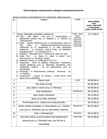 Harmonogram wykonywania zabiegów zwalczania komarów Wykaz terenów przewidzianych do wykonania odkomarzania : lp. miejsce 1 tereny dotknięte powodzią, zwłaszcza: a) Rogi – plac zabaw i rów przy ul. Sucharskiego, w sąsiedztwie posesji przy ul. Rajskiej 3, ul. Główna za Centrozłomem b) Koźle – ogrody działkowe przy ul. Konopnickiej, teren za PSP, rejon ul. Wiklinowa-Raciborska-Cmentarna, rozlewisko za ul. Raciborską 9, za byłą jednostką wojskową – ul. Przytulna, Synów Pułku, za Zakładem Energetycznym – ul. Łukasiewicza 47 c) Kłodnica – Młynówka od ul. Portowej do ujścia do Odry d) Koźle Port – ul. Jasna 11 „staw w parku” przy skrzyżowaniu ul. Portowej i Jasnej e) Żabieniec okolice ul. Goltberga 8-10-12-14 f) Pogorzelec – teren na zapleczu Castoramy i Kauflanda, ogrody działkowe przy ul. Gliwickiej, Kozielskiej, przy „niebieskim mostku” - AL. AK (obwodnica), przy ul. Odrzańskiej g) Kuźniczka – ul. Modrzewiowa, Jodłowa, Aroniowa, ok. rz. Kłodnicy, h) Lenartowice – wyjazd na Cisową, z lewej strony pod lasem-rów za domkami osiedle data zabiegu rano godz. 4.00-9.00 i wieczorem godz. 18.00-23.00 Koźle – Rogi, Koźle, Kłodnica, Koźle Port, Żabieniec, Kuźniczka, Pogorzelec 12-13.08.br. 2 Planty Koźle Koźle 06-08.08.br. 3 Plac Rady Europy „ 06-08.08.br. 4 plac zabaw i skwer przy ul. Filtrowej „ 06-08.08.br. 5 Park Pojednania Śródmieście 09-10.08.br. 6 park Orderu Uśmiechu „ 09-10.08.br. 7 skwer przy Placu Wolności „ 09-10.08.br. 8 Promenada od ul. Judyma do krytej pływalni „ 09-10.08.br. 9 tereny zielone pomiędzy ul. Wyzwolenia a ul. Tuwima Blachownia 09-10.08.br. oraz przy ul. Szkolnej wraz ze zbiornikiem wodnym 10 Park w Sławięcicach Sławięcice 09-10.08.br. 11 zbiorniki wodne za Schroniskiem dla bezdomnych Pogorzelec 09-10.08.br. zwierząt przy ul. Gliwickiej oraz rów RD do ul. Odrzańskiej 12 stawy i cieki wodne na os. Kłodnica Kłodnica 11-12.08.br. „ 11-12.08.br /wjazd od ul. Gminnej/ 13 Kanał Kłodnicki od ujścia do Odry do lasu na Żabieńcu 14 inne, zgłoszone przez mieszkańców: 06-07.08.br. lub a) Azoty – plac zabaw, staw za hotelem „Centralny” 13-14.08.br. b) os. Leśna - okolice Przychodni, przedszkola i placu zabaw c) Kłodnica – Plac Wagnera wraz z placem zabaw d) inne podpisał Kierownik Wydziału Ochrony Środowiska i Infrastruktury Jan Kwiczak