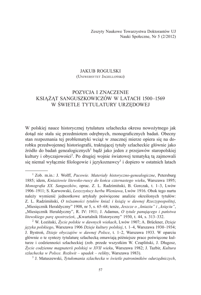 Zeszyty Naukowe Towarzystwa Doktorantów UJ Nauki Społeczne, Nr 5 (2/2012) Jakub Rogulski (Uniwersytet Jagielloński) Pozycja i znaczenie książąt Sanguszkowiczów w latach 1500–1569 w świetle tytulatury urzędowej W polskiej nauce historycznej tytulatura szlachecka okresu nowożytnego jak dotąd nie stała się przedmiotem odrębnych, monograficznych badań. Obecny stan rozpoznania tej problematyki wciąż w znacznej mierze opiera się na dorobku przedwojennej historiografii, traktującej tytuły szlacheckie głównie jako źródło do badań genealogicznych1 bądź jako jeden z przejawów staropolskiej kultury i obyczajowości2. Po drugiej wojnie światowej tematyką tą zajmowali się niemal wyłącznie filologowie i językoznawcy3 i dopiero w ostatnich latach Zob. m.in.: J. Wolff, Pacowie. Materiały historyczno-genealogiczne, Petersburg 1885; idem, Kniaziowie litewsko-ruscy do końca czternastego wieku, Warszawa 1895; Monografia XX. Sanguszków, oprac. Z. L. Radzimiński, B. Gorczak, t. 1–3, Lwów 1906–1911; S. Karwowski, Leszczyńscy herbu Wieniawa, Lwów 1916. Obok tego nurtu należy wymienić jednostkowe artykuły poświęcone analizie określonych tytułów: Z. L. Radzimiński, O tożsamości tytułów kniaź i książę w dawnej Rzeczypospolitej, „Miesięcznik Heraldyczny” 1908, nr 5, s. 65–68; tenże, Jeszcze o „kniaziu” i „księciu”, „Miesięcznik Heraldyczny”, R. IV: 1911; J. Adamus, O tytule panującego i państwa litewskiego parę spostrzeżeń, „Kwartalnik Historyczny” 1930, t. 44, s. 313–332. 2 W. Łoziński, Życie polskie w dawnych wiekach, Lwów 1907; A. Brückner, Dzieje języka polskiego, Warszawa 1906 Dzieje kultury polskiej, t. 1–4, Warszawa 1930–1934; J. Bystroń, Dzieje obyczajów w dawnej Polsce, t. 1–2, Warszawa 1933. W oparciu głównie o te syntezy tytulaturę szlachecką omawiają późniejsze prace poświęcone kulturze i codzienności szlacheckiej (zob. przede wszystkim W. Czapliński, J. Długosz, Życie codzienne magnaterii polskiej w XVII wieku, Warszawa 1982; J. Tazbir, Kultura szlachecka w Polsce. Rozkwit – upadek – relikty, Warszawa 1983). 3 J. Matuszewski, Tytułomania szlachecka w świetle patronimików odurzędniczych, 1 57 Jakub Rogulski tytuły szlacheckie stają się ponownie zagadnieniem, któremu badacze szlachty polsko-litewskiej przyznają coraz większe znaczenie4. Pomimo to potencjał badawczy, jaki kryje się w odpowiedniej analizie i interpretacji nowożytnej tytulatury szlacheckiej, wciąż pozostaje wykorzystany w znikomym stopniu. Interesujące i niewątpliwie cenne próby rozpoznania formalno-prawnych uwarunkowań oraz funkcji społecznych i propagandowych tytulatury rodowej, jakie w ostatnim czasie pojawiły się w literaturze, w większym stopniu stanowią zachętę do dalszych monograficznych studiów, aniżeli zaspokajają potrzeby badawcze w tym zakresie. W tytulaturze urzędowej dotychczasowa historiografia doszukiwała się głównie najbardziej reprezentatywnych przykładów „tytułomanii” – zjawiska tak typowego dla mentalności szlacheckiej doby przedrozbiorowej. Tym jednokierunkowym zainteresowaniem tytułami urzędowymi należy tłumaczyć fakt, że nie podjęto dotąd próby wnikliwego spojrzenia na te tytuły jako na miernik pozycji i znaczenia politycznego nowożytnych rodzin szlacheckich. A przecież tego rodzaju tytulatura, jako precyzyjne odzwierciedlenie urzędów sprawowanych przez przedstawicieli danej rodziny, stanowiła podstawowy i bardzo łatwy w eksponowaniu nośnik treści określających zasięg wpływów politycznych w dawnej Rzeczpospolitej. Tytuł urzędowy stanowił tytularną ekspozycję określonych kompetencji wynikających z faktu sprawowania danego urzędu. Treści cz. 1–2, „Rozprawy Komisji Językowej Łódzkiego Towarzystwa Naukowego” 1970, nr 15, s. 237–271; 1970, nr 16, s. 157–190; K. Mroczek, Tytulatura w korespondencji staropolskiej jako problem stosunku między nadawcą a odbiorcą, „Pamiętnik Literacki” 1978, nr 69, s. 129–135; H. Wiśniewska, Tytulatura Sebastiana Fabiana Klonowica (1545–1602), „Język Polski” 1982, nr 62, s. 7–9; E. Umińska-Tytoń, Formuły grzecznościowe w XVIII–wiecznych diariuszach, „Rozprawy Komisji Językowej Łódzkiego Towarzystwa Naukowego” 1992, nr 37, s. 139–144; M. Cybulski, Tytulatura w wybranych pamiętnikach polskich z XVI–XVIII w., [w:] Ad perpetuam rei memoriam. Profesorowi Wojciechowi Ryszardowi Rzepce z okazji 65. urodzin, red. J. Migdał, Poznań 2005, s. 87–95; idem, Ewolucja tytulatury w wybranych tekstach urzędowych z XVI– XVIII w., [w:] In tempore belli et pacis. Ludzie – Miejsca – Przedmioty. Księga pamiątkowa dedykowana prof. dr. hab. Janowi Szymczakowi w 65-lecie urodzin i 40-lecie pracy naukowo-dydaktycznej, red. T. Grabarczyk, A. Kowalska-Pietrzak, T. Nowak, Warszawa 2011, s. 551–560. 4 Przede wszystkim S. Górzyński, Rodzina Radziwiłłów i ich tytuły, „Miscelanea Historico-Archivistica” 1997, t. VII, s. 19–26; idem, Tytuły w dawnej Rzeczypospolitej i obecnie – praktyka i prawo, „Rocznik Polskiego Towarzystwa Heraldycznego” 2008, t. XVIII, s. 115–132; W. Strzyżewski, Herby i tytuły. Pieczęć szlachecka w księstwie głogowskim (XVI–XVIII wiek), Warszawa 2010; M. Antoniewicz, Protoplaści książąt Radziwiłłów. Dzieje mitu i meandry historiografii, Warszawa 2011; T. Bernatowicz, Mitra i buława. Królewskie ambicje książąt w sztuce Rzeczypospolitej szlacheckiej (1697–1763), Warszawa 2011, s. 77–89. 58 Pozycja i znaczenie książąt Sanguszkowiczów... eksponowane przez takie tytuły nie były jednak wyłącznie prostą pochodną znaczenia, jaki dany urząd odgrywał w administracji państwowej. Istotne znaczenie posiadał prestiż tytułu, który nie musiał pokrywać się z odpowiednio dużym zakresem obowiązków urzędowych. I tak jak znaczący udział w zarządzie państwa, szczególnie na niższych szczeb