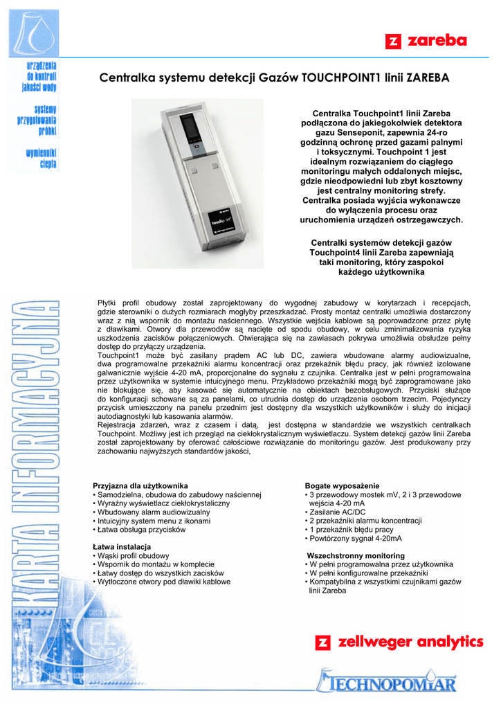 Centralka systemu detekcji Gazów TOUCHPOINT1 linii ZAREBA Centralka Touchpoint1 linii Zareba podłączona do jakiegokolwiek detektora gazu Senseponit, zapewnia 24-ro godzinną ochronę przed gazami palnymi i toksycznymi. Touchpoint 1 jest idealnym rozwiązaniem do ciągłego monitoringu małych oddalonych miejsc, gdzie nieodpowiedni lub zbyt kosztowny jest centralny monitoring strefy. Centralka posiada wyjścia wykonawcze do wyłączenia procesu oraz uruchomienia urządzeń ostrzegawczych. Centralki systemów detekcji gazów Touchpoint4 linii Zareba zapewniają taki monitoring, który zaspokoi każdego użytkownika Płytki profil obudowy został zaprojektowany do wygodnej zabudowy w korytarzach i recepcjach, gdzie sterowniki o dużych rozmiarach mogłyby przeszkadzać. Prosty montaż centralki umożliwia dostarczony wraz z nią wspornik do montażu naściennego. Wszystkie wejścia kablowe są poprowadzone przez płytę z dławikami. Otwory dla przewodów są nacięte od spodu obudowy, w celu zminimalizowania ryzyka uszkodzenia zacisków połączeniowych. Otwierająca się na zawiasach pokrywa umożliwia obsłudze pełny dostęp do przyłączy urządzenia. Touchpoint1 może być zasilany prądem AC lub DC, zawiera wbudowane alarmy audiowizualne, dwa programowalne przekaźniki alarmu koncentracji oraz przekaźnik błędu pracy, jak również izolowane galwanicznie wyjście 4-20 mA, proporcjonalne do sygnału z czujnika. Centralka jest w pełni programowalna przez użytkownika w systemie intuicyjnego menu. Przykładowo przekaźniki mogą być zaprogramowane jako nie blokujące się, aby kasować się automatycznie na obiektach bezobsługowych. Przyciski służące do konfiguracji schowane są za panelami, co utrudnia dostęp do urządzenia osobom trzecim. Pojedynczy przycisk umieszczony na panelu przednim jest dostępny dla wszystkich użytkowników i służy do inicjacji autodiagnostyki lub kasowania alarmów. Rejestracja zdarzeń, wraz z czasem i datą, jest dostępna w standardzie we wszystkich centralkach Touchpoint. Możliwy jest ich przegląd na ciekłokrystalicznym wyświetlaczu. System detekcji gazów linii Zareba został zaprojektowany by oferować całościowe rozwiązanie do monitoringu gazów. Jest produkowany przy zachowaniu najwyższych standardów jakości, Przyjazna dla użytkownika • Samodzielna, obudowa do zabudowy naściennej • Wyraźny wyświetlacz ciekłokrystaliczny • Wbudowany alarm audiowizualny • Intuicyjny system menu z ikonami • Łatwa obsługa przycisków Łatwa instalacja • Wąski profil obudowy • Wspornik do montażu w komplecie • Łatwy dostęp do wszystkich zacisków • Wytłoczone otwory pod dławiki kablowe Bogate wyposażenie • 3 przewodowy mostek mV, 2 i 3 przewodowe wejścia 4-20 mA • Zasilanie AC/DC • 2 przekaźniki alarmu koncentracji • 1 przekaźnik błędu pracy • Powtórzony sygnał 4-20mA Wszechstronny monitoring • W pełni programowalna przez użytkownika • W pełni konfigurowalne przekaźniki • Kompatybilna z wszystkimi czujnikami gazów linii Zareba Parametry techniczne Przeznaczenie Interfejs użytkownika Sterowanie Wyświetlacz ciekłokrystaliczny Inne wskaźniki Alarm akustyczny Zaciski Środowisko pracy Obudowa Masa Parametry otoczenia Przechowywanie Wejścia Zasilanie Typ czujnika Zasilanie czujnika Wyjścia Przekaźniki Ustawienia domyślne Opcje konfiguracji alarmów ul. Buforowa 4C, 52-131 Wrocław Jednokanałowa centralka do montażu naściennego, wyświetla wskazanie koncentracji gazów pochodzące od szerokiej gamy czujników Sensepoint linii Zareba. Jest przeznaczona do niewielkich instalacji wewnątrz budynku, wymagających niezależnej detekcji gazów i systemu kontroli. Pojedynczy przycisk Test / Akcept / Reset. Trzy kolejne przyciski do konfiguracji systemu ukryte za panelem przednim. Rodzaj gazu, zakres pomiarowy, mierzona wielkość w formacie cyfrowym i paskowym, wskaźnik stanu systemu i alarmów, status zasilania. Jaskrawe diody LED: alarmu (czerwona), zasilania (zielona), błędu pracy (bursztynowa) 85 dBA z 1m, możliwość wyciszenia, aktywowany ponownie przy następnym zdarzeniu Dostęp poprzez otwieraną przednią pokrywę. Na spodzie urządzenia znajdują się nacięcia 2 2 dla dławików kablowych. Zaciski śrubowe dla przewodów od 0,5mm do 2,5mm . Zalecane styki zgniatane Do zabudowy w pomieszczeniach, IP 44, zgodnie z EN60529:1992 2.5 kg Temperatura -10°C do +40°C Wilgotność 10-90% wilgotności względnej (bez kondensacji) Ciśnienie 90-110 kPa -40°C do +80°C, 20 do 80% wilgotności względnej 85-265VAC, 50/60Hz,18-30VDC, moc maksymalna 60W 3-żyłowy, mostek mV 2-żyłowy, zasilana pętla np. Senspoint gazy palne prądowa 4-20 mA np. Senspoint gazy toksyczne i detektory tlenu 3-żyłowy, 4-20mA, wyjście typu „Source” np. Senspoint Plus i Senspoint Pro na gazy palne, toksyczne i detektory tlenu Wejście: mostek mV, stały prąd: 200mA Samoregulujące się napięcie zasilania w zależności od oporu przewodu. Maksymalny obór pętli: 18 Ohm Wejście: mA. Max. prąd zasilający czujnik: 500 mA. Min. napięcie gwarantowane z centralki: 18 VDC. Impedancja wejściowa: 250 Ohm Alarm zbiorczy 1 (A1) SPCO, 3A, 240VAC, bezpotencjałowe Blokujący się Normalnie nie zasilony Pobudzany przez każdy A1 Ustawiony fabrycznie na 20% pełnej skali. Blokujący się/nie blokujący się Zasilany/nie zasilany Narastanie/Opadanie (O2) Punkt przełączania 10-90% pełnej skali Alarm zbiorczy 2 (A2) SPCO, 3A, 240VAC, bezpotencjałowe Blokujący się Normalnie nie zasilony Pobudzany przez każdy A2 Ustawiony fabrycznie na 40% pełnej skali Blokujący się/nie blokujący się Zasilany/nie zasilany Narastanie/Opadanie (O2) Punkt przełączania 10-90% pełnej skali tel. +4871 332 98 00, faks +4871 332 98 30 www.technopomiar.pl; [email protected] Błąd pracy systemu (F) SPCO, 3A, 240VAC, bezpotencjałowe Blokujący się Normalnie zasilony Nie zasilony przy błędzie pracy /utracie zasilania Blokuj