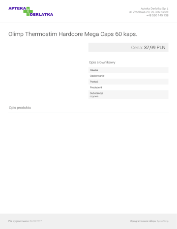 Apteka Derlatka Sp. j. Ul. Źródłowa 20, 25-335 Kielce +48 530 145 138 Olimp Thermostim Hardcore Mega Caps 60 kaps. Cena: 37,99 PLN Opis słownikowy Dawka Opakowanie Postać Producent Substancja czynna Opis produktu Plik wygenerowano: 04-03-2017 Powered by TCPDF (www.tcpdf.org) Oprogramowanie sklepu: AptusShop