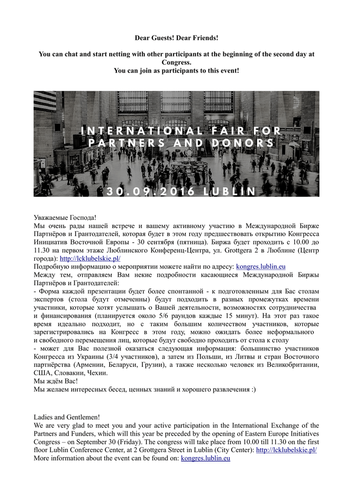 Dear Guests! Dear Friends! You can chat and start netting with other participants at the beginning of the second day at Congress. You can join as participants to this event! Уважаемые Господа! Мы очень рады нашей встрече и вашему активному участию в Международной Бирже Партнёров и Грантодателей, которая будет в этом году предшествовать открытию Конгресса Инициатив Восточной Европы - 30 сентября (пятница). Биржа будет проходить с 10.00 до 11.30 на первом этаже Люблинскогo Конференц-Центра, ул. Grottgera 2 в Люблине (Центр города): http://lcklubelskie.pl/ Подробную информацию о мероприятии можете найти по адресу: kongres.lublin.eu Между тем, отправляем Bам некие подробности касающиеся Международной Биржы Партнёров и Грантодателей: - Форма каждой презентации будет более спонтанной - к подготовленным для Бас столам экспертов (стола будут отмеченны) будут подходить в разных промежутках времени участники, которые хотят услышать о Bашей деятельности, возможностях сотрудничества и финансирования (планируется около 5/6 раундов каждые 15 минут). На этот раз такое время идеально подходит, но с таким большим количеством участников, которые зарегистрировались на Конгресс в этом году, можно ожидать более неформального и свободного перемещения лиц, которые будут свободно проходить от стола к столу - может для Bас полезной оказаться следующая информация: большинство участников Конгресса из Украины (3/4 участников), а затем из Польши, из Литвы и стран Восточного партнёрства (Армении, Беларуси, Грузии), а также несколько человек из Великобритании, США, Словакии, Чехии. Мы ждём Bас! Мы желаем интересных бесед, ценных знаний и хорошего развлечения :) Ladies and Gentlemen! We are very glad to meet you and your active participation in the International Exchange of the Partners and Funders, which will this year be preceded by the opening of Eastern Europe Initiatives Congress – on September 30 (Friday). The congress will take place from 10.00 till 11.30 on the first floor Lublin Conference Center, at 2 Grottgera Street in Lublin (City Center): http://lcklubelskie.pl/ More information about the event can be found on: kongres.lublin.eu Meanwhile, we will send you some details concerning the International Partners and Funders: - The shape of each presentation will be more spontaneous - the tables prepared for experts (the table will be marked) which will be approached in different intervals of time the participants who want to hear about your activities, cooperation and funding opportunities (planned about 5/6 rounds every 15 minutes). That time is perfect, because such a large number of participants have registered for the Congress this year, we can expect more informal and free movement of persons, who will pass freely from table to table. - The following information may be useful for you: the majority of the Congress participants from Ukraine (3/4 members), and from Poland, from Lithuania and the Eastern Partnership countries (Armenia, Belarus, Georgia), as well as some people from the UK, USA, Slovakia , the Czech Republic. We are waiting for you! We wish you interesting conversations, valuable knowledge and good fun :) Szanowni Państwo! Bardzo się cieszymy na spotkanie i Państwa aktywny udział w Międzynarodowej Giełdzie Partnerów i Grantodawców, która otworzy drugi dzień programu tegorocznego Kongresu Inicjatyw Europy Wschodniej 30 września (piątek). Giełda odbędzie się w godz. 10.00-11.30 na parterze Lubelskiego Centrum Konferencyjnego przy ul. Grottgera 2 w Lublinie (Śródmieście):http://lcklubelskie.pl/ Szczegóły całego wydarzenia znajdą Państwo na stronie: kongres.lublin.eu Tymczasem podsyłam szczegóły dotyczące naszej Międzynarodowej Giełdy Partnerów i Grantodawców: - forma poszczególnych prezentacji będzie bardziej żywiołowa - do przygotowanych dla Państwa stolików eksperckich (będą oznaczone) będą podchodzić w różnych odstępach czasowych (około 5/6 rundek co 15 minut) uczestnicy, którzy zechcą posłuchać o Państwa działaniach, możliwościach współpracy lub finansowania. Ten czas jest idealny, ale przy tak dużej liczbie uczestników, jaka zarejestrowała się na tegoroczny kongres, należy się liczyć z bardziej nieformalnym i swobodnym przepływem zaintersowanych osób, które będą mogły dowolnie przechodzić od stolika do stolika - być może pomocna dla Państwa informacja: na Kongres przybywa większość uczestników z Ukrainy (3/4 uczestników), dalej z Polski, Litwy, krajów Partnerstwa Wschodniego (Armenia, Białoruś, Gruzja) oraz nieliczne osoby z Wielkiej Brytanii, USA, Słowacji, Czech. Czekamy na państwa! Życzymy ciekawych rozmów, wartościowych znajomości oraz dobrej zabawy:) Z wyrazami szacuku, Biuro Kongresu Inicjatw Europy Wschodniej