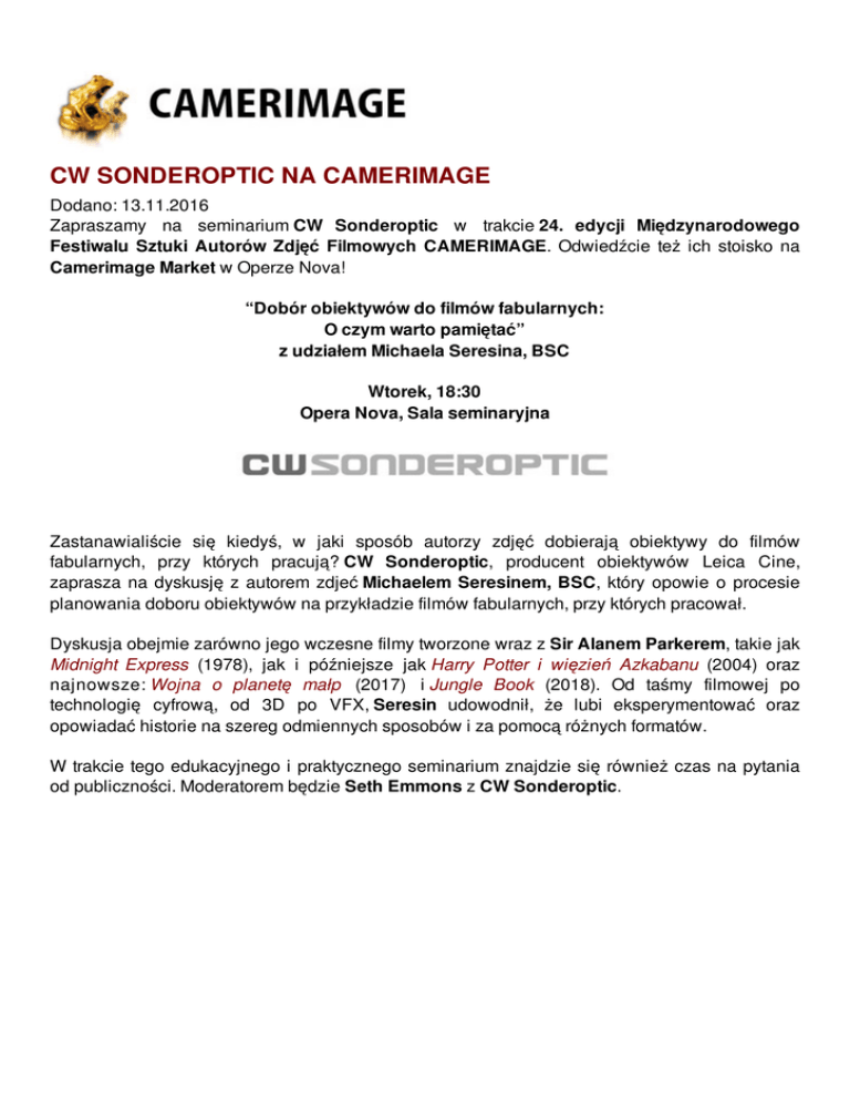 CW SONDEROPTIC NA CAMERIMAGE Dodano: 13.11.2016 Zapraszamy na seminarium CW Sonderoptic w trakcie 24. edycji Międzynarodowego Festiwalu Sztuki Autorów Zdjęć Filmowych CAMERIMAGE. Odwiedźcie też ich stoisko na Camerimage Market w Operze Nova! “Dobór obiektywów do filmów fabularnych: O czym warto pamiętać” z udziałem Michaela Seresina, BSC Wtorek, 18:30 Opera Nova, Sala seminaryjna Zastanawialiście się kiedyś, w jaki sposób autorzy zdjęć dobierają obiektywy do filmów fabularnych, przy których pracują? CW Sonderoptic, producent obiektywów Leica Cine, zaprasza na dyskusję z autorem zdjeć Michaelem Seresinem, BSC, który opowie o procesie planowania doboru obiektywów na przykładzie filmów fabularnych, przy których pracował. Dyskusja obejmie zarówno jego wczesne filmy tworzone wraz z Sir Alanem Parkerem, takie jak Midnight Express (1978), jak i późniejsze jak Harry Potter i więzień Azkabanu (2004) oraz najnowsze: Wojna o planetę małp (2017) i Jungle Book (2018). Od taśmy filmowej po technologię cyfrową, od 3D po VFX, Seresin udowodnił, że lubi eksperymentować oraz opowiadać historie na szereg odmiennych sposobów i za pomocą różnych formatów. W trakcie tego edukacyjnego i praktycznego seminarium znajdzie się również czas na pytania od publiczności. Moderatorem będzie Seth Emmons z CW Sonderoptic.