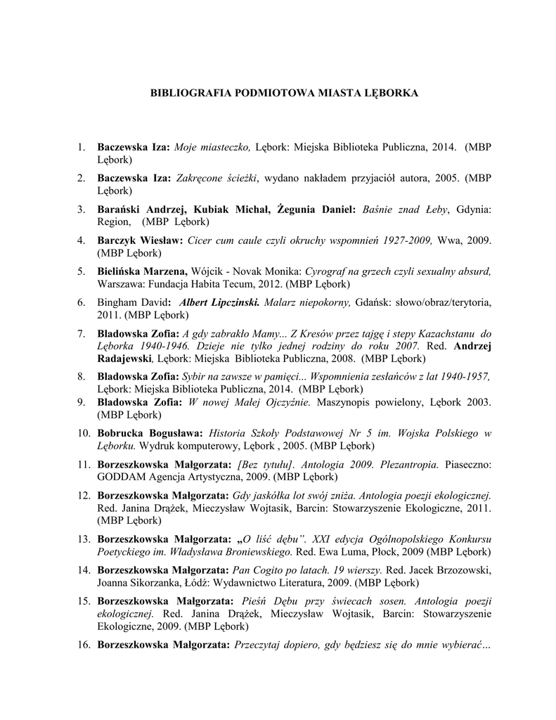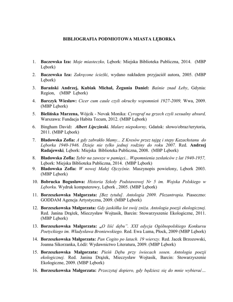 BIBLIOGRAFIA PODMIOTOWA MIASTA LĘBORKA 1. Baczewska Iza: Moje miasteczko, Lębork: Miejska Biblioteka Publiczna, 2014. (MBP Lębork) 2. Baczewska Iza: Zakręcone ścieżki, wydano nakładem przyjaciół autora, 2005. (MBP Lębork) 3. Barański Andrzej, Kubiak Michał, Żegunia Daniel: Baśnie znad Łeby, Gdynia: Region, (MBP Lębork) 4. Barczyk Wiesław: Cicer cum caule czyli okruchy wspomnień 1927-2009, Wwa, 2009. (MBP Lębork) 5. Bielińska Marzena, Wójcik - Novak Monika: Cyrograf na grzech czyli sexualny absurd, Warszawa: Fundacja Habita Tecum, 2012. (MBP Lębork) 6. Bingham David: Albert Lipczinski. Malarz niepokorny, Gdańsk: słowo/obraz/terytoria, 2011. (MBP Lębork) 7. Bladowska Zofia: A gdy zabrakło Mamy... Z Kresów przez tajgę i stepy Kazachstanu do Lęborka 1940-1946. Dzieje nie tylko jednej rodziny do roku 2007. Red. Andrzej Radajewski, Lębork: Miejska Biblioteka Publiczna, 2008. (MBP Lębork) 8. Bladowska Zofia: Sybir na zawsze w pamięci... Wspomnienia zesłańców z lat 1940-1957, Lębork: Miejska Biblioteka Publiczna, 2014. (MBP Lębork) Bladowska Zofia: W nowej Małej Ojczyźnie. Maszynopis powielony, Lębork 2003. (MBP Lębork) 9. 10. Bobrucka Bogusława: Historia Szkoły Podstawowej Nr 5 im. Wojska Polskiego w Lęborku. Wydruk komputerowy, Lębork , 2005. (MBP Lębork) 11. Borzeszkowska Małgorzata: [Bez tytułu]. Antologia 2009. Plezantropia. Piaseczno: GODDAM Agencja Artystyczna, 2009. (MBP Lębork) 12. Borzeszkowska Małgorzata: Gdy jaskółka lot swój zniża. Antologia poezji ekologicznej. Red. Janina Drążek, Mieczysław Wojtasik, Barcin: Stowarzyszenie Ekologiczne, 2011. (MBP Lębork) 13. Borzeszkowska Małgorzata: „O liść dębu”. XXI edycja Ogólnopolskiego Konkursu Poetyckiego im. Władysława Broniewskiego. Red. Ewa Luma, Płock, 2009 (MBP Lębork) 14. Borzeszkowska Małgorzata: Pan Cogito po latach. 19 wierszy. Red. Jacek Brzozowski, Joanna Sikorzanka, Łódź: Wydawnictwo Literatura, 2009. (MBP Lębork) 15. Borzeszkowska Małgorzata: Pieśń Dębu przy świecach sosen. Antologia poezji ekologicznej. Red. Janina Drążek, Mieczysław Wojtasik, Barcin: Stowarzyszenie Ekologiczne, 2009. (MBP Lębork) 16. Borzeszkowska Małgorzata: Przeczytaj dopiero, gdy będziesz się do mnie wybierać… 2 Listy poetyckie. Red. Jacek Brzozowski, Joanna Sikorzanka, Łódź: Wydawnictwo Literatura, 2010. (MBP Lębork) 17. Borzeszkowska Małgorzata: U bramy, Lębork: Miejska Biblioteka Publiczna, [2008]. (MBP Lębork) 18. Borzeszkowska Małgorzata: Z mojej litanii, Bestwina: Gminna Biblioteka Publiczna, 2008. (MBP Lębork) 19. Budkowski Wiesław, Mikusiński Przemysław, Stanisław Redzik: Błękitna kraina. Lębork, Łeba i Słowiński Park Narodowy. Przewodnik turystyczny. Red. Jarosław Ellwart, Gdynia: Region , 1998. (MBP Lębork) 20. Budkowski Wiesław, Przemysław Mikusiński: Lębork. Informator turystyczny. Red. Zofia Biskupska-Lisiecka, Lębork: Miejska Biblioteka Publiczna w Lęborku , 2000. (MBP Lębork) 21. Łeba i okolice. [Współautor Wiesław Budkowski], Gdynia: Kangur, 2004. (MBP Lębork) 22. Budkowski Wiesław, Przemysław Mikusiński: Ziemia Lęborska. Przewodnik turystyczny, Lębork: Miejska Biblioteka Publiczna, 2012. (MBP Lębork) 23. Budkowski Wiesław, Przemysław Mikusiński: Ziemia Lęborska. Lębork, Łeba, Słowiński Park Narodowy. Przewodnik turystyczny, Lębork: Miejska Biblioteka Publiczna w Lęborku , 2002. (MBP Lębork) 24. Bykowska Felicja: Ocalić od zapomnienia. Wspomnienia szkolne z lat 1945-1949. Maszynopis, [Lębork, 2003]. (MBP Lębork) 25. Bykowski Bolesław: Ocalić od zapomnienia. On ma być nauczycielem. Cząstka pracy w 47-leciu stażu. Maszynopis, [Lębork, 2003]. (MBP Lębork) 26. Album ziemi lęborskiej. Pod. red. Artura Stanisława Dubiela, Lębork: Wydaw. Morskie, 1986. (MBP Lębork) 27. Dubiel Artur Stanisław: Dawnych chwil czar, Słupsk: Artur S. Dubiel, 1997. (Biblioteka Narodowa) 28. Dubiel Artur Stanisław: Dolina Łeby, Lębork: Rejonowa Komisja Historyczna Ruchu Młodzieżowego Ziemi Lęborskiej, [1984]. (MBP Lębork) 29. Dubiel Artur Stanisław: Donata nad Bałtykiem i za Atlantykiem, Słupsk: Baltic, 1990. (Biblioteka Narodowa) 30. Dubiel Artur Stanisław: Ich droga na ziemie Waszyngtona, Słupsk: Baltic, 1991. (Biblioteka Narodowa) 31. Dubiel Artur Stanisław: Kolacja w Zamku Tara, Słupsk: Baltic, 1993. (Biblioteka Narodowa) 32. Dubiel Artur Stanisław: Lębork 1285-1945-1985 i okolice, Szczecin: Krajowa Agencja Wydawnicza, 1985. (MBP Lębork) 33. Dubiel Artur Stanisław: Miasteczko nad Szwedką, Warszawa: Stowarzyszenie PAX, 3 [1987]. (Biblioteka Narodowa) 34. Dubiel Artur Stanisław: Nad Atlantykiem Hudsonem i w Nowej Anglii. Miniatury literackie pisane w USA, Słupsk: Baltic, 1993. (Biblioteka Narodowa) 35. Dubiel Artur Stanisław: Nad chmurnym Bałtykiem, Słupsk: Baltic, 1990. (MBP Lębork) 36. Dubiel Artur Stanisław: Nancy i Arthur – Massachusetts, Słupsk: Baltic, 1991. (Biblioteka Narodowa) 37. Dubiel Artur Stanisław: Ogólnoświatowy Klub Pokoju w Białogardzie, Słupsk: Baltic, 1991. (Biblioteka Narodowa) 38. Dubiel Artur Stanisław: Opowiadania bałtyckie ; Zapiski tarnowskie, Słupsk: Baltic, 1991. (Biblioteka Narodowa) 39. Dubiel Artur Stanisław: Pod niebem Ameryki, Słupsk: Baltic, 1993. (Biblioteka Narodowa) 40. Dubiel Artur Stanisław: Pogórze Karpackie – Ryglice, Słupsk: Artur S. Dubiel, 1998. (Biblioteka Narodowa) 41. Dubiel Artur Stanisław: Sponad Łeby cichych fal, Słupsk: Baltic, 1991. (Biblioteka Narodowa) 42. Dubiel Artur Stanisław: Tarnowianie na ziemi Waszyngtona, Słupsk: Baltic, 1990. (Biblioteka Narodowa) 43. Dubiel Artur Stanisław: W barwach Podkarpacia, Słupsk: Polimat, 1993. (Biblioteka Narodowa) 44. Dubiel Artur Stanisław: W Bostonie, Pradze, Stambule, Wilnie i gdzie indziej ..., Słupsk: Baltic, 1991. (Biblioteka Narodowa) 45. Dubiel Artur Stanisław: W panoramie Podkarpacia, Słupsk: Baltic, 1991. (Biblioteka Narodowa) 46. Dubiel Artur Stanisław: Wacła