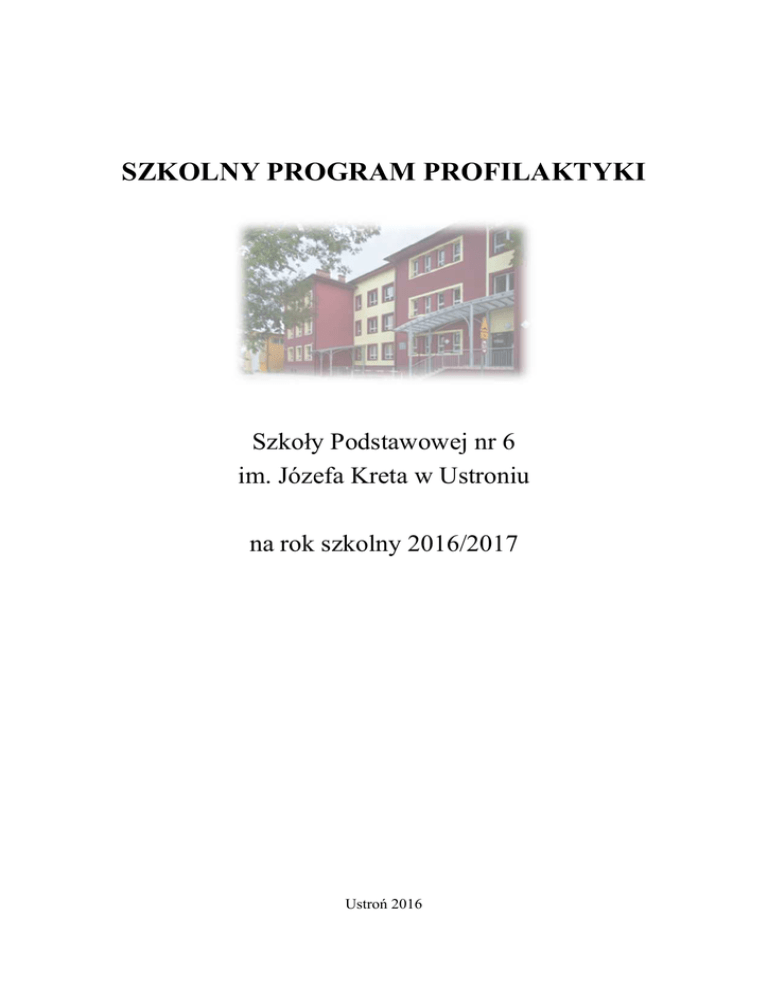 SZKOLNY PROGRAM PROFILAKTYKI Szkoły Podstawowej nr 6 im. Józefa Kreta w Ustroniu na rok szkolny 2016/2017 Ustroń 2016 2 Zagadnienia i cele ogólne szkolnego programu profilaktyki na rok szkolny 2016/2017. 1. Zdrowie 1.1. Odżywianie – wypracowanie umiejętności racjonalnego i zdrowego odżywiania się oraz kształtowanie prawidłowych nawyków żywieniowych. Cele szczegółowe: zasady prawidłowego odżywiania się, promowanie zdrowej żywności, uświadamianie o szkodliwości niektórych produktów żywieniowych, zmiana nawyków żywieniowych poprzez wzbogacenie diety o owoce i warzywa, omówienie skutków niewłaściwego odżywiania się ( tj. anoreksja, bulimia czy otyłość), kształtowanie umiejętności dobierania właściwych składników w codziennej diecie dziecka, wskazanie wpływu prawidłowej diety na rozwój fizyczny i psychiczny, promowanie spożywania wielu posiłków w ciągu dnia i zachęcanie do spożywania drugiego śniadania, profilaktyka chorób układu pokarmowego, wpływ niewłaściwej diety na wady postawy, zachowanie zasad higieny podczas spożywania posiłków, Sposoby realizacji : kontynuacja programu Trzymaj Formę , prezentacje klasowe np. przepis na zdrową kanapkę (oddziałach I-III tematyka realizowana w ramach zajęć zintegrowanych, zaś w klasach IVVI w ramach godzin z wychowawcą oraz happeningów), udział szkoły w programie „Mleko w szkole”, Oczekiwane rezultaty: spożywanie zdrowej żywności, poprawa samopoczucia, zmiana nawyków żywieniowych, świadomość skutków ubocznych wynikających z nieodpowiedniego odżywiania. 3 Osoby odpowiedzialne: wychowawcy klas, nauczyciel przyrody, techniki, opiekun SU. Termin realizacji: cały rok 1.2. Higiena i zdrowie- dbanie o czystość ciała i estetyczny wygląd. Cele szczegółowe: kształtowanie nawyków higieniczno-zdrowotnych, dostosowanie ubioru do panujących warunków atmosferycznych, przypomnienie elementarnych zasad higieny osobistej, niwelowanie wad postawy poprzez dobór odpowiednich ćwiczeń korekcyjnych, przypomnienie i omówienie zasad zapobiegania zakażenia wirusem grypy, Sposoby realizacji: sposoby zapobiegania zakażenia wirusem grypy omawiane będą w ramach zajęć zintegrowanych (klasy I-III), godzin wychowawczych ( klasy IV-VI) oraz podczas spotkań z rodzicami, pozostała tematyka będzie realizowana przez wychowawców klas oraz na zajęciach przyrody, Oczekiwane rezultaty: dbanie o higienę osobistą i czystą odzież, skrupulatne i systematyczne mycie rąk, chronienie innych przed zakażeniem wirusem grypy przez zasłanianie ust i nosa podczas kasłania i kichania, wietrzenie sal lekcyjnych, ubieranie się adekwatnie do panujących warunków pogodowych, racjonalne i odpowiednie zażywanie lekarstw wyłącznie za zgodą rodziców / prawnych opiekunów i zapoznanie się z treścią ulotki dołączonej do opakowania, dbanie o prawidłową postawę podczas siedzenia w ławce, przy stole podczas posiłku itp. 4 Osoby odpowiedzialne : wychowawcy klas, dyrektor szkoły, Termin realizacji: cały rok szkolny 1.3. Aktywny wypoczynek- zapewnienie aktywnego wypoczynku. Cele szczegółowe: umiejętności właściwego korzystania z czasu wolnego, aktywny wypoczynek, odpowiednie zagospodarowanie czasu wolnego i harmonogramu dnia, dobór różnorodnych form aktywności ruchowej , mającej na celu rozładowanie napięć i stresu, wzbudzanie i rozwijanie zainteresowań, wpływ ruchu i wysiłku fizycznego na zdrowie fizyczne i psychiczne człowieka, racjonalne korzystanie z telewizji czy Internetu, uświadomienie uczniom zagrożeń wynikających z nieumiejętnego korzystania z Internetu. Sposoby realizacji: promowanie aktywnego wypoczynku przez szkolne koło PTTK (piesze wędrówki, rajdy górskie, wyjazdy na narty), promowanie aktywnego spędzania czasu wolnego przez SKBS „ATUŚ” promowanie zdrowego stylu życia w ramach programu Trzymaj Formę, organizacja Dnia Sportu, Powiatowego Turnieju o Puchar Kreta, organizacja „Nocy w szkole” – zajęcia sportowe , organizacja „Turnieju Noworocznego” TS, organizacja wyjazdów na lodowisko, udział uczniów w turnieju koszykówki „Gramy bo lubimy”, udział uczniów w zawodach sportowych, uczestnictwo w turnieju orlika, turnieju tenisa stołowego o Puchar Burmistrza Miasta Ustroń, organizacja zajęć tanecznych i muzycznych („Mam Talent”, dyskoteki szkolne), realizacja tematyki odbywać się będzie również podczas zajęć rekreacyjno-sportowych , 5 zajęć komputerowych , zajęć turystycznych czy podczas spotkania z pedagog , dotyczącego zagrożeń wynikających z niewłaściwego korzystania z Internetu, przewidzianego dla klas VI. Oczekiwane rezultaty: uczniowie umiejętnie korzystają z wolnego czasu , aktywnie spędzają wolne chwile, potrafią umiejętnie rozładować napięcia i stres podczas korzystania z zajęć ruchowych, niwelowanie sytuacji konfliktów i problemów wychowawczych poprzez zaabsorbowanie uczniów aktywnym wypoczynkiem, lepsze samopoczucie uczniów poprzez spędzanie czasu na świeżym powietrzu. Osoby odpowiedzialne: nauczyciele, nauczyciel wychowania fizycznego. Termin realizacji : cały rok 2. Bezpieczeństwo 2 .1 Bezpieczeństwo w ruchu drogowym- działania zmierzające do propagowania zachowania zasad bezpieczeństwa podczas poruszania się po drodze Cele szczegółowe: znajomość zasad i przepisów poruszania się po jezdni jako pieszy czy rowerzysta, kształtowanie poczucia odpowiedzialności za zdrowie i życie własne i innych uczestników ruchu pieszego i rowerowego, zwiększenie bezpieczeństwa na drodze poprzez uświadamianie uczniom, że należy nosić elementy odblaskowe oraz zaleca się nosić kaski ochronne podczas jazdy na rolkach, rowerze, deskorolce, Sposoby realizacji: teoretyczne i praktyczne przygotowanie do uzyskania karty rowerowej, omówienie na lekcjach wychowawczych zasad bezpiecznego poruszania się na drodze do i ze szkoły, spotkanie z policjantem i prelekcja na temat