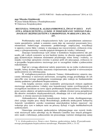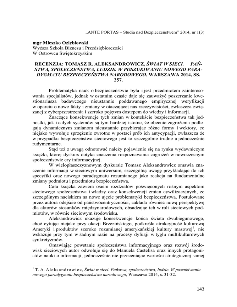 „ANTE PORTAS – Studia nad Bezpieczeństwem” 2014, nr 1(3) mgr Mieszko Oziębłowski Wyższa Szkoła Biznesu i Przedsiębiorczości W Ostrowcu Świętokrzyskim RECENZJA: TOMASZ R. ALEKSANDROWICZ, ŚWIAT W SIECI. PAŃSTWA, SPOŁECZEŃSTWA, LUDZIE. W POSZUKIWANIU NOWEGO PARADYGMATU BEZPIECZEŃSTWA NARODOWEGO, WARSZAWA 2014, SS. 257. Problematyka nauk o bezpieczeństwie była i jest przedmiotem zainteresowania specjalistów, jednak w ostatnim czasie daje się zauważyć poszerzanie kwestionariusza badawczego nieustannie poddawanego empirycznej weryfikacji w oparciu o nowe fakty i zmiany w otaczającej nas rzeczywistości, zwłaszcza związanej z cyberprzestrzenią i szeroko pojętym dostępem do wiedzy i informacji. Znaczące konsekwencje tych zmian w kontekście bezpieczeństwa tak jednostki, jak i całych systemów są tym bardziej istotne, że obecnie zagrożenia podlegają dynamicznym zmianom nieustannie przybierając różne formy i wektory, co niejako wywołuje sprzężenie zwrotne w postaci prób ich antycypacji, zwłaszcza że w przypadku bezpieczeństwa sieciowego jest to szczególnie trudne a jednocześnie rudymentarne. Stąd też z uwagą odnotować należy pojawienie się na rynku wydawniczym książki, której dyskurs dotyka znaczenia rozpoznawania zagrożeń w nowoczesnym społeczeństwie ery informacyjnej. W wielopłaszczyznowym dyskursie Tomasz Aleksandrowicz omawia znaczenie informacji w sieciowym uniwersum, szczególną uwagę przykładając do ich specyfiki oraz nowego paradygmatu rozumianego jako reakcja na fundamentalne zmiany podmiotu i przedmiotu bezpieczeństwa. Cała książka zawiera osiem rozdziałów poświęconych różnym aspektom sieciowego społeczeństwa i władzy oraz konsekwencji zmian cywilizacyjnych, ze szczególnym naciskiem na nowe ujęcie problematyki bezpieczeństwa. Postulowane przez autora odejście od państwocentryczności, zakłada również nową perspektywę dla aktorów stosunków międzynarodowych, obsadzając ich w roli sieciowych podmiotów, w równie sieciowym środowisku. Aleksandrowicz ukazuje konsekwencje końca świata dwubiegunowego, choć cytując niejako przy okazji Brzezińskiego, podkreśla atrakcyjność kulturową Ameryki i produktów szeroko rozumianej amerykańskiej kultury masowej1, nie wskazuje przy tym w żadnym razie na procesy dyfuzji w tyglu multikulturowych synkretyzmów. Omawiając powstanie społeczeństwa informacyjnego oraz rozwój środowisk sieciowych autor odwołuje się do Manuela Castellsa oraz innych protagonistów nauki o informacji, jednocześnie nie przeceniając wartości strategicznej samej 1 T. A. Al e ks a nd r o wi cz, Świat w sieci. Państwa, społeczeństwa, ludzie. W poszukiwaniu nowego paradygmatu bezpieczeństwa narodowego, Warszawa 2014, s. 31-32. 143 informacji w kontekście tzw. attentioncrash, czy Devil of Information Overload2. Z drugiej jednak strony dla Aleksandrowicza powstanie społeczeństwa informacyjnego wraz z przynależnymi mu atrybutami już samo w sobie stanowiło i nadal stanowi daleko idącą zmianę cywilizacyjną, której symptomy dotyczą zarówno funkcjonowania społeczeństw, państw oraz całego systemu międzynarodowego, ogarniając jego główne elementy siecią3. W tym kontekście można się zgodzić z autorem, dla którego kluczowym pojęciem opisującym funkcjonowanie społeczeństw i państw w wieku informacji jest zbiór wzajemnie powiązanych zależności w postaci węzłowej architektury – czyli sieć. Autor zauważa przy tym, że konstytutywną cechą społeczeństwa informacyjnego jest takie podejście do informacji, które zakłada ich strategiczną rolę oraz kategoryzuje ich zbiór jako stricte strategiczny, równocześnie niejako przy okazji próbując upowszechnić do nich dostęp, co więcej ich przetwarzanie staje się podstawą tworzenia dochodu narodowego i źródłem utrzymania coraz bardziej znaczącej części społeczeństwa, a jednocześnie, co paradoksalne, dostęp do informacji, zdolność do jej przetwarzania, zabezpieczenia, przekazywania i przechowywania staje się również kluczowe dla bezpieczeństwa międzynarodowego4. Dla Aleksandrowicza konsekwencje przemian dla środowiska szeroko rozumianego bezpieczeństwa to szczególnie poszerzenie przedmiotowego katalogu zagrożeń, które już od pewnego czasu nie koncentrują się w znaczącej mierze wokół działań wojennych czy innych militarnych presji ze strony państw i agresywnych struktur zorganizowanych5. Zwłaszcza jeśli weźmiemy pod uwagę kluczowy wytwór społeczeństwa informacyjnego w dziedzinie komunikacji i usieciowienia, jakim jest Internet. To dla asymetrycznych pól walki idealne narzędzie wywiadowcze, dzięki któremu można typować cele zamachów, dokonywać co najmniej wstępnego rozpoznania, określać drogi dojścia i odskoku, wybierać najbardziej optymalny modus operandi, czy wreszcie w przypadku włamania do sieci wewnętrznej – również zniszczyć istniejące zabezpieczenia, czy wręcz uniemożliwić funkcjonowanie instytucji wybranej na cel6. Aleksandrowicz nie widzi przesady, zresztą nie sposób odmówić jego twierdzeniu słuszności, że największy wpływ na zmianę sposobów prowadzenia konfliktów zbrojnych mają takie rezultaty rewolucji informacyjnej, z których wynika zwiększenie możliwości pozyskiwania informacji, a w konsekwencji również skuteczna koordynacja działań poszczególnych części składowych konkretnego przedsięwzięcia7. Szczególnie jest to widoczne w przypadku konfliktów asymetrycznych, gdzie jedna ze stron na skutek dysproporcji potencjałów militarnych zechce zastosować taktyki niekonwencjonalne z punktu widzenia przeciwnika, wciągać go 2 Ibidem, s. 65-66. Ibidem, s. 70. 4 Ibidem, s. 79. 5 Ibidem, s. 81. 6 Ibidem, s. 95 7 Ibidem, s. 97. 3 144 w obszary nieznane jemu samemu, innymi słowy uderzać nie w siły przeciwnika, lecz w jego sieciowe otoczenie8. Pisząc o sieciach, autor zwraca uwagę na ich stałą o