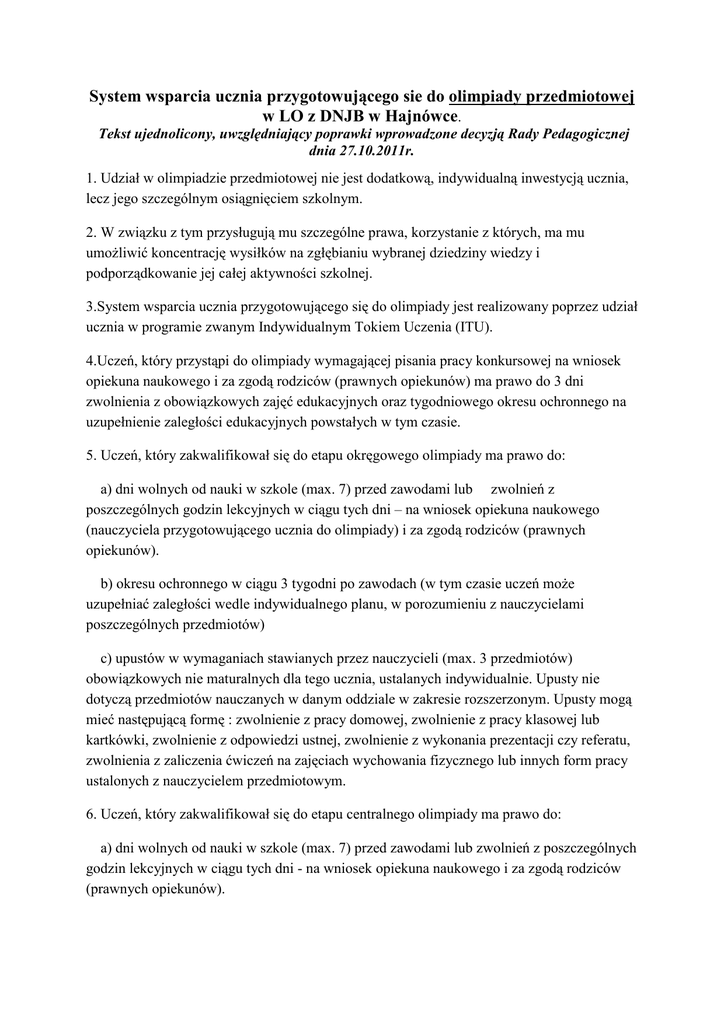 System wsparcia ucznia przygotowującego sie do olimpiady przedmiotowej w LO z DNJB w Hajnówce. Tekst ujednolicony, uwzględniający poprawki wprowadzone decyzją Rady Pedagogicznej dnia 27.10.2011r. 1. Udział w olimpiadzie przedmiotowej nie jest dodatkową, indywidualną inwestycją ucznia, lecz jego szczególnym osiągnięciem szkolnym. 2. W związku z tym przysługują mu szczególne prawa, korzystanie z których, ma mu umożliwić koncentrację wysiłków na zgłębianiu wybranej dziedziny wiedzy i podporządkowanie jej całej aktywności szkolnej. 3.System wsparcia ucznia przygotowującego się do olimpiady jest realizowany poprzez udział ucznia w programie zwanym Indywidualnym Tokiem Uczenia (ITU). 4.Uczeń, który przystąpi do olimpiady wymagającej pisania pracy konkursowej na wniosek opiekuna naukowego i za zgodą rodziców (prawnych opiekunów) ma prawo do 3 dni zwolnienia z obowiązkowych zajęć edukacyjnych oraz tygodniowego okresu ochronnego na uzupełnienie zaległości edukacyjnych powstałych w tym czasie. 5. Uczeń, który zakwalifikował się do etapu okręgowego olimpiady ma prawo do: a) dni wolnych od nauki w szkole (max. 7) przed zawodami lub zwolnień z poszczególnych godzin lekcyjnych w ciągu tych dni – na wniosek opiekuna naukowego (nauczyciela przygotowującego ucznia do olimpiady) i za zgodą rodziców (prawnych opiekunów). b) okresu ochronnego w ciągu 3 tygodni po zawodach (w tym czasie uczeń może uzupełniać zaległości wedle indywidualnego planu, w porozumieniu z nauczycielami poszczególnych przedmiotów) c) upustów w wymaganiach stawianych przez nauczycieli (max. 3 przedmiotów) obowiązkowych nie maturalnych dla tego ucznia, ustalanych indywidualnie. Upusty nie dotyczą przedmiotów nauczanych w danym oddziale w zakresie rozszerzonym. Upusty mogą mieć następującą formę : zwolnienie z pracy domowej, zwolnienie z pracy klasowej lub kartkówki, zwolnienie z odpowiedzi ustnej, zwolnienie z wykonania prezentacji czy referatu, zwolnienia z zaliczenia ćwiczeń na zajęciach wychowania fizycznego lub innych form pracy ustalonych z nauczycielem przedmiotowym. 6. Uczeń, który zakwalifikował się do etapu centralnego olimpiady ma prawo do: a) dni wolnych od nauki w szkole (max. 7) przed zawodami lub zwolnień z poszczególnych godzin lekcyjnych w ciągu tych dni - na wniosek opiekuna naukowego i za zgodą rodziców (prawnych opiekunów). b) okresu ochronnego w ciągu 3 tygodni po zawodach (w tym czasie uczeń może uzupełniać zaległości wedle indywidualnego planu, w porozumieniu z nauczycielami poszczególnych przedmiotów) c) upustów w wymaganiach stawianych przez nauczycieli (max. 3 przedmiotów) obowiązkowych nie maturalnych dla tego ucznia, ustalanych indywidualnie. Upusty nie dotyczą przedmiotów nauczanych w danym oddziale w zakresie rozszerzonym. Upusty mogą mieć następującą formę : zwolnienie z pracy domowej, zwolnienie z pracy klasowej lub kartkówki, zwolnienie z odpowiedzi ustnej, zwolnienie z wykonania prezentacji czy referatu, zwolnienia z zaliczenia ćwiczeń na zajęciach wychowania fizycznego lub innych form pracy ustalonych z nauczycielem przedmiotowym. 7. Uczeń, który przystąpi lub zakwalifikuje się do więcej niż 1 olimpiady ma prawo do do korzystania z systemu wsparcia ITU każdorazowo w identycznym zakresie przygotowując się do udziału w każdej z nich. 8. Dni wolne od zajęć szkolnych są przeznaczone na indywidualne uczenie się. 7a. uczeń nabywa uprawnień do dni wolnych po złożeniu karty ITU z zaplanowanymi dniami wolnymi potwierdzonym podpisem rodziców (prawnych opiekunów) oraz opiekuna naukowego. 9. Uczeń przygotowujący się do olimpiady ma prawo do uzyskania bezwarunkowej pomocy ze strony wszystkich uczących go nauczycieli, a uczący go nauczyciele mają obowiązek udzielenia pomocy w zakresie uzupełnienia zaległości powstałych podczas przygotowywania się do olimpiady przedmiotowej. 10. Wszystkie działania związane z realizacją i funkcjonowaniem systemu wsparcia ucznia przygotowującego się do olimpiady monitoruje szkolny koordynator olimpiad. Zadania koordynatora w załączeniu. (zał.1) 11. Szczegółowych informacji dotyczących zakresu merytorycznego i form organizacyjnych olimpiady udziela przedmiotowy koordynator olimpiad. Zakres obowiązków w załączeniu. (zał. 2) 12. W czasie przygotowania do olimpiady indywidualną opiekę nad uczniem sprawują: a) Wychowawca (sprawy dyscyplinarne) b) Opiekun naukowy (sprawy rozwoju naukowego, również dotyczące wymagań i upustów) c) szkolny koordynator konkursów (sprawy organizacyjne i ich koordynacja). 13. Wychowawca, opiekun naukowy i szkolny koordynator informują się wzajemnie o postępach w pracy ucznia oraz decydują o wszelkich sprawach szczegółowych jego dotyczących. 14. Warunkiem przystąpienia do ITU jest zgoda rodziców (prawnych opiekunów), opiekuna naukowego i nauczycieli wybranych przedmiotów wyrażona podpisem w „Karcie ITU”. Wzór karty w załączeniu.(zał. 4) 15. Uczeń, który bez usprawiedliwionego powodu nie wywiąże się z podjętych zobowiązań (tzn. przystąpi do systemu ITU, a nie weźmie udziału w olimpiadzie lub nie odda pracy konkursowej lub też nie wywiąże się z obowiązku zaliczeń według indywidualnego harmonogramu), nie ma prawa ubiegać się o ITU w kolejnym roku szkolnym (dotyczy uczniów klas I, II), ponadto jego ocena z zachowania zostanie obniżona. 16. Na początku każdego roku szkolnego dyrektor szkoły powołuje szkolnego koordynatora olimpiad oraz przedmiotowych koordynatorów olimpiad. 17. Sprawy sporne rozstrzyga dyrektor szkoły w porozumieniu ze szkolnym koordynatorem. Zał. nr 1 Szkolny koordynator olimpiad (SKO) Do zadań Szkolnego Koordynatora Olimpiad należą: • opracowanie i przedstawienie stałej ekspozycji informującej uczniów o zajęciach przygotowujących do konkursów i olimpiad i nauczycielach prowadzących te zajęcia; • opracowanie i przedsta