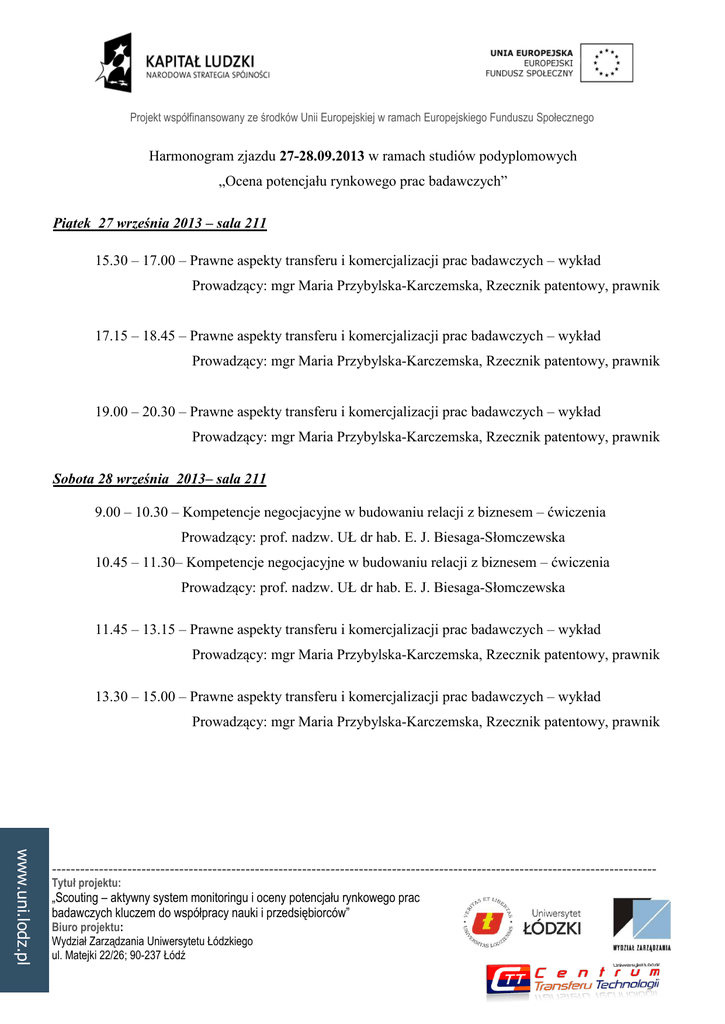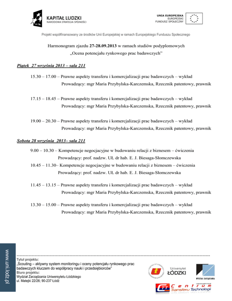 Projekt współfinansowany ze środków Unii Europejskiej w ramach Europejskiego Funduszu Społecznego Harmonogram zjazdu 27-28.09.2013 w ramach studiów podyplomowych „Ocena potencjału rynkowego prac badawczych” Piątek 27 września 2013 – sala 211 15.30 – 17.00 – Prawne aspekty transferu i komercjalizacji prac badawczych – wykład Prowadzący: mgr Maria Przybylska-Karczemska, Rzecznik patentowy, prawnik 17.15 – 18.45 – Prawne aspekty transferu i komercjalizacji prac badawczych – wykład Prowadzący: mgr Maria Przybylska-Karczemska, Rzecznik patentowy, prawnik 19.00 – 20.30 – Prawne aspekty transferu i komercjalizacji prac badawczych – wykład Prowadzący: mgr Maria Przybylska-Karczemska, Rzecznik patentowy, prawnik Sobota 28 września 2013– sala 211 9.00 – 10.30 – Kompetencje negocjacyjne w budowaniu relacji z biznesem – ćwiczenia Prowadzący: prof. nadzw. UŁ dr hab. E. J. Biesaga-Słomczewska 10.45 – 11.30– Kompetencje negocjacyjne w budowaniu relacji z biznesem – ćwiczenia Prowadzący: prof. nadzw. UŁ dr hab. E. J. Biesaga-Słomczewska 11.45 – 13.15 – Prawne aspekty transferu i komercjalizacji prac badawczych – wykład Prowadzący: mgr Maria Przybylska-Karczemska, Rzecznik patentowy, prawnik 13.30 – 15.00 – Prawne aspekty transferu i komercjalizacji prac badawczych – wykład Prowadzący: mgr Maria Przybylska-Karczemska, Rzecznik patentowy, prawnik www.uni.lodz.pl -------------------------------------------------------------------------------------------------------------------------------- Tytuł projektu: „Scouting – aktywny system monitoringu i oceny potencjału rynkowego prac badawczych kluczem do współpracy nauki i przedsiębiorców” Biuro projektu: Wydział Zarządzania Uniwersytetu Łódzkiego ul. Matejki 22/26; 90-237 Łódź