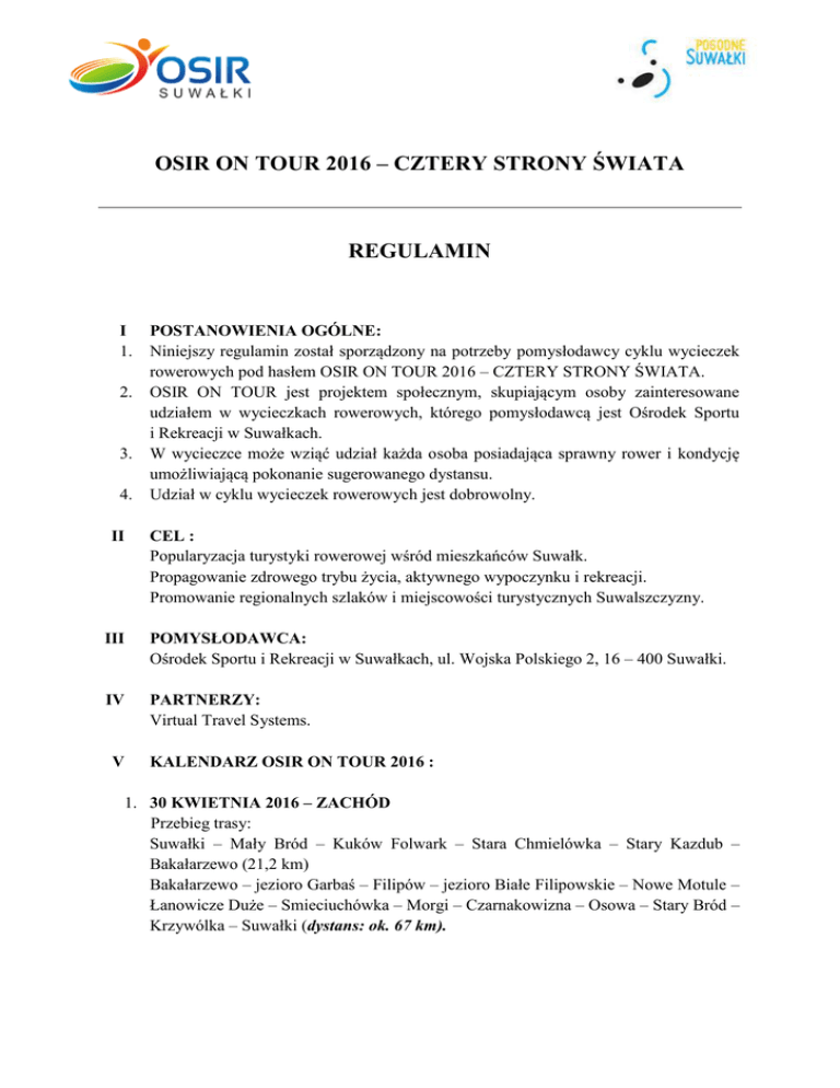 OSIR ON TOUR 2016 – CZTERY STRONY ŚWIATA REGULAMIN I 1. 2. 3. 4. II POSTANOWIENIA OGÓLNE: Niniejszy regulamin został sporządzony na potrzeby pomysłodawcy cyklu wycieczek rowerowych pod hasłem OSIR ON TOUR 2016 – CZTERY STRONY ŚWIATA. OSIR ON TOUR jest projektem społecznym, skupiającym osoby zainteresowane udziałem w wycieczkach rowerowych, którego pomysłodawcą jest Ośrodek Sportu i Rekreacji w Suwałkach. W wycieczce może wziąć udział każda osoba posiadająca sprawny rower i kondycję umożliwiającą pokonanie sugerowanego dystansu. Udział w cyklu wycieczek rowerowych jest dobrowolny. CEL : Popularyzacja turystyki rowerowej wśród mieszkańców Suwałk. Propagowanie zdrowego trybu życia, aktywnego wypoczynku i rekreacji. Promowanie regionalnych szlaków i miejscowości turystycznych Suwalszczyzny. III POMYSŁODAWCA: Ośrodek Sportu i Rekreacji w Suwałkach, ul. Wojska Polskiego 2, 16 – 400 Suwałki. IV PARTNERZY: Virtual Travel Systems. V KALENDARZ OSIR ON TOUR 2016 : 1. 30 KWIETNIA 2016 – ZACHÓD Przebieg trasy: Suwałki – Mały Bród – Kuków Folwark – Stara Chmielówka – Stary Kazdub – Bakałarzewo (21,2 km) Bakałarzewo – jezioro Garbaś – Filipów – jezioro Białe Filipowskie – Nowe Motule – Łanowicze Duże – Smieciuchówka – Morgi – Czarnakowizna – Osowa – Stary Bród – Krzywólka – Suwałki (dystans: ok. 67 km). 2. 11 – 12 CZERWCA 2016 – POŁUDNIE Przebieg trasy: Sobota – 11 czerwca Suwałki – Krzywe – Leszczewek – Cimochowizna – Stary Folwark – Magdalenowo – Wigry – Czerwony Folwark – Mikołajewo – Maćkowa Ruda – Wysoki Most – Studziany Las – Gulbin – Tartaczysko – Frącki – Okółek – Dworczysko – Jałowy Róg – Mikaszówka – Jazy – Płaska – most w Suchej Rzeczce – Studzieniczna – Przewięź (dystans: ok. 75 km). Przebieg trasy: Niedziela – 12 czerwca Przewięź – Augustów – Wójtowskie Włóki –Topiłówka – Siemianowe Bagno – Młyńsko – Święte Miejsce – Sucha Wieś – Dowspuda – Raczki – Małe Raczki – Sidory – Lipowo – Płociczno – Białe – Niemcowizna – Wychodne – Zielone Kamedulskie – Suwałki (dystans: ok. 61 km). 3. 17 WRZEŚNIA 2016 – WSCHÓD Przebieg trasy: Suwałki – Mała Huta – Nowa Wieś – jezioro Gałęziste – Wiatrołuża – Królówek – Piertanie – Tartak – Stary Folwark – Cimochowizna – Kładki w Dolinie Czarnej Hańczy – Sobolewo – Suwałki (dystans: ok. 45 km). 4. 8 PAŹDZIERNIKA 2016 – PÓŁNOC Przebieg trasy: Suwałki – Prudziszki – Suchodoły – Leszczewo – Szelment – Jeleniewo – Góra Krzemieniucha – Żywa Woda – Biała Woda – Krzywólka – Suwałki (dystans 34 km). VI PROGNOZOWANY PROGRAM MINUTOWY : 9.00 – zbiórka uczestników na parkingu zlokalizowanym przy siedzibie pomysłodawcy (Dział Sportu, Rekreacji i Marketingu, Suwałki, ul. Wojska Polskiego 2); 9.30 – start uczestników wycieczki. Pomysłodawca informuje, iż jest to orientacyjny program minutowy i poszczególne godziny mogą ulec modyfikacji. W owym przypadku na stronie pomysłodawcy www.osir.suwalki.pl zostanie zamieszczona stosowna informacja. VII WARUNKI ZGŁOSZENIA I UCZESTNICTWA : 1. OSIR ON TOUR to cykl imprez rowerowych o charakterze ogólnodostępnym. 2. W wycieczkach prawo startu mają osoby, które ukończyły 18 lat. W przypadku osób, które do dnia danej wycieczki nie ukończyły 18 roku życia, wymagane jest posiadanie zgody na udział w wycieczce, podpisanej przez rodziców lub prawnego opiekuna (załącznik nr 1). Oświadczenie należy złożyć do pomysłodawcy w dniu wyjazdu. 3. W przypadku osób poniżej 16 roku życia, wymagane jest posiadanie zgody na udział w wycieczce, podpisanej przez rodziców lub prawnego opiekuna oraz stała obecność rodzica lub prawnego opiekuna podczas wycieczki. 4. Uczestnik zgłaszając się na wycieczkę rowerową wyraża zgodę na poddanie się wymaganiom zawartym w niniejszym Regulaminie, w tym wyraża zgodę na przetwarzanie danych osobowych zgodnie z ustawą z dnia 29 sierpnia 1997r. o ochronie danych osobowych (tekst jednolity: Dz. U. 2002 r. Nr 101 poz. 926, ze zm.) oraz Regulaminem. Pomysłodawca zastrzega sobie, a także podmiotom z nim powiązanym, prawo do przeprowadzenia z każdym z Uczestników wywiadów, robienia zdjęć i/lub filmowania, używania imion i nazwisk, wizerunku, podobizny lub głosu oraz innych materiałów pochodzących lub związanych z uczestnictwem w imprezie na potrzeby reklamowe, promocyjne, a także możliwość ich wykorzystania w Internecie. 5. Wszyscy Uczestnicy przyjmują do wiadomości, że udział w wycieczce rowerowej wiąże się z wysiłkiem fizycznym i pociąga za sobą naturalne ryzyko i zagrożenie wypadkami, możliwość odniesienia obrażeń ciała i urazów fizycznych (w tym śmierci). Dodatkowo, mogą wystąpić inne czynniki ryzyka, niemożliwe do przewidzenia w tym momencie. Wypełnienie Formularza Rejestracyjnego oznacza, że Uczestnik rozważył i ocenił charakter, zakres i stopień ryzyka wiążącego się z uczestnictwem w wycieczce i dobrowolnie zdecydował się podjąć to ryzyko, startując w wycieczce rowerowej wyłącznie na własną odpowiedzialność. Uczestnik oświadcza, że nie będzie działał na szkodę pomysłodawcy. Uczestnik deklaruje, że zwróci pomysłodawcy wszystkie koszty (w tym koszty honorariów adwokackich i eksperckich) poniesione lub wypłacone przez pomysłodawcę na rzecz jakiejkolwiek osoby (w tym Uczestnika i/lub każdego z jego ubezpieczycieli) w związku z jakimkolwiek wypadkiem, stratą, szkodą lub odniesieniem obrażeń (w tym śmiercią), wynikłym z obecności lub udziału Uczestnika w wycieczce z wyjątkiem wypadków spowodowanych zaniedbaniem ze strony pomysłodawcę. 6. Warunkiem uczestnictwa w wycieczkach rowerowych jest prawidłowe wypełnienie Formularza Rejestracyjnego znajdującego się na stronie internetowej www.elektronicznezapisy.