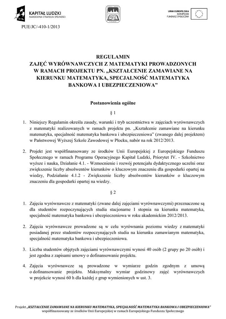 PUE/JC/-410-1/2013 REGULAMIN ZAJĘĆ WYRÓWNAWCZYCH Z MATEMATYKI PROWADZONYCH W RAMACH PROJEKTU PN. „KSZTAŁCENIE ZAMAWIANE NA KIERUNKU MATEMATYKA, SPECJALNOŚĆ MATEMATYKA BANKOWA I UBEZPIECZENIOWA” Postanowienia ogólne §1 1. Niniejszy Regulamin określa zasady, warunki i tryb uczestnictwa w zajęciach wyrównawczych z matematyki realizowanych w ramach projektu pn. „Kształcenie zamawiane na kierunku matematyka, specjalność matematyka bankowa i ubezpieczeniowa” (zwanego dalej projektem) w Państwowej Wyższej Szkole Zawodowej w Płocku, nabór na rok 2012/2013. 2. Projekt jest współfinansowany ze środków Unii Europejskiej z Europejskiego Funduszu Społecznego w ramach Programu Operacyjnego Kapitał Ludzki, Priorytet IV. - Szkolnictwo wyższe i nauka, Działanie 4.1. - Wzmocnienie i rozwój potencjału dydaktycznego uczelni oraz zwiększenie liczby absolwentów kierunków o kluczowym znaczeniu dla gospodarki opartej na wiedzy, Podziałanie 4.1.2 - Zwiększenie liczby absolwentów kierunków o kluczowym znaczeniu dla gospodarki opartej na wiedzy. §2 1. Zajęcia wyrównawcze z matematyki (zwane dalej zajęciami wyrównawczymi) przeznaczone są dla studentów rozpoczynających studia stacjonarne I stopnia na kierunku matematyka, specjalność matematyka bankowa i ubezpieczeniowa w roku akademickim 2012/2013. 2. Zajęcia wyrównawcze prowadzone są w celu wyrównania poziomu wiedzy z matematyki posiadanej przez studentów rozpoczynających studia na kierunku zamawianym matematyka, specjalność matematyka bankowa i ubezpieczeniowa. 3. Liczba studentów objętych zajęciami wyrównawczymi wynosi 40 osób (2 grupy po 20 osób) i jest zgodna z zapisami umowy o dofinansowanie projektu. 4. Zajęcia wyrównawcze są prowadzone w wymiarze godzin zgodnym z umową o dofinansowanie projektu. Maksymalny wymiar godzinowy zajęć wyrównawczych w projekcie wynosi 60 h dla każdej z grup wymienionych w ust. 3. Projekt „KSZTAŁCENIE ZAMAWIANE NA KIERUNKU MATEMATYKA, SPECJALNOŚĆ MATEMATYKA BANKOWA I UBEZPIECZENIOWA” współfinansowany ze środków Unii Europejskiej w ramach Europejskiego Funduszu Społecznego Warunki i zasady uczestnictwa w zajęciach wyrównawczych §3 1. Prawo do udziału w zajęciach wyrównawczych mają studenci rozpoczynający studia stacjonarne I stopnia na kierunku zamawianym matematyka, specjalność matematyka bankowa i ubezpieczeniowa w roku akademickim 2012/2013 (zwanej dalej uczestnikami), którzy zadeklarowali chęć udziału w projekcie. 2. Uczestnicy kierowani są na zajęcia wyrównawcze przez Kierownika projektu. 3. W pierwszej kolejności prawo do udziału w zajęciach wyrównawczych będą mieli studenci, którzy zostali zrekrutowani do projektu w ramach I i II rekrutacji uzupełniającej. Kolejni uczestnicy będą kwalifikowani do udziału w zajęciach wyrównawczych na podstawie najmniejszej liczby punktów uzyskanej na egzaminie maturalnym z przedmiotu matematyka. 4. Lista rankingowa osób zakwalifikowanych do udziału w zajęciach wyrównawczych jest sporządzana zgodnie za zasadami podanymi w ust. 3. Osoby, które nie zakwalifikują się na listę rankingową zostaną wpisani na listę rezerwową. 5. Uczestnik zakwalifikowany i wykazujący chęć udziału w zajęciach wyrównawczych podpisuje deklarację udziału w zajęciach wyrównawczych, stanowiącą załącznik nr 1 do niniejszego regulaminu. 6. W przypadku rezygnacji osoby zakwalifikowanej do udziału w zajęciach wyrównawczych możliwe jest zajęcie jego miejsca przez kolejną osobę z listy rezerwowej, wykazującą chęć uczestnictwa w zajęciach wyrównawczych. Wymagane jest wtedy spełnienie wymogów określonych w ust. 5 przez nowego uczestnika zajęć wyrównawczych. 7. Udział w zajęciach wyrównawczych jest bezpłatny. 8. Uczestnik zajęć wyrównawczych zobowiązany jest do: a) aktywnego uczestnictwa w zajęciach, b) każdorazowego potwierdzania uczestnictwa na liście obecności własnoręcznym podpisem, c) wypełniania ankiet ewaluacji i monitoringu projektu. 9. Uczestnik zajęć wyrównawczych zobowiązany jest do uczestnictwa w co najmniej 80% zajęć objętych programem. 10. Istnieje możliwość usprawiedliwiania nieobecności. Dowód dokumentujący przyczynę nieobecności należy przedstawić prowadzącemu zajęcia. W sprawach spornych decyzję o uznaniu bądź nieuznaniu przedstawionego dowodu podejmuje Kierownik projektu. 11. W przypadku nieobecności na więcej niż 20% zajęć objętych programem, Uczestnik ma obowiązek odpracować te nieobecności w innym terminie lub na zasadach określonych przez prowadzącego zajęcia. 12. Zaliczenie zajęć wyrównawczych odbywa się na podstawie obecności. Projekt „KSZTAŁCENIE ZAMAWIANE NA KIERUNKU MATEMATYKA, SPECJALNOŚĆ MATEMATYKA BANKOWA I UBEZPIECZENIOWA” współfinansowany ze środków Unii Europejskiej w ramach Europejskiego Funduszu Społecznego 13. W przypadku niezaliczenia zajęć wyrównawczych przez jego uczestnika Kierownik projektu ma prawo podjąć decyzję o skreśleniu z listy osób będących uczestnikami Projektu. 14. Uczestnik traci prawo do uczestniczenia w zajęciach wyrównawczych w przypadku skreślenia go z listy studentów. 15. Rezygnacja studenta z zajęć wyrównawczych przed ich zakończeniem może być podstawą do odebrania studentowi prawa do Stypendium Motywacyjnego oraz dyskwalifikować z prawa do udziału w innych formach wsparcia oferowanych w ramach projektu. Postanowienia końcowe §4 1. Studenci przez podpisanie deklaracji udziału w zajęciach wyrównawczych akceptują postanowienia niniejszego regulaminu i zobowiązują się do ich przestrzegania. 2. Aktualna treść regulaminu znajduje się w Biurze projektu (do wglądu), tablicy ogłoszeń projektu i na stronie internetowej projektu. 3. W uzasadnionych przypadkach Państwowa Wyższa szkoła Zawodowa w Płocku zastrzega sobie prawo zmiany regulaminu. 4. O zmianie regulaminu uczestnicy zostaną powiadomieni. 5. W sprawach nieur