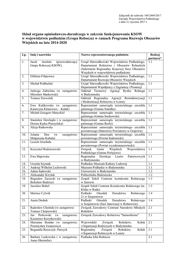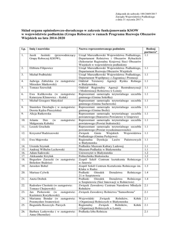 Załącznik do uchwały 188/2469/2017 Zarządu Województwa Podlaskiego z dnia 31 stycznia 2017 r. Skład organu opiniodawczo-doradczego w zakresie funkcjonowania KSOW w województwie podlaskim (Grupa Robocza) w ramach Programu Rozwoju Obszarów Wiejskich na lata 2014-2020 Lp. Imię i nazwisko Nazwa reprezentowanego podmiotu 1. Jacek Jasiński (przewodniczący Grupy Roboczej KSOW), 2. Elżbieta Filipowicz 3. Michał Podbielski 4. Jadwiga Zabielska (w zastępstwie: Mirosław Markowski) Tomasz Szeweluk Urząd Marszałkowski Województwa Podlaskiego, Departament Rolnictwa i Obszarów Rybackich (Sekretariat Regionalny Krajowej Sieci Obszarów Wiejskich w województwie podlaskim) Urząd Marszałkowski Województwa Podlaskiego, Departament Rozwoju Obszarów Wiejskich Urząd Marszałkowski Województwa Podlaskiego, Departament Współpracy z Zagranicą i Promocji Oddział Terenowy Agencji Rynku Rolnego w Białymstoku Oddział Regionalny Agencji Restrukturyzacji i Modernizacji Rolnictwa w Łomży Reprezentant samorządu terytorialnego szczebla gminnego (Gmina Sokółka) Reprezentant samorządu terytorialnego szczebla gminnego (Gmina Suchowola) Reprezentant samorządu terytorialnego szczebla gminnego (Gmina Boćki) Reprezentant samorządu terytorialnego szczebla powiatowego (Starostwo Powiatowe w Grajewie) Reprezentant samorządu terytorialnego szczebla powiatowego (Powiat białostocki) Reprezentant samorządu terytorialnego szczebla powiatowego (Powiat wysokomazowiecki) Związek Gmin Wiejskich Województwa Podlaskiego (Gmina Perlejewo) Regionalna Dyrekcja Lasów Państwowych w Białymstoku Podlaskie Muzeum Kultury Ludowej Muzeum Podlaskie w Białymstoku Uniwersytet w Białymstoku Politechnika Białostocka Zespół Szkół Centrum kształcenia Rolniczego w Janowie Zespół Szkół Centrum Kształcenia Rolniczego im. Kluka w Rudce Podlaski Ośrodek Doradztwa Rolniczego 21.w Szepietowie Podlaski Ośrodek Doradztwa Rolniczego w Szepietowie (Sieć Innowacji w Rolnictwie) Związek Zawodowy Centrum Narodowe Młodych Rolników Związek Zawodowy Rolnictwa "Samoobrona" 5. 6. 7. 8. 9. Ewa Kulikowska (w zastępstwie: Katarzyna Klimowicz – Kułak) Michał Grzegorz Matyskiel Stanisław Derehajło ( w zastępstwie: Dorota Kędra-Ptaszyńska) Alicja Rutkowska 11. Jolanta Den (w Małgorzata Kubala) Leszek Gruchała 12. Krzysztof Radziszewski 13. Ewa Majewska 14. 15. 16. 17. 18. 19. Urszula Szymak Andrzej Wilhelm Lechowski Adam Sadowski Aleksander Kiryluk Bogusław Zarzecki (w zastępstwie: Bolesław Budzisz) Jarosław Bobel 20. Mariusz Cylwik 21. Aneta Drobek 22. Radosław Choiński (w zastępstwie: Tomasz Chojnowski) Jan Perkowski (w zastępstwie: Kazimierz Korytkowski) Marianna Bondar (w zastępstwie: Przemysław Iwanowicz) Bogumiła Roszczyk- Parzych 10. 23. 24. 25. 26. zastępstwie: Barbara Laskowska ( w zastępstwie: Anna Obermiler) Wojewódzki Związek Rolników, i Organizacji Rolniczych w Białymstoku Regionalny Związek Rolników, i Organizacji Rolniczych w Łomży Podlaska Izba Rolnicza Rodzaj partnera* 1.1 1.1 1.1 1.1 1.1 1.1 1.1 1.1 1.1 1.1 1.1 1.1 1.1 1.1 1.1 1.2 1.2 1.3 1.3 1.4 1.4 2.1 2.1 Kółek 2.1 Kółek 2.1 2.1 27. 28. 29. 30. Sylwia Grudzińska Elżbieta Dorota Niedziejko Witold Karczewski Małgorzata Wojtach 31. 32. 33. Mariusz Żeliszczak Marcin Bielec Eugeniusz Wołkowycki 34. Tomasz Siergiejewicz 35. Andrzej Remisiewicz 36. Agnieszka Wojtkowska (w zastępstwie: Monika Uszyńska) Katarzyna Śniecińska ( w zastępstwie: Iwona Wiernicka) Eugeniusz Kowalski (w zastępstwie: Monika Paulina Monach) Adam Kamiński Joanna Sokólska Anna Mioduszewska 37. 38. 39. 40. 41. 42. 43. 44. 45. 46. 47. Paweł Kondracki Jerzy Nazaruk Krzysztof Leończuk Jan Gradkowski (w zastępstwie: Antoni Ostrowski) Danuta Bagińska ( w zastępstwie: Agata Drobińska) Danuta Roszkowska Podlaska Regionalna Organizacja Turystyczna Suwalska Izba Rolniczo-Turystyczna Izba Przemysłowo-Handlowa w Białymstoku Podlaskie stowarzyszenie Producentów Wędlin Wędzonych Metodą Tradycyjną „Podlaskie Smaki” Stowarzyszenie „Macierzanka” Zrzeszenie Producentów Sera Korycińskiego Białowieskie Stowarzyszenie Agroturystyczne „Żubr” Przedsiębiorca/ laureat ogólnopolskiego finału konkursu „Nasze kulinarne dziedzictwo” Przedsiębiorca/ laureat ogólnopolskiego finału konkursu „Agroliga” LGD Tygiel Doliny Bugu 2.2 2.2 2.2 2.2 LGD Kraina Bobra 3.1 LGD Puszcza Białowieska 3.1 LGD Puszcza Knyszyńska Podlaska Sieć Lokalnych Grup Działania Koło Gospodyń Wiejskich/OSP w Starym Laskowcu Związek Młodzieży Wiejskiej Stowarzyszenie "Ściana Wschodnia" Ośrodek Wspierania Organizacji Pozarządowych Związek Ochotniczych Straży Pożarnych RP 3.1 3.1 3.2 Stowarzyszenie „BARWA” 3.2 Polskie Stowarzyszenie Białymstoku Diabetyków o/ w 2.2 2.2 2.2 2.3 2.3 3.1 3.2 3.2 3.2 3.2 3.2 * Klasyfikacja zgodnie z „Europejskim kodeksem postępowania w zakresie partnerstwa w ramach europejskich funduszy strukturalnych i inwestycyjnych”: 1. Przedstawiciele władz regionalnych, lokalnych, miejskich i innych instytucji publicznych. 1.1 Przedstawiciel władzy regionalnej, lokalnej. 1.2 Przedstawiciel instytucji szkolnictwa wyższego. 1.3 Przedstawiciel usługodawców w zakresie usług kształcenia i szkolenia. 1.4 Przedstawiciel usługodawców w zakresie usług doradczych. 2. Przedstawiciele partnerów społeczno-ekonomicznych. 2.1 Przedstawiciel organizacji partnerów społecznych, organizacji międzybranżowych i organizacji sektorowych. 2.2 Przedstawiciel izb handlowych i stowarzyszeń przedsiębiorców reprezentujących ogólny interes sektorów i branż. 2.3 Inne podobne 3. Przedstawiciele podmiotów reprezentujących społeczeństwo obywatelskie, takich jak partnerzy działający na rzecz ochrony środowiska, organizacje pozarządowe, a także podmiotów odpowiedzialnych za promowanie włączenia społecznego, równouprawnienia płci oraz niedyskryminacji. 3.1 Przedstawiciel lokalnych grup działania. 3.2 Przedstawic