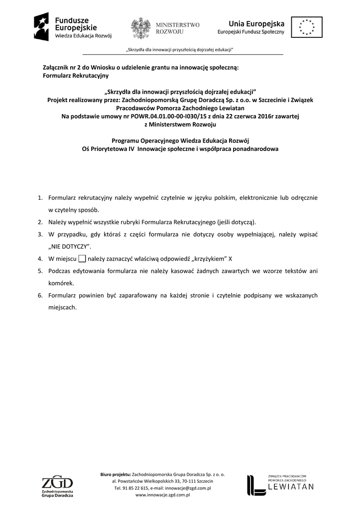 „Skrzydła dla innowacji przyszłością dojrzałej edukacji” Załącznik nr 2 do Wniosku o udzielenie grantu na innowację społeczną: Formularz Rekrutacyjny „Skrzydła dla innowacji przyszłością dojrzałej edukacji” Projekt realizowany przez: Zachodniopomorską Grupę Doradczą Sp. z o.o. w Szczecinie i Związek Pracodawców Pomorza Zachodniego Lewiatan Na podstawie umowy nr POWR.04.01.00-00-I030/15 z dnia 22 czerwca 2016r zawartej z Ministerstwem Rozwoju Programu Operacyjnego Wiedza Edukacja Rozwój Oś Priorytetowa IV Innowacje społeczne i współpraca ponadnarodowa 1. Formularz rekrutacyjny należy wypełnić czytelnie w języku polskim, elektronicznie lub odręcznie w czytelny sposób. 2. Należy wypełnić wszystkie rubryki Formularza Rekrutacyjnego (jeśli dotyczą). 3. W przypadku, gdy któraś z części formularza nie dotyczy osoby wypełniającej, należy wpisać „NIE DOTYCZY”. 4. W miejscu należy zaznaczyć właściwą odpowiedź „krzyżykiem” X 5. Podczas edytowania formularza nie należy kasować żadnych zawartych we wzorze tekstów ani komórek. 6. Formularz powinien być zaparafowany na każdej stronie i czytelnie podpisany we wskazanych miejscach. Biuro projektu: Zachodniopomorska Grupa Doradcza Sp. z o. o. al. Powstańców Wielkopolskich 33, 70-111 Szczecin Tel. 91 85 22 615, e-mail: [email protected] www.innowacje.zgd.com.pl „Skrzydła dla innowacji przyszłością dojrzałej edukacji” WNIOSKODAWCA – OSOBA PRAWNA (Tabelę poniżej wypełnia Wnioskodawca będący osobą prawną) Pełna nazwa Wnioskodawcy Forma prawna Wnioskodawcy Imię i nazwisko osoby/osób upoważnionej/ych do reprezentacji Wnioskodawcy NIP (jeśli dotyczy) REGON (jeśli dotyczy) KRS (jeśli dotyczy) Adres prowadzenia działalności Ulica: Nr domu Nr lokalu Miejscowość Kod pocztowy Gmina Powiat Województwo Telefon stacjonarny Telefon komórkowy Adres e-mail Adres strony www Oświadczam, że podane dane są prawdziwe, i że są mi znane przepisy Kodeksu karnego o odpowiedzialności za podanie danych niezgodnych z rzeczywistością. Data i podpis osoby upoważnionej do składania zobowiązań w imieniu Wnioskodawcy: Biuro projektu: Zachodniopomorska Grupa Doradcza Sp. z o. o. al. Powstańców Wielkopolskich 33, 70-111 Szczecin Tel. 91 85 22 615, e-mail: [email protected] www.innowacje.zgd.com.pl „Skrzydła dla innowacji przyszłością dojrzałej edukacji” WNIOSKODAWCA – OSOBA FIZYCZNA (Tabelę poniżej wypełnia Wnioskodawca będący osobą fizyczną) Imię/Imiona Nazwisko Data i miejsce urodzenia Data ważności dokumentu Seria i nr dowodu osobistego Dowód osobisty wydany przez Płeć Kobieta Mężczyzna PESEL NIP Adres zameldowania Ulica Nr domu Nr lokalu Miejscowość Kod pocztowy Obszar zamieszkania WIEJSKI MIEJSKI Powiat Gmina Województwo Adres zamieszkania (jeśli jest inny niż adres zameldowania) DOTYCZY Ulica Nr domu Nr lokalu Miejscowość Kod pocztowy Obszar zamieszkania Powiat WIEJSKI MIEJSKI Gmina Województwo Telefon stacjonarny Telefon komórkowy Adres e-mail Biuro projektu: Zachodniopomorska Grupa Doradcza Sp. z o. o. al. Powstańców Wielkopolskich 33, 70-111 Szczecin Tel. 91 85 22 615, e-mail: [email protected] www.innowacje.zgd.com.pl NIE DOTYCZY „Skrzydła dla innowacji przyszłością dojrzałej edukacji” Brak (brak formalnego wykształcenia) Poziom wykształcenia (zaznaczyć X we właściwym miejscu wybierając jedno ostatnie ukończone wykształcenie tzn. najwyższe) Podstawowe (kształcenie ukończone na poziomie szkoły podstawowej) Gimnazjalne (kształcenie ukończone na poziomie szkoły gimnazjalnej) Ponadgimnazjalne (kształcenie ukończone na poziomie szkoły średniej lub zasadniczej zawodowej) Pomaturalne (kształcenie ukończone na poziomie wyższym niż kształcenie na poziomie szkoły średniej, które jednocześnie nie jest wykształceniem wyższym) Wyższe (pełne i ukończone wykształcenie na poziomie wyższym) Osoba pracująca Osoba bezrobotna Status na rynku pracy Osoba bezrobotna, znajdująca się w szczególnie trudnej sytuacji na rynku pracy (bezrobotny do 30 roku życia, osoba długotrwale bezrobotna, bezrobotny powyżej 50 roku życia, bezrobotny korzystający ze świadczeń z pomocy społecznej,)bezrobotny posiadający co najmniej jedno dziecko do 6 roku życia lub co najmniej jedno dziecko niepełnosprawne do 18 roku życia, bezrobotny będący osobą niepełnosprawną ). Stan zdrowia osoby składającej Osoba pełnosprawna Osoba niepełnosprawna Oświadczam, że podane dane są prawdziwe, i że są mi znane przepisy Kodeksu karnego o odpowiedzialności za podanie danych niezgodnych z rzeczywistością. Data i podpis osoby składającej Formularz: Biuro projektu: Zachodniopomorska Grupa Doradcza Sp. z o. o. al. Powstańców Wielkopolskich 33, 70-111 Szczecin Tel. 91 85 22 615, e-mail: [email protected] www.innowacje.zgd.com.pl