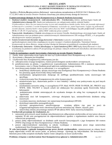REGULAMIN KORZYSTANIA Z SIECI KOMPUTEROWEJ W DOMACH STUDENTA AKADEMII POMORSKIEJ w SŁUPSKU Zgodnie z Polityką Bezpieczeństwa Informacji wprowadzoną zarządzeniem nr R/0210/136/13 Rektora AP z 11.12.2013 roku na terenie Domów Studenta stosowany jest autoryzowany dostęp do Internetu: Z autoryzowanego dostępu do Sieci Komputerowej w Domach Studenta korzystają: Studenci studiów stacjonarnych - stali mieszkańcy DS. – Użytkownicy, którzy pobiorą login i hasło od Administratora danego DS. (hasło jest jednorazowe, po zalogowaniu należy zmienić hasło). Użytkownikowi, który nie jest autoryzowany (a jest nim standardowo każda osoba, która nie posiada informacji technicznych w systemie o swoim komputerze/routerze), wyświetla się panel logowania. Loguje się pobranymi swoimi danymi, zmienia hasło i musi podać adres fizyczny MAC wyświetlający się jako podpowiedź w formacie 00:0e:11:2b:33:11 pod nazwą „Adres MAC widoczny przez system”. Nauczyciele Akademiccy i Goście mieszkającym na terenie Osiedla Akademickiego otrzymają login i hasło od Administratora sieci po podaniu przez zainteresowanych Administratorowi DS swojego PESEL, a w przypadku obcokrajowców numeru paszportu, Goście kwaterowani doraźnie mogą korzystać z Internetu (z poczty i przeglądania stron) na ogólnodostępnym stanowisku znajdującym się przy recepcji w każdym akademiku. Natomiast Goście kwaterowani na okres dłuższy, mogą uzyskać dostęp do Internetu na podobnych warunkach jak studenci, Użytkownicy Internetu - Goście mieszkający w części hotelowej DS1 i DS3 będą identyfikowani w sieci uczelnianej na podstawie adresu IP przypisanego do pokoju i danych osobowych mieszkańca zakwaterowanego w tym pokoju. Ustala się następujące zasady korzystania z Internetu na terenie Domów Studenta: 1. Osoby, które wprowadzą swoje loginy do sieci są Użytkownikami Sieci Komputerowej w DS.-ach. 2. Korzystanie z Internetu jest bezpłatne. 3. Użytkownik Sieci Komputerowej zobowiązany jest do: 1) zabezpieczenia swojego komputera, routera przed dostępem użytkowników zewnętrznych, 2) poinformowania na piśmie, z tygodniowym wyprzedzeniem Administratora DS o zamiarze zaprzestania korzystania z sieci w Domu Studenta przed upływem zadeklarowanego terminu, 3) niewykonywania działań, które są zabronione, a w szczególności: a. modyfikacji okablowania, sprzętu sieciowego oraz konfiguracji Sieci Komputerowej w Domu Studenta bez pisemnej zgody Kierownika Sekcji Informatyki b. uruchamiania oprogramowania służącego do sniffingu (podsłuchiwania ruchu sieciowego) lub spoofingu. c. wykorzystywania Sieci Komputerowej do celów komercyjnych d. monitorowania łącz, skanowania portów w sieci lokalnej i zdalnej oraz podszywania się pod innych użytkowników e. uruchamiania serwerów usług, w szczególności FTP, Mail, NNTP, PEER TO PEER, DC, PROXY oraz WWW, SSH, TELNET w innych celach niż edukacyjne bez pisemnej zgody Kierownika Sekcji Informatyki f. podejmowania działań zmierzających do uzyskania dostępu do usług bez wymaganych do tego uprawnień g. atakowania sieci lub komputerów, celowego obciążania łącz, uniemożliwienia działania usług sieciowych h. wysyłania masowej, niechcianej i nie zamawianej korespondencji (SPAM) i. dystrybucji materiałów pornograficznych j. używania oprogramowania umożliwiającego wymianę plików (np. peer to peer) do ściągania/udostępniania treści chronionych prawem autorskim (np. filmów, muzyki, gier) k. samowolnej zmiany przyznanego numeru IP lub adresu MAC karty sieciowej komputera. Użytkownik przyjmuje do wiadomości, że: 1. naruszenie powyższych zasad skutkuje natychmiastowym odłączeniem użytkownika od sieci przez okres co najmniej 30 dni oraz pociągnięciem do odpowiedzialności zgodnie z regulaminem studiów oraz innymi właściwymi przepisami; 2. ponosi pełną odpowiedzialność za działania osób trzecich korzystających z jego komputera lub routera (WIFI) włączonego do Sieci Komputerowej w Domu Studenta; 3. ponosi odpowiedzialność materialną za szkody wynikające z dokonania przez niego samowolnej modernizacji Sieci Komputerowej w Domu Studenta. W celu korzystania z gniazda komputerowego przez dwóch użytkowników, zainteresowani na własny koszt kupią odpowiedni switch lub access point, za pomocą którego rejestrują się indywidualnie. Do korzystania z Internetu przez kilka urządzeń niezbędny będzie router zakupiony na koszt użytkownika. Problemy związane z użytkowaniem Sieci Komputerowej zgłaszać u Administratora DS. luty 2015