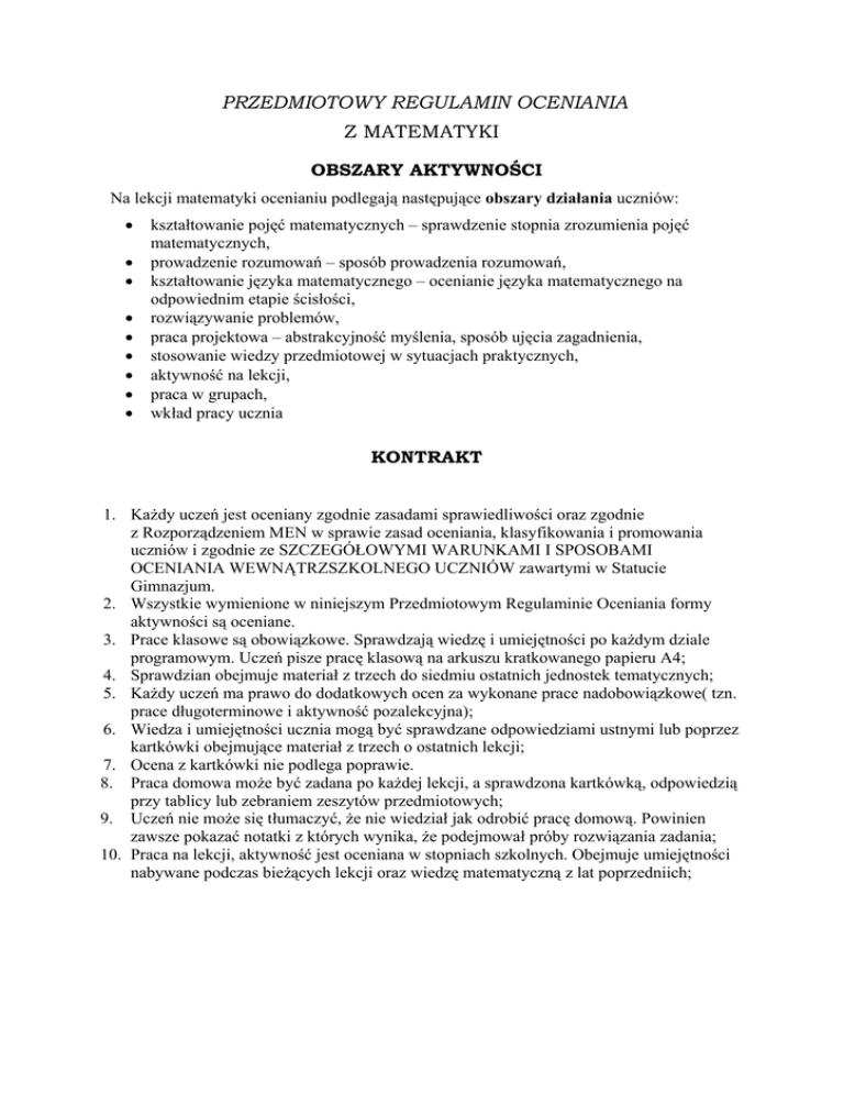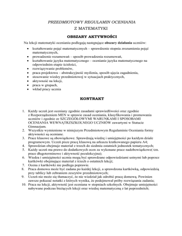 PRZEDMIOTOWY REGULAMIN OCENIANIA Z MATEMATYKI OBSZARY AKTYWNOŚCI Na lekcji matematyki ocenianiu podlegają następujące obszary działania uczniów: • • • • • • • • • kształtowanie pojęć matematycznych – sprawdzenie stopnia zrozumienia pojęć matematycznych, prowadzenie rozumowań – sposób prowadzenia rozumowań, kształtowanie języka matematycznego – ocenianie języka matematycznego na odpowiednim etapie ścisłości, rozwiązywanie problemów, praca projektowa – abstrakcyjność myślenia, sposób ujęcia zagadnienia, stosowanie wiedzy przedmiotowej w sytuacjach praktycznych, aktywność na lekcji, praca w grupach, wkład pracy ucznia KONTRAKT 1. Każdy uczeń jest oceniany zgodnie zasadami sprawiedliwości oraz zgodnie z Rozporządzeniem MEN w sprawie zasad oceniania, klasyfikowania i promowania uczniów i zgodnie ze SZCZEGÓŁOWYMI WARUNKAMI I SPOSOBAMI OCENIANIA WEWNĄTRZSZKOLNEGO UCZNIÓW zawartymi w Statucie Gimnazjum. 2. Wszystkie wymienione w niniejszym Przedmiotowym Regulaminie Oceniania formy aktywności są oceniane. 3. Prace klasowe są obowiązkowe. Sprawdzają wiedzę i umiejętności po każdym dziale programowym. Uczeń pisze pracę klasową na arkuszu kratkowanego papieru A4; 4. Sprawdzian obejmuje materiał z trzech do siedmiu ostatnich jednostek tematycznych; 5. Każdy uczeń ma prawo do dodatkowych ocen za wykonane prace nadobowiązkowe( tzn. prace długoterminowe i aktywność pozalekcyjna); 6. Wiedza i umiejętności ucznia mogą być sprawdzane odpowiedziami ustnymi lub poprzez kartkówki obejmujące materiał z trzech o ostatnich lekcji; 7. Ocena z kartkówki nie podlega poprawie. 8. Praca domowa może być zadana po każdej lekcji, a sprawdzona kartkówką, odpowiedzią przy tablicy lub zebraniem zeszytów przedmiotowych; 9. Uczeń nie może się tłumaczyć, że nie wiedział jak odrobić pracę domową. Powinien zawsze pokazać notatki z których wynika, że podejmował próby rozwiązania zadania; 10. Praca na lekcji, aktywność jest oceniana w stopniach szkolnych. Obejmuje umiejętności nabywane podczas bieżących lekcji oraz wiedzę matematyczną z lat poprzedniich; FORMY KONTROLI: CZĘSTOTLIWOŚĆ W OKRESIE 3-4 FORMY AKTYWNOŚCI 1 Prace klasowe, 45 min. 2 Sprawdziany, 15- 30 min. 3 Prace domowe 4 Kartkówki, 5 – 10 min. 5 Odpowiedzi ustne, 6 Praca w grupach, Aktywny udział w lekcji oraz praca na lekcji, 7 2-4 minimum 5 2-3 minimum 1 8 Aktywność poza lekcjami matematyki, 9 Prace długoterminowe 10 Zeszyt przedmiotowy 2-3 indywidualnie, według potrzeb indywidualnie, według potrzeb indywidualnie, według potrzeb za okres OCENIANIE FORM AKTYWNOŚCI UCZNIA Prace klasowe Uczeń otrzymuje z pracy pisemnej ocenę: • niedostateczną jeżeli uzyskał • dopuszczającą jeżeli uzyskał • dostateczną jeżeli uzyskał • dobrą jeżeli uzyskał • bardzo dobrą jeżeli uzyskał • celującą jeżeli uzyskał powyżej 0-34%punktów 35-49%punktów 50-72%punktów 73-88%punktów 89-100%punktów 100% punktów Sprawdziany Uczeń otrzymuje ocenę ze sprawdzianu zależną od: • liczby uzyskanych punktów i przy zastosowaniu przelicznika % podobnie jak w ocenie pracy klasowej lub • poprawnie rozwiązanych zadań na odpowiednią ocenę. Oceny ze sprawdzianu nie można poprawić. Praca w grupach Przy ocenie pracy ucznia w grupie uwzględnia się następujące zachowania ucznia: • stara się zrozumieć zadany problem • trzyma się tematu • szuka odpowiedzi na zadane pytania • wskazuje pomysły na rozwiązanie problemu • stara się stworzyć przyjemną atmosferę i zachęca innych do pracy • przyjmuje na siebie określoną rolę i wywiązuje się z niej. • dba o jakość pracy, przypomina reguły pracy w grupie. Odpowiedzi ustne oraz odpowiedzi pisemne (kartkówki) Uczeń otrzymuje z odpowiedzi ustnej oceny (od 1 do 6) zależne od spełnienia wymagań edukacyjnych z matematyki na poszczególne stopnie. Sprawność, płynność czynności obliczeniowych ma wpływ na ocenę. Podpowiedzi nauczyciela powodują obniżenie oceny. Podobnie oceniane są krótkie kartkówki, traktowane jako odpowiedzi pisemne. Ocena uzależniona jest również od spełnienia wymagań na poszczególne oceny. Zadania domowe Uczeń otrzymuje ocenę za pracę domową, gdy zaprezentuje przy tablicy rozwiązanie zadania. Ocena uwzględnia wymagania edukacyjne na poszczególne oceny. Praca domowa może być sprawdzona również krótką kartkówką. Za jeden brak zadania domowego uczeń otrzymuje do dziennika „|”, drugi brak skutkuje oceną niedostateczną, itd. Praca na lekcji Uczeń otrzymuje ocenę za pracę na lekcji, jeśli zaprezentuje wiedzę i umiejętności zgodne z wymaganiami edukacyjnymi na poszczególne stopnie. Ocenie podlegają nowe treści lub wcześniej przerabiane. Uczeń może otrzymać nawet ocenę niedostateczną za pracę na lekcji, jeśli jego wiadomości i umiejętności nie pozwalają na świadome korzystanie z lekcji i wykonywanie prostych zadań z pomocą nauczyciela. Zeszyt przedmiotowy Uczeń ma obowiązek prowadzić zeszyt przedmiotowy Uczeń otrzymuje ocenę za prowadzenie zeszytu przedmiotowego w skali 1 – 5. Na ocenę za zeszyt mają wpływ: • zapisane wszystkie tematy lekcji z datą; • w danej lekcji mają być zapisane wszystkie treści tej lekcji; • poprawność merytoryczna zapisanych treści lekcji oraz zadań domowych; • staranność zapisów i estetyka zeszytu; Prace długoterminowe Uczeń może być oceniony za prace długoterminowe, np.: • rozwiązanie pewnej ilości zadań z treścią; • opracowanie badań statystycznych, sporządzenie diagramów; • opracowanie czytanki w klasie I „Liczby duże i małe”; Uczeń oddaje prace długoterminowe w formie pisemnej nauczycielowi do oceny. Ocena może być od dostateczny do bardzo dobry. W tej formie aktywności zawarte są również referaty. Za referat uczeń może otrzymać ocenę od dobry do bardzo dobry. Przy ocenie referatu bierze