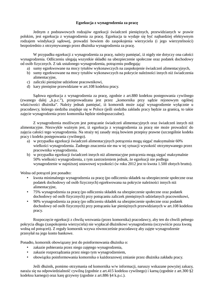Egzekucja z wynagrodzenia za pracę Jednym z podstawowych rodzajów egzekucji świadczeń pieniężnych, przewidzianych w prawie polskim, jest egzekucja z wynagrodzenia za pracę. Egzekucja ta wydaje się być najbardziej efektywnym rodzajem windykacji sądowej, prowadzi bowiem do zaspokojenia wierzyciela (i jego wierzytelności) bezpośrednio z otrzymywanego przez dłużnika wynagrodzenia za pracę. W przypadku egzekucji z wynagrodzenia za pracę, należy pamiętać, iż nigdy nie dotyczy ona całości wynagrodzenia. Odliczeniu ulegają wszystkie składki na ubezpieczenie społeczne oraz podatek dochodowy od osób fizycznych. Z tak ustalonego wynagrodzenia, potrąceniu podlegają: a) sumy egzekwowane na mocy tytułów wykonawczych na zaspokojenie świadczeń alimentacyjnych, b) sumy egzekwowane na mocy tytułów wykonawczych na pokrycie należności innych niż świadczenia alimentacyjne, c) zaliczki pieniężne udzielone pracownikowi, d) kary pieniężne przewidziane w art.108 kodeksu pracy. Sądowa egzekucja z wynagrodzenia za pracę, zgodnie z art.880 kodeksu postępowania cywilnego (zwanego dalej „k.p.c.”), przeprowadzana jest przez „komornika przy sądzie rejonowym ogólnej właściwości dłużnika”. Należy jednak pamiętać, iż komornik może zająć wynagrodzenie wyłącznie u pracodawcy, którego siedziba znajduje się w Polsce (jeśli siedziba zakładu pracy będzie za granicą, to takie zajęcie wynagrodzenia przez komornika będzie niedopuszczalne). Z wynagrodzenia możliwym jest potrącanie świadczeń alimentacyjnych oraz świadczeń innych niż alimentacyjne. Niezwykle ważnym jest, iż egzekucja z wynagrodzenia za pracę nie może prowadzić do zajęcia całości tego wynagrodzenia. Na straży tej zasady stoją bowiem przepisy prawne (szczególnie kodeks pracy i kodeks postępowania cywilnego). a) w przypadku egzekucji świadczeń alimentacyjnych potrącenia mogą sięgać maksymalnie 60% wielkości wynagrodzenia. Żadnego znaczenia nie ma w tej sytuacji wysokość otrzymywanego przez pracownika wynagrodzenia. b) w przypadku egzekucji świadczeń innych niż alimentacyjne potrącenia mogą sięgać maksymalnie 50% wielkości wynagrodzenia, z tym zastrzeżeniem jednak, że egzekucji nie podlega wynagrodzenie w najniższej ustawowej wysokości (w roku 2012 jest to kwota 1.500 złotych brutto). Wolna od potrąceń jest ponadto: • kwota minimalnego wynagrodzenia za pracę (po odliczeniu składek na ubezpieczenie społeczne oraz podatek dochodowy od osób fizycznych) egzekwowana na pokrycie należności innych niż alimentacyjne, • 75% wynagrodzenia za pracę (po odliczeniu składek na ubezpieczenie społeczne oraz podatek dochodowy od osób fizycznych) przy potrącaniu zaliczek pieniężnych udzielanych pracownikowi, • 90% wynagrodzenia za pracę (po odliczeniu składek na ubezpieczenie społeczne oraz podatek dochodowy od osób fizycznych) przy potrącaniu kar pieniężnych przewidzianych w art.108 kodeksu pracy. Rozpoczęcie egzekucji z chwilą wezwania (przez komornika) pracodawcy, aby ten do chwili pełnego pokrycia długu (zaspokojenia wierzyciela) nie wypłacał dłużnikowi wynagrodzenia (oczywiście poza kwotą wolną od potrąceń). Z reguły komornik wzywa równocześnie pracodawcę aby zajęte wynagrodzenie przesyłał na jego konto bankowe. Ponadto, komornik obowiązany jest do poinformowania dłużnika o: • zakazie pobierania przez niego zajętego wynagrodzenia, • zakazie rozporządzania przez niego tym wynagrodzeniem, • obowiązku poinformowania komornika o każdorazowej zmianie przez dłużnika zakładu pracy. Jeśli dłużnik, pomimo otrzymania od komornika w/w informacji, naruszy wskazane powyżej zakazy, naraża się na odpowiedzialność cywilną (zgodnie z art.415 kodeksu cywilnego) i karną (zgodnie z art.300 §2 kodeksu karnego) oraz karę grzywny (zgodnie z art.886 §4 k.p.c.). Po zajęciu w/w kwot wynagrodzenia komornik nie przesyła ich bezpośrednio do wierzycieli/a ale składa do depozytu sądowego. Należy także pamiętać, iż zajęcie wynagrodzenia za pracę przez komornika nie obejmuje wyłącznie wynagrodzenia podstawowego, ale obejmuje także wynagrodzenie za prace zlecone, otrzymane przez pracownika nagrody i premie, zysk i udział w funduszach, dodatki do wynagrodzenia oraz wszelkie inne dochody uzyskiwane w ramach stosunku pracy. Doręczenie przez komornika pracodawcy zawiadomienia o wszczęciu egzekucji sądowej powinno obligatoryjnie zawierać informację o treści tytułu wykonawczego oraz sposobie przeprowadzenia egzekucji. Od tej chwili pracodawca ma prawo do dokonywania wszelkich koniecznych potrąceń z wynagrodzenia dłużnika, zaś sam dłużnik nie ma możliwości pobierania tej zajętej części wynagrodzenia. Wierzyciel ma zaś m.in. prawo do wystąpienia do pracodawcy dłużnika, celem uzyskania informacji odnośnie wysokości pobieranego przez dłużnika wynagrodzenia. Warto również pamiętać, iż w ramach egzekucji z wynagrodzenia pracownika funkcjonuje zasada „ciągłości zajęcia”. Oznacza ona, iż zajęcie wynagrodzenia obowiązuje w dalszym ciągu również w sytucji gdyby po jego zajęciu zakład pracy przeszedł na innego właściciela (jeśli osoba ta wiedziała o zajęciu) bądź nawiązany został z dłużnikiem nowy stosunek pracy. Na sam koniec, wspomnieć należy również o samej egzekucji alimentów. Tak jak zostało to powyżej zainicjowane, w przypadku egzekucji świadczeń alimentacyjnych kwotą możliwą do potrącenia, jest kwota do 60% wynagrodzenia - (a nie 50%, jak w przypadku pozostałych świadczeń). Wierzyciel, w przypadku egzekucji świadczeń alimentacyjnych (w odróżnieniu do egzekucji świadczeń innych niż alimentacyjne), ma prawo do złożenia u pracodawcy dłużnika właściwego wniosku egzekucyjnego wraz z tytułem wykonawczym, celem bezpośredniego otrzymywania świadczeń alimentacyjnych. Sytuacja ta, nie jest dopuszczalna w dwóch sytuacjach: • gdy świa