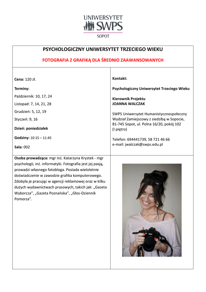 PSYCHOLOGICZNY UNIWERSYTET TRZECIEGO WIEKU FOTOGRAFIA Z GRAFIKĄ DLA ŚREDNIO ZAAWANSOWANYCH Cena: 120 zł. Kontakt: Terminy: Psychologiczny Uniwersytet Trzeciego Wieku Październik: 10, 17, 24 Listopad: 7, 14, 21, 28 Grudzień: 5, 12, 19 Styczeń: 9, 16 Dzień: poniedziałek Godziny: 10:15 – 11:45 Sala: 002 Osoba prowadząca: mgr inż. Katarzyna Krystek - mgr psychologii, inż. informatyki. Fotografia jest jej pasją, prowadzi własnego fotobloga. Posiada wieloletnie doświadczenie w zawodzie grafika komputerowego. Zdobyła je pracując w agencji reklamowej oraz w kilku dużych wydawnictwach prasowych, takich jak: „Gazeta Wyborcza”, „Gazeta Poznańska”, „Głos-Dziennik Pomorza”. Kierownik Projektu JOANNA WALCZAK SWPS Uniwersytet Humanistycznospołeczny Wydział Zamiejscowy z siedzibą w Sopocie, 81-745 Sopot, ul. Polna 16/20, pokój 102 (I piętro) Telefon: 694441739, 58 721 46 66 e-mail: [email protected] O szkoleniu: Tematyka zajęć będzie koncentrować się na: rozszerzeniu wiedzy teoretycznej i praktycznej z zakresu fotografii doskonaleniu umiejętności obsługi komputerowego programu graficznego służącego do korekty i modyfikacji zdjęć. Program szkolenia: - - nabycie umiejętności obsługi aparatu fotograficznego - zapoznanie z jego ustawieniami/możliwościami przyswojenie reguł dotyczących fotografowania ludzi, zwierząt, zdjęć nocnych oraz obiektów w ruchu nauka programu GIMP, który wykorzystywany jest m. in. do obróbki zdjęć – poznanie jego zaawansowanych funkcji w celu nabycia praktycznej umiejętności fotografowania - zgodnie z zasadami sztuki fotografowania, takimi jak: wybór głównego tematu zdjęcia, wykorzystanie światła, kompozycji obrazu - przewidziane są wyjścia w plener przedstawienie możliwości prezentacji własnych prac w internecie np. poprzez wskazanie jak stworzyć własnego bloga tematyka zajęć może ulegać modyfikacji w zależności od potrzeb i zainteresowań osób w nich uczestniczących Korzyści dla osób uczestniczących: Lawina zdjęć zalewa nas dookoła. Facebook, maile, MMS-y... Niemal każdy potrafi zrobić zdjęcie - aparatem, telefonem komórkowym. Wiemy jednak że naciśnięcie spustu migawki nie gwarantuje dobrego efekt końcowego uwiecznianego obrazu. Jak nauczyć się panować nad aparatem, jak poprawnie wykonać zdjęcie? Jak je ulepszyć? Jak zmienić obraz tak aby zachwycił? Jak go zaprezentować? Warsztaty „Fotografia z grafiką” to szansa na uzyskanie odpowiedzi na wyżej postawione pytania.