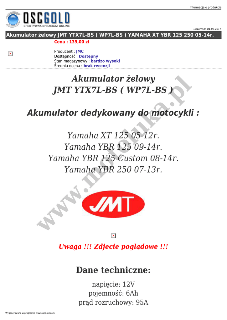 Informacje o produkcie Utworzono 04-03-2017 Akumulator żelowy JMT YTX7L-BS ( WP7L-BS ) YAMAHA XT YBR 125 250 05-14r. Cena : 139,00 zł Producent : JMC Dostępność : Dostępny Stan magazynowy : bardzo wysoki Średnia ocena : brak recenzji a. pl Akumulator żelowy JMT YTX7L-BS ( WP7L-BS ) uk Akumulator dedykowany do motocykli : w w w .m ot ol Yamaha XT 125 05-12r. Yamaha YBR 125 09-14r. Yamaha YBR 125 Custom 08-14r. Yamaha YBR 250 07-13r. Uwaga !!! Zdjecie poglądowe !!! Dane techniczne: napięcie: 12V pojemność: 6Ah prąd rozruchowy: 95A Wygenerowano w programie www.oscGold.com w w w .m ot ol uk a. pl typ: żelowy polaryzacja: prawy plus wymiary: 114x70x130 mm (szerokość/głębokość/wysokość) waga: 2.41 kg