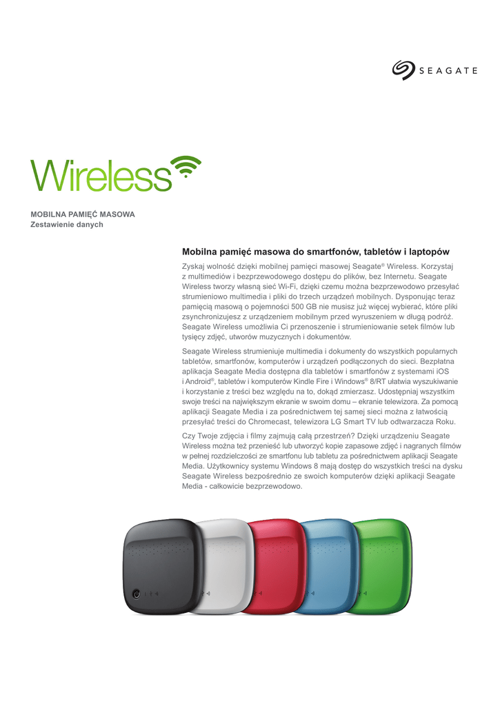 MOBILNA PAMIĘĆ MASOWA Zestawienie danych Mobilna pamięć masowa do smartfonów, tabletów i laptopów Zyskaj wolność dzięki mobilnej pamięci masowej Seagate® Wireless. Korzystaj z multimediów i bezprzewodowego dostępu do plików, bez Internetu. Seagate Wireless tworzy własną sieć Wi-Fi, dzięki czemu można bezprzewodowo przesyłać strumieniowo multimedia i pliki do trzech urządzeń mobilnych. Dysponując teraz pamięcią masową o pojemności 500 GB nie musisz już więcej wybierać, które pliki zsynchronizujesz z urządzeniem mobilnym przed wyruszeniem w długą podróż. Seagate Wireless umożliwia Ci przenoszenie i strumieniowanie setek filmów lub tysięcy zdjęć, utworów muzycznych i dokumentów. Seagate Wireless strumieniuje multimedia i dokumenty do wszystkich popularnych tabletów, smartfonów, komputerów i urządzeń podłączonych do sieci. Bezpłatna aplikacja Seagate Media dostępna dla tabletów i smartfonów z systemami iOS i Android®, tabletów i komputerów Kindle Fire i Windows® 8/RT ułatwia wyszukiwanie i korzystanie z treści bez względu na to, dokąd zmierzasz. Udostępniaj wszystkim swoje treści na największym ekranie w swoim domu – ekranie telewizora. Za pomocą aplikacji Seagate Media i za pośrednictwem tej samej sieci można z łatwością przesyłać treści do Chromecast, telewizora LG Smart TV lub odtwarzacza Roku. Czy Twoje zdjęcia i filmy zajmują całą przestrzeń? Dzięki urządzeniu Seagate Wireless można też przenieść lub utworzyć kopie zapasowe zdjęć i nagranych filmów w pełnej rozdzielczości ze smartfonu lub tabletu za pośrednictwem aplikacji Seagate Media. Użytkownicy systemu Windows 8 mają dostęp do wszystkich treści na dysku Seagate Wireless bezpośrednio ze swoich komputerów dzięki aplikacji Seagate Media - całkowicie bezprzewodowo. PAMIĘĆ MASOWA MOBILE Parametry Opakowanie detaliczne Wymiary produktu Wymiary opakowania Wymiary kartonu zbiorczego Wymiary palety Długość (mm) 24,5 51 199 1219 Szerokość (mm) 125,36 153 164 1016 Wysokość (mm) 125,36 166 171 1169 Waga (kg) 0,281 0,383 1,329 303,89 Ilości Opakowania w kartonie zbiorczym 3 Liczba kartonów zbiorczych na palecie 210 Liczba warstw palety 6 Liczba jednostek w palecie 630 Wymagania systemowe Tablety i komputery Kindle Fire HD i Windows 8/RT, z sytemami Windows® 8, Windows 7, Mac OS® X 10.7 lub nowszym, iOS 7.0 lub nowszym, Android® 4.0 lub nowszym Zawartość opakowania 1 Urządzenie mobilne pamięci masowej Seagate Wireless Skrócona instrukcja obsługi Kabel USB 2-letnia ograniczona gwarancja Region Produkt Kolor Pojemność1 Numer modelu Kod EAN EMEA Wireless Czarny 500 GB STDC500205 7636490065224 Kod UPC opakowania zbiorczego 10763649066673 EMEA Wireless Biały 500 GB STDC500206 7636490065248 10763649066697 Na całym świecie Wireless Niebieski 500 GB STDC500400 7636490065354 10763649066802 Na całym świecie Wireless Czerwony 500 GB STDC500402 7636490065378 10763649066826 Na całym świecie Wireless Zielony 500 GB STDC500401 7636490065361 10763649066819 W przypadku oznaczania pojemności dysków, jeden gigabajt (oznaczany także jako „GB”) jest równy jednemu miliardowi bajtów. seagate.com AMERYKA PŁN. I PŁD. AZJA/PACYFIK EUROPA, BLISKI WSCHÓD I AFRYKA Seagate Technology LLC 10200 South De Anza Boulevard, Cupertino, California 95014, USA, +1 408 658 1000 Seagate Singapore International Headquarters Pte. Ltd. 7000 Ang Mo Kio Avenue 5, Singapur 569877, +65 6485 3888 Seagate Technology SAS 16-18 rue du Dôme, 92100 Boulogne-Billancourt, Francja, +33 1 41 86 10 00 © 2015 Seagate Technology LLC. Wszelkie prawa zastrzeżone. Wydrukowano w USA. Seagate, Seagate Technology i logo Wave są zastrzeżonymi znakami towarowymi firmy Seagate Technology LLC w Stanach Zjednoczonych i/lub innych krajach. Wszystkie pozostałe znaki towarowe i zastrzeżone znaki towarowe należą do odpowiednich właścicieli. W przypadku oznaczania pojemności dysków, jeden gigabajt (oznaczany także jako „GB”) jest równy jednemu miliardowi bajtów, a jeden terabajt (oznaczany także jako „TB”) jest równy jednemu bilionowi bajtów. W systemie operacyjnym komputera mogą być używane różne standardy pomiarowe i raportowana pojemność może być mniejsza. Ponadto część podanej pojemności jest używana do formatowania oraz w innych celach i może nie być dostępna do przechowywania danych. Za przestrzeganie wszelkich obowiązujących praw autorskich odpowiedzialność ponosi użytkownik. Ilościowe dane dotyczące używania w różnych zastosowaniach mają charakter przykładowy. Rzeczywiste ilości mogą się różnić w zależności od wielu czynników, takich jak rozmiar plików, ich format oraz używane funkcje i aplikacje. Rzeczywiste wartości danych mogą się różnić w zależności od środowiska operacyjnego i innych czynników. Firma Seagate zastrzega sobie prawo do wprowadzania zmian w ofercie produktów lub w ich parametrach bez powiadomienia. DS1840.1-1501PL