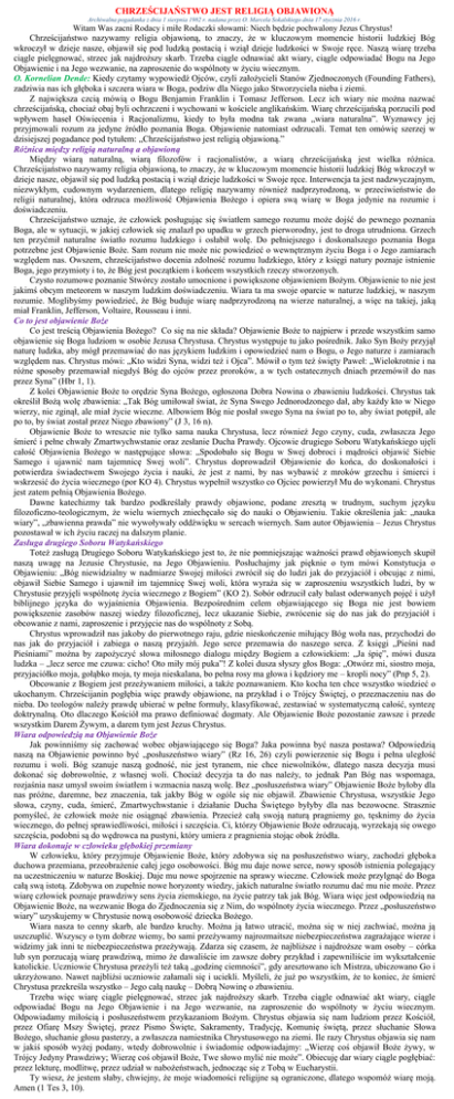 CHRZEŚCIJAŃSTWO JEST RELIGIĄ OBJAWIONĄ Archiwalna pogadanka z dnia 1 sierpnia 1982 r. nadana przez O. Marcela Sokalskiego dnia 17 stycznia 2016 r. Witam Was zacni Rodacy i miłe Rodaczki słowami: Niech będzie pochwalony Jezus Chrystus! Chrześcijaństwo nazywamy religia objawioną, to znaczy, że w kluczowym momencie historii ludzkiej Bóg wkroczył w dzieje nasze, objawił się pod ludzką postacią i wziął dzieje ludzkości w Swoje ręce. Naszą wiarę trzeba ciągle pielęgnować, strzec jak najdroższy skarb. Trzeba ciągle odnawiać akt wiary, ciągle odpowiadać Bogu na Jego Objawienie i na Jego wezwanie, na zaproszenie do wspólnoty w życiu wiecznym. O. Kornelian Dende: Kiedy czytamy wypowiedź Ojców, czyli założycieli Stanów Zjednoczonych (Founding Fathers), zadziwia nas ich głęboka i szczera wiara w Boga, podziw dla Niego jako Stworzyciela nieba i ziemi. Z największa czcią mówią o Bogu Benjamin Franklin i Tomasz Jefferson. Lecz ich wiary nie można nazwać chrześcijańską, chociaż obaj byli ochrzczeni i wychowani w kościele anglikańskim. Wiarę chrześcijańską porzucili pod wpływem haseł Oświecenia i Racjonalizmu, kiedy to była modna tak zwana „wiara naturalna”. Wyznawcy jej przyjmowali rozum za jedyne źródło poznania Boga. Objawienie natomiast odrzucali. Temat ten omówię szerzej w dzisiejszej pogadance pod tytułem: „Chrześcijaństwo jest religią objawioną.” Różnica między religią naturalną a objawioną Między wiarą naturalną, wiarą filozofów i racjonalistów, a wiarą chrześcijańską jest wielka różnica. Chrześcijaństwo nazywamy religia objawioną, to znaczy, że w kluczowym momencie historii ludzkiej Bóg wkroczył w dzieje nasze, objawił się pod ludzką postacią i wziął dzieje ludzkości w Swoje ręce. Interwencja ta jest nadzwyczajnym, niezwykłym, cudownym wydarzeniem, dlatego religię nazywamy również nadprzyrodzoną, w przeciwieństwie do religii naturalnej, która odrzuca możliwość Objawienia Bożego i opiera swą wiarę w Boga jedynie na rozumie i doświadczeniu. Chrześcijaństwo uznaje, że człowiek posługując się światłem samego rozumu może dojść do pewnego poznania Boga, ale w sytuacji, w jakiej człowiek się znalazł po upadku w grzech pierworodny, jest to droga utrudniona. Grzech ten przyćmił naturalne światło rozumu ludzkiego i osłabił wolę. Do pełniejszego i doskonalszego poznania Boga potrzebne jest Objawienie Boże. Sam rozum nie może nic powiedzieć o wewnętrznym życiu Boga i o Jego zamiarach względem nas. Owszem, chrześcijaństwo docenia zdolność rozumu ludzkiego, który z księgi natury poznaje istnienie Boga, jego przymioty i to, że Bóg jest początkiem i końcem wszystkich rzeczy stworzonych. Czysto rozumowe poznanie Stwórcy zostało umocnione i powiększone objawieniem Bożym. Objawienie to nie jest jakimś obcym meteorem w naszym ludzkim doświadczeniu. Wiara ta ma swoje oparcie w naturze ludzkiej, w naszym rozumie. Moglibyśmy powiedzieć, że Bóg buduje wiarę nadprzyrodzoną na wierze naturalnej, a więc na takiej, jaką miał Franklin, Jefferson, Voltaire, Rousseau i inni. Co to jest objawienie Boże Co jest treścią Objawienia Bożego? Co się na nie składa? Objawienie Boże to najpierw i przede wszystkim samo objawienie się Boga ludziom w osobie Jezusa Chrystusa. Chrystus występuje tu jako pośrednik. Jako Syn Boży przyjął naturę ludzka, aby mógł przemawiać do nas językiem ludzkim i opowiedzieć nam o Bogu, o Jego naturze i zamiarach względem nas. Chrystus mówi: „Kto widzi Syna, widzi też i Ojca”. Mówił o tym też święty Paweł: „Wielokrotnie i na różne sposoby przemawiał niegdyś Bóg do ojców przez proroków, a w tych ostatecznych dniach przemówił do nas przez Syna” (Hbr 1, 1). Z kolei Objawienie Boże to orędzie Syna Bożego, ogłoszona Dobra Nowina o zbawieniu ludzkości. Chrystus tak określił Bożą wolę zbawienia: „Tak Bóg umiłował świat, że Syna Swego Jednorodzonego dał, aby każdy kto w Niego wierzy, nie zginął, ale miał życie wieczne. Albowiem Bóg nie posłał swego Syna na świat po to, aby świat potępił, ale po to, by świat został przez Niego zbawiony” (J 3, 16 n). Objawienie Boże to wreszcie nie tylko sama nauka Chrystusa, lecz również Jego czyny, cuda, zwłaszcza Jego śmierć i pełne chwały Zmartwychwstanie oraz zesłanie Ducha Prawdy. Ojcowie drugiego Soboru Watykańskiego ujęli całość Objawienia Bożego w następujące słowa: „Spodobało się Bogu w Swej dobroci i mądrości objawić Siebie Samego i ujawnić nam tajemnicę Swej woli”. Chrystus doprowadził Objawienie do końca, do doskonałości i potwierdza świadectwem Swojego życia i nauki, że jest z nami, by nas wybawić z mroków grzechu i śmierci i wskrzesić do życia wiecznego (por KO 4). Chrystus wypełnił wszystko co Ojciec powierzył Mu do wykonani. Chrystus jest zatem pełnią Objawienia Bożego. Dawne katechizmy tak bardzo podkreślały prawdy objawione, podane zresztą w trudnym, suchym języku filozoficzno-teologicznym, że wielu wiernych zniechęcało się do nauki o Objawieniu. Takie określenia jak: „nauka wiary”, „zbawienna prawda” nie wywoływały oddźwięku w sercach wiernych. Sam autor Objawienia – Jezus Chrystus pozostawał w ich życiu raczej na dalszym planie. Zasługa drugiego Soboru Watykańskiego Toteż zasługą Drugiego Soboru Watykańskiego jest to, że nie pomniejszając ważności prawd objawionych skupił naszą uwagę na Jezusie Chrystusie, na Jego Objawieniu. Posłuchajmy jak pięknie o tym mówi Konstytucja o Objawieniu: „Bóg niewidzialny w nadmiarze Swojej miłości zwrócił się do ludzi jak do przyjaciół i obcując z nimi, objawił Siebie Samego i ujawnił im tajemnicę Swej woli, która wyraża się w zaproszeniu wszystkich ludzi, by w Chrystusie przyjęli wspólnotę życia wiecznego z Bogiem” (KO 2). Sobór odrzucił cały balast oderwanych poję