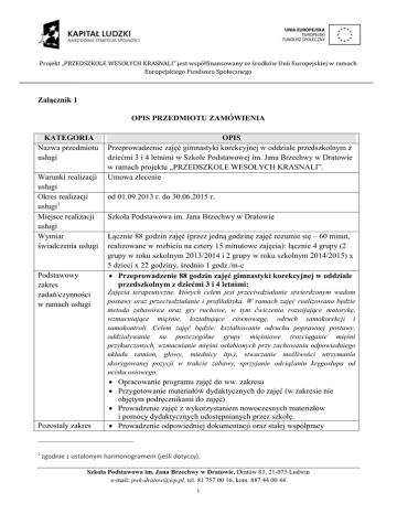 Projekt „PRZEDSZKOLE WESOŁYCH KRASNALI” jest współfinansowany ze środków Unii Europejskiej w ramach Europejskiego Funduszu Społecznego Załącznik 1 OPIS PRZEDMIOTU ZAMÓWIENIA KATEGORIA Nazwa przedmiotu usługi Warunki realizacji usługi Okres realizacji usługi1 Miejsce realizacji usługi Wymiar świadczenia usługi Podstawowy zakres zadań/czynności w ramach usługi Pozostały zakres 1 OPIS Przeprowadzenie zajęć gimnastyki korekcyjnej w oddziale przedszkolnym z dziećmi 3 i 4 letnimi w Szkole Podstawowej im. Jana Brzechwy w Dratowie w ramach projektu „PRZEDSZKOLE WESOŁYCH KRASNALI”. Umowa zlecenie od 01.09.2013 r. do 30.06.2015 r. Szkoła Podstawowa im. Jana Brzechwy w Dratowie Łącznie 88 godzin zajęć (przez jedną godzinę zajęć rozumie się – 60 minut, realizowane w rozbiciu na cztery 15 minutowe zajęcia): łącznie 4 grupy (2 grupy w roku szkolnym 2013/2014 i 2 grupy w roku szkolnym 2014/2015) x 5 dzieci x 22 godziny, średnio 1 godz./m-c Przeprowadzenie 88 godzin zajęć gimnastyki korekcyjnej w oddziale przedszkolnym z dziećmi 3 i 4 letnimi: Zajęcia terapeutyczne, których celem jest przeciwdziałanie stwierdzonym wadom postawy oraz przeciwdziałanie i profilaktyka. W ramach zajęć realizowana będzie metoda zabawowa oraz gry ruchowe, w tym ćwiczenia rozwijające motorykę, wzmacniające mięśnie, kształtujące równowagę, odruch samokorekcji i samokontroli. Celem zajęć będzie: kształtowanie odruchu poprawnej postawy, oddziaływanie na poszczególne grupy mięśniowe (rozciąganie mięśni przykurczonych, wzmacnianie mięśni osłabionych przy zachowaniu odpowiedniego układu ramion, głowy, miednicy itp.), stwarzanie możliwości utrzymania skorygowanej pozycji w trakcie zabawy, sprzyjanie odciążaniu kręgosłupa od ucisku osiowego. Opracowanie programu zajęć do ww. zakresu Przygotowanie materiałów dydaktycznych do zajęć (w zakresie nie objętym podręcznikami do zajęć) Prowadzenie zajęć z wykorzystaniem nowoczesnych materiałów i pomocy dydaktycznych udostępnianych przez szkołę. Prowadzenie odpowiedniej dokumentacji oraz stałej współpracy zgodnie z ustalonym harmonogramem (jeśli dotyczy). Szkoła Podstawowa im. Jana Brzechwy w Dratowie, Dratów 83, 21-075 Ludwin e-mail: [email protected], tel. 81 757 00 16, kom. 887 44 00 44 1 Projekt „PRZEDSZKOLE WESOŁYCH KRASNALI” jest współfinansowany ze środków Unii Europejskiej w ramach Europejskiego Funduszu Społecznego zadań/czynności Wymagania w stosunku do Wykonawcy Pozostałe wymagania Inne z personelem projektu „PRZEDSZKOLE WESOŁYCH KRASNALI” Prowadzenie systematycznej oceny postępów uczestników projektu Bieżącego informowania Zamawiającego o: - wszystkich przypadkach nieobecności uczestników projektu, - rezygnacji uczestników projektu, - problemach zgłaszanych przez uczestników projektu, - ewaluacji prowadzonych przez siebie zajęć. Wykształcenie wyższe Stopień awansu zawodowego: minimum nauczyciel kontraktowy Przygotowanie pedagogiczne do prowadzenia zajęć z dziećmi Minimum 2 lata doświadczenia zawodowego w pracy w szkole i przygotowanie do prowadzenia gimnastyki korekcyjnej Znajomość metodyki pracy z dziećmi w wieku przedszkolnym Posiadanie niezbędnej wiedzy lub doświadczenia w realizacji zajęć w ww. zakresie Osoby zatrudnione w instytucji zaangażowanej w realizację PO KL, tj. w Instytucji Zarządzającej, Instytucji Pośredniczącej, Instytucji Pośredniczącej II stopnia, regionalnym Ośrodku EFS, i Krajowej Instytucji Wspomagającej, mogą ubiegać się o prowadzenie zajęć wyłącznie w sytuacji, w której nie zachodzi konflikt interesów lub podwójne finansowanie. Osoby zaangażowane w realizację zadań w więcej niż jednym projekcie mogą ubiegać się o prowadzenie zajęć wyłącznie, gdy obciążenie z tego wynikające nie będzie przekraczać 240 godzin/m-c oraz osoba ta prowadzić będzie ewidencję godzin i zadań realizowanych w ramach wszystkich projektów i udostępniać ją będzie Zamawiającemu (w okresie realizacji usługi). Nie dotyczy Szkoła Podstawowa im. Jana Brzechwy w Dratowie, Dratów 83, 21-075 Ludwin e-mail: [email protected], tel. 81 757 00 16, kom. 887 44 00 44 2 Projekt „PRZEDSZKOLE WESOŁYCH KRASNALI” jest współfinansowany ze środków Unii Europejskiej w ramach Europejskiego Funduszu Społecznego Załącznik 2 ………………………………….. Imię i nazwisko lub pieczęć firmy ………………………………, …………………….. (miejscowość i data) Do Szkoły Podstawowej im. Jana Brzechwy w Dratowie Dratów 83, 21-075 Ludwin [email protected] Odpowiedź na rozeznanie rynku 1. Przedmiot zamówienia: Oferowana cena Jednostka za 1 za cały Ilość miary godzinę przedmiot brutto zamówienia L.p. Opis przedmiotu zamówienia Przeprowadzenie 88 godzin zajęć gimnastyki korekcyjnej w oddziale przedszkolnym z dziećmi 3 i 4 letnimi w Szkole Podstawowej im. Jana Brzechwy w Dratowie w ramach projektu „PRZEDSZKOLE WESOŁYCH KRASNALI”: 1. Zajęcia terapeutyczne, których celem jest przeciwdziałanie stwierdzonym wadom postawy oraz przeciwdziałanie i profilaktyka. W ramach zajęć realizowana będzie metoda zabawowa oraz gry ruchowe, w tym ćwiczenia rozwijające motorykę, wzmacniające mięśnie, kształtujące równowagę, odruch samokorekcji i samokontroli. Celem zajęć godz. będzie: kształtowanie odruchu poprawnej postawy, oddziaływanie na poszczególne grupy mięśniowe (rozciąganie mięśni przykurczonych, wzmacnianie mięśni osłabionych przy zachowaniu odpowiedniego układu ramion, głowy, miednicy itp.), stwarzanie możliwości utrzymania skorygowanej pozycji w trakcie zabawy, sprzyjanie odciążaniu kręgosłupa od ucisku osiowego. 88 Umowa zlecenie: 88 godzin zajęć (przez jedną godzinę zajęć rozumie się – 60 minut, realizowane w rozbiciu na cztery 15 minutowe Szkoła Podstawowa im. Jana Brzechwy w Dratowie, Dratów 83, 21-075 Ludwin e-mail: 