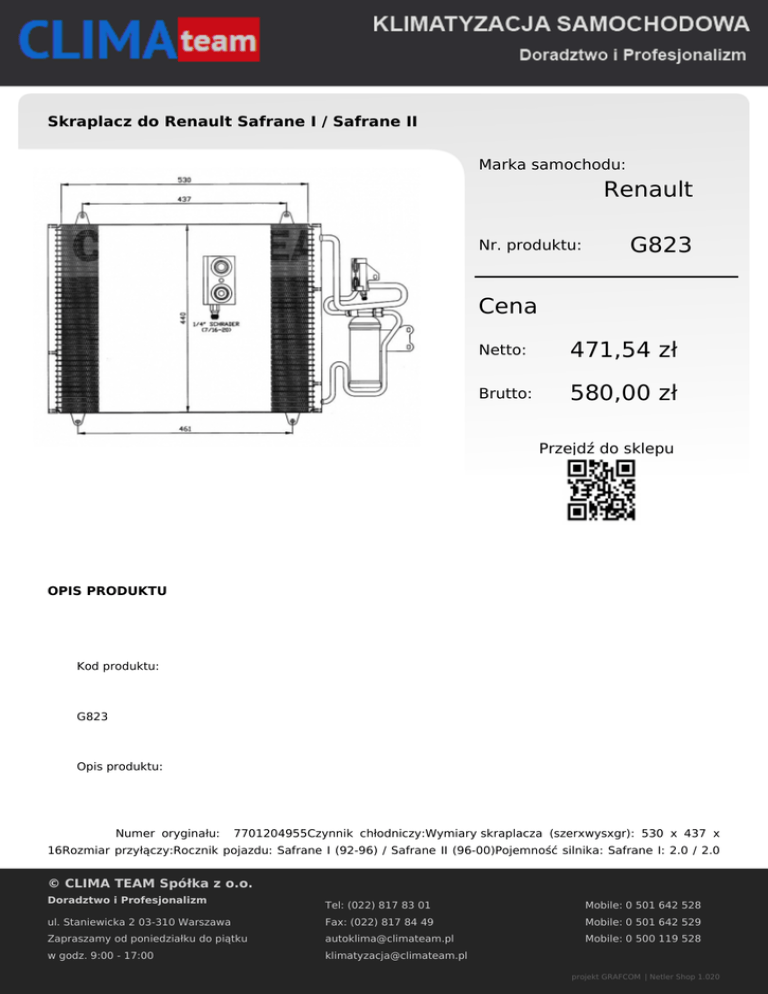 Skraplacz do Renault Safrane I / Safrane II Marka samochodu: Renault Nr. produktu: G823 Cena Netto: 471,54 zł Brutto: 580,00 zł Przejdź do sklepu OPIS PRODUKTU Kod produktu: G823 Opis produktu: Numer oryginału: 7701204955Czynnik chłodniczy:Wymiary skraplacza (szerxwysxgr): 530 x 437 x 16Rozmiar przyłączy:Rocznik pojazdu: Safrane I (92-96) / Safrane II (96-00)Pojemność silnika: Safrane I: 2.0 / 2.0 © CLIMA TEAM Spółka z o.o. Doradztwo i Profesjonalizm Tel: (022) 817 83 01 Mobile: 0 501 642 528 ul. Staniewicka 2 03-310 Warszawa Fax: (022) 817 84 49 Mobile: 0 501 642 529 Zapraszamy od poniedziałku do piątku [email protected] Mobile: 0 500 119 528 w godz. 9:00 - 17:00 [email protected] projekt GRAFCOM | Netler Shop 1.020 12V / 2.2 / 3.0 V6 / 3.0 V6 4x4 / 3.0 Biturbo 4x4Safrane II: 2.0 16V / 2.5 20V Skraplacz zintegrowany z filtrem osuszaczem posiada 2 letnią gwarancję. © CLIMA TEAM Spółka z o.o. Doradztwo i Profesjonalizm Tel: (022) 817 83 01 Mobile: 0 501 642 528 ul. Staniewicka 2 03-310 Warszawa Fax: (022) 817 84 49 Mobile: 0 501 642 529 Zapraszamy od poniedziałku do piątku [email protected] Mobile: 0 500 119 528 w godz. 9:00 - 17:00 [email protected] projekt GRAFCOM | Netler Shop 1.020