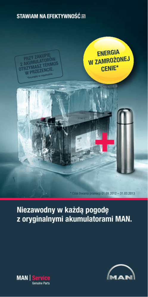 kupie przy zaatorów l u 2 akum sz termos . otrzyma w przezencie laminie. ENERGIA NEJ W ZAMROŻO CENIE* ły w regu *Szczegó + * Czas trwania promocji 01.09.2012 – 31.03.2013 Niezawodny w każdą pogodę z oryginalnymi akumulatorami MAN. Maksymalna skuteczność nawet w najniższych temperaturach. Nie przegap okazji, aby móc korzystać z oryginalnych akumulatorów MAN Niższy czas niedostępności pojazdu, mniejsza utrata przychodów – upewnij się, że Twój pojazd jest gotowy do zimy! Od 01.09.2012 do 13.03.2013 oferujemy sezonową obniżkę cen na oryginalne akumulatory MAN. an Akumulator m 175Ah ! Taniej o 23% Jeśli oczekujesz najwyższej wydajności, niezawodności i trwałości – oryginalne akumulatory MAN, wykonane w innowacyjnej technologii ołowiowo-wapniowo-srebrowej (PAG), są najlepszym wyborem. Ograniczenie zużycia elektrolitów gwarantuje wyjątkowo niski stopień samorozładowania. Oryginalne akumulatory MAN nie wymagają przeglądów ani konserwacji, a wskaźnik „charge eye” umożliwia łatwą kontrolę stanu naładowania. Akumulatory MAN - korzyści dla kienta ■■ Niezawodny start w każdą pogodę poprzez szybki pobór prądu. ■■ Dłuższa żywotność dzięki niskiemu stopniowi samorozładowania. ■■ Wysoka odporność na wstrząsy i wibracje oraz stabilność dzięki wyjątkowo trwałej i mocnej konstrukcji. ■■ Zapewniają bezpieczeństwo dzięki zoptymalizowanej konstrukcji pokrywy labiryntowej oraz centralnemu sywstemowi odgazowania. Zapewnia to, że oryginalne akumulatory MAN są odporne na zalanie, przecieki a gazy odprowadzane są w bezpieczny sposób dla ludzi i sprzętu. ■■ Oryginalne akumulatory MAN oferują niezawodność zarówno w ruchu długodystansowym, lokalnym jak i w ciężkiej pracy w terenie - w każdych warunkach. Nr kat. Opis części Cena netto* [zł] Taniej o 07.97020-0882 Akumulator 88Ah 390,40 zł 18% 07.97020-1552 Akumulator 155Ah 617,70 zł 23% 07.97020-1752 Akumulator 175Ah 706,50 zł 23% 07.97020-2252 Akumulator 225Ah 897,60 zł 23% * Sugerowana cena detaliczna netto może ulec zmianie w przypadku znaczącej zmiany kursu EUR / ZŁ. Oferta ważna do odwołania lub do wyczerpania zapasów Tekst i ilustracje nie są wiążące. Zastrzegamy sobie prawo do wprowadzania zmian spowodowanych postępem technicznym. MAN Truck & Bus Polska Sp. z o.o. Al. Katowicka 9, Wolica 05-830 Nadarzyn www.mantruckandbus.pl Spółka Grupy MAN Truck & Bus