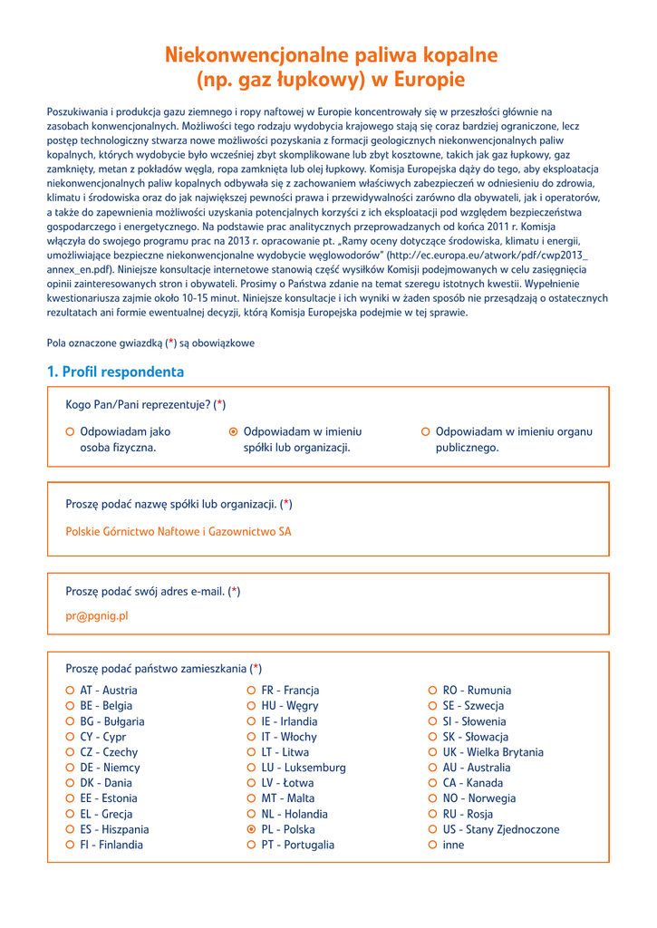 Niekonwencjonalne paliwa kopalne (np. gaz łupkowy) w Europie Poszukiwania i produkcja gazu ziemnego i ropy naftowej w Europie koncentrowały się w przeszłości głównie na zasobach konwencjonalnych. Możliwości tego rodzaju wydobycia krajowego stają się coraz bardziej ograniczone, lecz postęp technologiczny stwarza nowe możliwości pozyskania z formacji geologicznych niekonwencjonalnych paliw kopalnych, których wydobycie było wcześniej zbyt skomplikowane lub zbyt kosztowne, takich jak gaz łupkowy, gaz zamknięty, metan z pokładów węgla, ropa zamknięta lub olej łupkowy. Komisja Europejska dąży do tego, aby eksploatacja niekonwencjonalnych paliw kopalnych odbywała się z zachowaniem właściwych zabezpieczeń w odniesieniu do zdrowia, klimatu i środowiska oraz do jak największej pewności prawa i przewidywalności zarówno dla obywateli, jak i operatorów, a także do zapewnienia możliwości uzyskania potencjalnych korzyści z ich eksploatacji pod względem bezpieczeństwa gospodarczego i energetycznego. Na podstawie prac analitycznych przeprowadzanych od końca 2011 r. Komisja włączyła do swojego programu prac na 2013 r. opracowanie pt. „Ramy oceny dotyczące środowiska, klimatu i energii, umożliwiające bezpieczne niekonwencjonalne wydobycie węglowodorów” (http://ec.europa.eu/atwork/pdf/cwp2013_ annex_en.pdf). Niniejsze konsultacje internetowe stanowią część wysiłków Komisji podejmowanych w celu zasięgnięcia opinii zainteresowanych stron i obywateli. Prosimy o Państwa zdanie na temat szeregu istotnych kwestii. Wypełnienie kwestionariusza zajmie około 10-15 minut. Niniejsze konsultacje i ich wyniki w żaden sposób nie przesądzają o ostatecznych rezultatach ani formie ewentualnej decyzji, którą Komisja Europejska podejmie w tej sprawie. Pola oznaczone gwiazdką (*) są obowiązkowe 1. Profil respondenta Kogo Pan/Pani reprezentuje? (*) Odpowiadam jako osoba fizyczna. Odpowiadam w imieniu spółki lub organizacji. Odpowiadam w imieniu organu publicznego. Proszę podać nazwę spółki lub organizacji. (*) Polskie Górnictwo Naftowe i Gazownictwo SA Proszę podać swój adres e-mail. (*) [email protected] Proszę podać państwo zamieszkania (*) AT - Austria BE - Belgia BG - Bułgaria CY - Cypr CZ - Czechy DE - Niemcy DK - Dania EE - Estonia EL - Grecja ES - Hiszpania FI - Finlandia FR - Francja HU - Węgry IE - Irlandia IT - Włochy LT - Litwa LU - Luksemburg LV - Łotwa MT - Malta NL - Holandia PL - Polska PT - Portugalia RO - Rumunia SE - Szwecja SI - Słowenia SK - Słowacja UK - Wielka Brytania AU - Australia CA - Kanada NO - Norwegia RU - Rosja US - Stany Zjednoczone inne W razie wyboru odpowiedzi „Inne” proszę podać nazwę Państwa (*) nie dotyczy Proszę podać imię i nazwisko (*) Szymon Dobrzyński Proszę podać swój adres e-mail. (*) [email protected] Czy odpowiada Pan/Pani w imieniu organizacji ogólnounijnej? (*) Tak. Nie. Jeśli nie, proszę podać nazwę państwa, w którym znajduje się główna siedziba Pani/Pani organizacji? (*) AT - Austria BE - Belgia BG - Bułgaria CY - Cypr CZ - Czechy DE - Niemcy DK - Dania EE - Estonia EL - Grecja ES - Hiszpania FI - Finlandia FR - Francja HU - Węgry IE - Irlandia IT - Włochy LT - Litwa LU - Luksemburg LV - Łotwa MT - Malta NL - Holandia PL - Polska PT - Portugalia RO - Rumunia SE - Szwecja SI - Słowenia SK - Słowacja UK - Wielka Brytania AU - Australia CA - Kanada NO - Norwegia RU - Rosja US - Stany Zjednoczone inne W razie wyboru odpowiedzi „Inne” proszę podać nazwę. (*) nie dotyczy Proszę wybrać opis, który najlepiej pasuje do Pana/Pani organizacji: (*) spółka, stowarzyszenie branżowe lub handlowe, instytucja akademicka, pozarządowa organizacja zajmująca się ochroną środowiska lub społeczna organizacja pozarządowa, organizacja międzyrządowa, inna organizacja. W razie wyboru odpowiedzi „inna organizacja” proszę podać nazwę. (*) nie dotyczy Pani/Pana spółka działa głównie w następującym sektorze: (*) ropa naftowa i gaz, węgiel, energetyka jądrowa, energia odnawialna, wychwytywanie i składowanie dwutlenku węgla, efektywność energetyczna, dostawy materiałów, technologii sprzętu lub usług dla sektora ropy naftowej i gazu, dostawy materiałów, technologii sprzętu lub usług dla innego sektora, W razie wyboru odpowiedzi „inny sektor” proszę podać nazwę. (*) nie dotyczy Proszę podać liczbę pracowników w Pana/Pani spółce.* Pomiędzy 1 i 49, pomiędzy 50 i 249, 250 i więcej. Proszę podać obroty Pana/Pani spółki.* Maksymalnie 10 mln euro, ponad 10 mln euro, lecz maksymalnie 50 mln euro, ponad 50 mln euro. W razie wyboru odpowiedzi „inne” proszę podać nazwę.* Nie dotyczy obrót energią, inwestycje, ubezpieczenia, sektor energochłonny, inny sektor. Jeżeli nie wskaże Pan/Pani inaczej, treść Pana/Pani odpowiedzi zostanie opublikowana na stronie internetowej Komisji. Proszę zaznaczyć tutaj, jeżeli chciałby/-aby Pan/Pani zachować anonimowość.* Wyrażam zgodę na publikację treści odpowiedzi w obecnej formie. Proszę o zachowanie anonimowości moich odpowiedzi. 2. Ogólne postrzeganie niekonwencjonalnych paliw kopalnych (np. gazu łupkowego) Które z poniższych stwierdzeń najlepiej odzwierciedla Pana/Pani ogólną opinię na temat niekonwencjonalnych paliw kopalnych (np. gazu łupkowego)?* Uważam, że niekonwencjonalne paliwa kopalne (np. gaz łupkowy) powinny być mimo wszystko eksploatowane w Europie. Uważam, że niekonwencjonalne paliwa kopalne (np. gaz łupkowy) powinny być eksploatowane w Europie wyłącznie pod warunkiem istnienia właściwych zabezpieczeń w odniesieniu do zdrowia i środowiska. Uważam, że w Europie wcale nie należy wydobywać niekonwencjonalnych paliw kopalnych (np. gazu łupkowego). Jak dotąd nie mam zdania. 3. Główne potencjalne szanse i wyzwania W przypadku każdego obszaru proszę określić poziom korzyści, jakich oczekuje Pan/Pani w związku z eksploatacją n