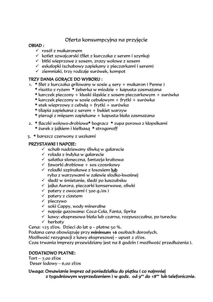 Oferta konsumpcyjna na przyjęcie OBIAD : rosół z makaronem kotlet szwajcarski (filet z kurczaka z serem i szynką) bitki wieprzowe z sosem, zrazy wołowe z sosem eskalopki (schabowy zapiekany z pieczarkami i serem) ziemniaki, trzy rodzaje surówek, kompot TRZY DANIA GORĄCE DO WYBORU : 1. * filet z kurczaka grilowany w sosie 4 sery + makaron ( Penne ) * risotto z ryżem * żeberka w miodzie + kapusta zasmażana * karczek pieczony + kluski śląskie z sosem pieczarkowym + surówka * karczek pieczony w sosie cebulowym + frytki + surówka * stek wieprzowy z cebulą + frytki + surówka * tilapia zapiekana z serem + bukiet warzyw * pierogi z mięsem zapiekane + kapusta biała zasmażana 2. * flaczki wołowo-drobiowe* bogracz * zupa porowa z klopsikami * żurek z jajkiem i kiełbasą * strogonoff 3. * barszcz czerwony z uszkami PRZYSTAWKI I NAPOJE: schab nadziewany śliwką w galarecie rolada z indyka w galarecie sałatka słoneczna, fantazja krabowa faworki drobiowe + sos czosnkowy roladki szpinakowe z łososiem lub ryba z warzywami w zalewie słodko-kwaśnej śledź w śmietanie, śledź po kaszubsku jajka Aurora, pieczarki konserwowe, oliwki patery z owocami ( 300 g./os ) patery z ciastem pieczywo soki Cappy, wody mineralne napoje gazowane: Coca-Cola, Fanta, Sprite kawy: ekspresowa biała lub czarna, rozpuszczalna, po turecku herbaty Cena: 125 zł/os. Dzieci do lat 9 – płatne 50 %. Podana cena obowiązuje przy minimum 16 osobach dorosłych. Możliwość rezygnacji z kawy ekspresowej – upust 2 zł/os. Czas trwania imprezy przewidziany jest na 8 godzin ( możliwość przedłużenia ). DODATKOWO PŁATNE: Tort – 7,00 zł/os Deser lodowy – 6,00 zł/os Uwaga: Omawianie imprez od poniedziałku do piątku ( co najmniej z tygodniowym wyprzedzeniem ) w godz. od 900 do 1800 lub telefonicznie.