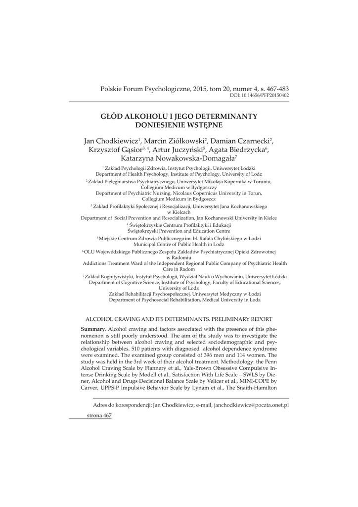 ȱȱ¢£ǰȱŘŖŗśǰȱȱŘŖǰȱȱŚǰȱǯȱŚŜŝȬŚŞř DZȱŗŖǯŗŚŜśŜȦŘŖŗśŖŚŖŘ RXȱ ȱȱȱȱ ȱ9 ȱ £1ǰȱȱàÙ 2ǰȱȱ£2ǰȱ £¢£ȱřǰȱŚǰȱȱ£¢Ú5ǰȱȱ£¢6ǰȱ £¢ȱ ȬÙ7 1 ȱÙȱ¢ȱ ǰȱ¢ȱ¢ǰȱ ¢ȱR࣠ȱȱ ȱ¢¢ǰȱȱȱ¢¢ǰȱ¢ȱȱ£ 2 Ùȱ¿ ȱ¢¢£ǰȱ ¢ȱÙȱȱ ȱǰ Collegium Medicum w Bydgoszczy ȱȱ¢ȱǰȱȱȱ¢ȱȱǰȱ Collegium Medicum in Bydgoszcz ȱÙȱę¢ȱÙ£ȱȱ£ǰȱ ¢ȱȱ ȱ w Kielcach ȱȱȱȱȱȱ£ǰȱȱ ȱ¢ȱȱ ř g ¿£¢ȱȱę¢ȱȱ g ¿£¢ȱȱȱȱ 4 5 ȱȱ ȱ£ ǯȱÙǯȱÙȱ¢Úȱ ȱR£ ȱȱȱȱ ȱȱ£ ȱ à£ȱ£ȱÙȱÙà ȱ¢¢£ȱȱ ȱ w Radomiu ȱȱȱȱȱȱȱȱ¢ȱȱ¢ȱ ȱ Care in Radom 6 7 Ùȱ¢ ¢ǰȱ¢ȱ¢ǰȱ¢£Ùȱȱȱ¢ ǰȱ ¢ȱR࣠ȱȱȱǰȱȱȱ¢¢ǰȱ¢ȱȱȱǰȱ ¢ȱȱ£ Ùȱȱ¢Ù£ǰȱ ¢ȱ¢£¢ȱ ȱR£ ȱȱ¢ȱǰȱȱ¢ȱȱ£ ȱȱȱȱǯȱȱ Summaryǯȱȱȱȱȱȱ ȱȱȱȱȱȱȱȱ¢ȱǯȱȱȱȱȱ¢ȱ ȱȱȱȱ ȱ ȱ ȱ ȱ ȱ ȱ ȱ ȱ ¢ȱǯȱśŗŖȱȱ ȱȱȱȱȱ¢ȱ ȱ¡ǯȱȱ¡ȱȱȱȱřşŜȱȱȱŗŗŚȱ ǯȱȱ ¢ȱ ȱȱȱȱřȱ ȱȱȱȱǯȱ¢DZȱȱȱ ȱ ȱ ȱ ¢ȱ ¢ȱ ȱ ǯǰȱ Ȭ ȱ ȱ ȱ ȱȱȱ¢ȱȱȱǯǰȱȱȱȱȱȮȱȱ¢ȱǰȱȱȱȱȱȱȱ¢ȱȱȱǯǰȱȬȱ¢ȱ ǰȱȬȱȱȱȱ¢ȱ¢ȱȱǯǰȱȱȬ ȱ ȱȱDZ ȱ £ǰȱȬǰȱ £ȓ£ǯǯ strona 467 ȱȬ ǰȱȱȃȄȱȱȱȬşŖȱȱ¢ȱȱ ȱ ǯǰȱ ȱ ¢ȱ ȱ ȱ ǯǰȱ ȱ ȃȄȱ ¢ȱ £ȱ ȱ ȱǯȱDZȱȱ ȱȱ¢ȱ ȱȱ ȱȱ ȱȱȱȱ ȱȱȱȱ¢ȱȮȱȱȱȱ ȱǻǼǰȱȱȱȬȱȱȱȱ ǰȱȱȱȱǰȱȱȱȱǻǼȱȱȱ ȱ ǯȱ ȱ ȱ ¢ȱ ȱ ȱ ȱ ȱ ȱ ȱ ȱ ȱ ȱ ȱ ǯ Key wordsDZȱȱǰȱȱ Wprowadzenie ȱ £ȱ Úȱ ȱ £Čȱ Ùàȱ ȱ Čȱ £ȱ £¢ȱ àČ¢ȱ¢ȱ£Čȱȱ£Č¢ȱ£ȱ££¢ȱ ȱ£Čǯȱï°ȱ ǰȱČȱÙàȱ ¢¢ȱȱ ïàȱ à ȱ¢£¢ȱ £Čȱ£à ȱ ȱ¢ęȱȬŗŖǰȱȱȱȱȱǻÙ ǰȱǰȱ ŘŖŗŖDzȱ¢ȱȱǯǰȱŘŖŗŘǼǯȱȱ££ȱ¿ȱÙȱ ȱ£ȱ£Čȱȱȱ £ ÙȱČȱ ¿ȱȱ ȱÙ ȱȱ ȱ ¢¢ȱ£ȱ£ȱȱȱȱǻȱȱǯǰȱŗşśśǼǰȱȱȱ ¿ȱČȱ£¢£¢°ȱǰȱČȱ ¢¢ȱ ȱŗŞşşȱȱ¿£ȱę¢ȱȱ£Ùȱ ȱȱ¢ǰȱ ¢ȱ ¢ °ȱÙàȱȱǻȱȱǯǰȱŘŖŖśǼǯ £ ȱ Ùȱ ȱ ȱ £¢ïȱ £¢ȱ Ȯȱ ȱ £ȱ £ȱ ȱï £ȱȱ ȱȱȱȱȱȱ£Ú£ȱ ¿£ï°ǰȱȱśŚȬŝřƖȱ £Č¢ȱà ȱǻǯǯȱǰȱŘŖŖŖDzȱǰȱǰȱǰȱŘŖŖŜDzȱ£ȱ ȱ ǯǰȱ ŘŖŗŖǼǯȱ ȱ à Čǰȱ Čȱ ¢¿ ȱ Ùȱ ¢£ȱ ££ȱ £ £ȱ£ȱ ȱǰȱȱČȱ¢¢ȱ ȱ£Čǰȱà¢ȱČȱ °ȱ¿ȱ ȱȱÙȱȱ¢ȱǻǯǯȱȱȱǯǰȱŗşşŜDzȱ¢ȱȱǯǰȱ ŘŖŖřDzȱĴǰȱ¢ǰȱŘŖŖŚDzȱȱȱǯǰȱŘŖŖśDzȱȱȱǯǰȱŘŖŖşDzȱ £ǰȱ ŘŖŗŚǼǯ ȱ££ȱȱÙȱȱ£à ȱ ȱȱ£Čǰȱȱ ȱ£ȱȱ£ȱ£¢¢ ȱ¢ǰȱ££ȱÙȱ£ȱ£ ȱ ȱ¢ȱ£ ȱ¢Ùȱ£ǯȱ£ȱȱȱȱȱ ȱȱŘŖȱǰȱȱ ȱȱČȱ ȱ£¿£ȱ £ȱ ǻǯǯȱǰȱŗşşşDzȱȱȱǯǰȱŘŖŗřǼǯȱ¿£¢ȱ¢ȱ£ȱȱ£¢£¢¢ȱ£ ¢ȱ ¢ȱÙȱ£ȱïǰȱČȱȱ¢ęȱȱȱÙȱ£ǯȱǰȱ ¢ȱ£¢ȱ£ȱȱ££ǰȱÙȱ£Ùȱ¿ȱȱ ¢¿ȱ£ǰȱȱ ȱ£ȱ£ȱ°ȱČȱ ȱȱÙȱ ¢ȱ¿ȱȱàČȱ ¢ȱ£ȱČ¢ȱȱȱ ȱǻǯǯȱǰȱǰȱǰȱŗşşşDzȱ¢ȱȱǯǰȱŘŖŖşDzȱ¢ȱȱǯǰȱŘŖŗŖDzȱǰȱǰȱŘŖŗŖDzȱĴȱȱǯǰȱŘŖŗřDzȱ £ǰȱŘŖŗŚǼǯ ȱ£¢ȱȱ¢£ȱȱȱÚȱȱÙȱȱȱǰȱȱ Čȱ£ ¢ȱ£¿£ȱȱȱǯȱȱȱȱ¢ȱę¢ȱÚȱ ¢ǰȱȱČȱ¢ǰȱČȱïȱ £ȱ¿ȱ ¢ ȱȱ àČȱ¢ȱ£ȱȱ£ȱÙȱȱ£ï°ȱ¢ȱà ȱ¢ȱ £¿ȱȱ £¢ȱ¢ȱȱ¢Ùȱ¢ȱ ¢ę ȱȱà ¢ ǯ strona 468 £ȱȱ¢£ȱÙȱǰȱ ȱ£ à°ȱ ¿ȱȱàȱ ȱ ę ǰȱ àȱ Čȱ ȱ ȱ £ȱ £¿ȱ ȱ ȱ ¢ ¢ȱȱ£ ȱǻ£ȱȱǯǰȱŘŖŗŖǼǯȱÙàȱï¢ȱ¢ ȱ£¿ïȱȱ ȱ Čȱ ȱ ǻǰȱ ŘŖŗŖǼǰȱ ȱ ¢£¢ȱ ££¢ȱȱ ȱ£ȱȱȱǻ ǰȱŘŖŖşǼǰȱȱȱȱ£ȱ £¢ȱ£¢ ȱȱǻȬŗŖȱȮȱǯȱÙ ǰȱǰȱŘŖŗŖǼǰȱ ¢ ȱ¢ïȱȱǰȱȱ£ȱ£ȱ£¢ïȱ ¢ȱ £ȱ ȱ Č¢ȱ ȱ ¢ ȱ Čȱ ǻě¢ǰȱ ŗşşşDzȱ ě¢ǰȱ ǰȱ ŘŖŖŖDzȱ ȱȱǯǰȱŘŖŖŝǼǯȱ ȱà Čȱ£ȱ£ ȱïȱÙǯȱȱǰȱȱ£ȱ àÙ ȱǻŘŖŖśǼȱȱÙàȱȱȱČȱȱȱ ¿°ȱ£¢¿ȱǰȱàǰȱïȱȱȱ£ǰȱ ¢ Ùȱ棢£ȱȱ¢£ȱǰȱ £ȱ£ȱ £¢£¢ȱÙǰȱȱ¢ǰȱǰȱ£ïǰȱ¢ ïȱȱǯȱȱȱȱǻŘŖŗŖǼȱȱ¢£ȱÙàȱȱȱ¢ ȱȱȱ ¢ǰȱ £ȱȱ £ ȱ¢£ ȱà ȱ££ȱ ȱ¿ȱǰȱ¢ȱ £ £ȱȱČ ïǯȱȱǰȱ£àČ ȱ¢ ǰȱȱïïȱ £ȱ£ȱ£ȱ ȱï ¢ȱÙ£ȱ ¢ȱȱ Ù¢ ȱȱ¿°ȱ ǻ£¢ Ù¢ ȱ Ǽǰȱ ¿ȱ ǰȱ ¿ǰȱ ȱ £ȱ ǻ¿ǰȱïȱ ǰȱ ¢£ȱï¢Ǽȱȱ ȱ¢£ǯȱ £ȱȱ £ȱ ȱ ¢ ȱ ȱ ȱ ¿ȱ ȱ ¢¢ȱ ¢ïȱ ¢£¢ȱ ȱ £ȱȱ¢¢ ȱ ȱȱ££ȱ£ ȱ¢ǯ £ȱ ¢Č£¢ȱȱȱ¿°ȱÙȱ £ȱȱȱ àȱ¢ǰȱ ȱà¢ȱ££¢°ȱČȱ£ ȱȱǰȱČȱĊȱ¿ȱ ¢ȱǰȱïȱ£ȱ ȱČȱȱ£ȱ ¢¿ ȱ ȱȱȱ ȱ¢ǰȱǰȱ¢¢ȱ¢ïȱ£ȱàČ¢ȱ棢£¢ȱȱ¢£¢ȱ ïǯȱȱ °ǰȱ¿ȱȱ£ ȱ ¿ȱ ȱ£ȱ £ȱ£¢à DZȱ£¢ǰȱ¢ȱȱ£ £¢ȱ £¢£¢ȱ £ ȱ Ùȱ ǯȱ ¢ȱ ¿ȱ ¢ȱ £ǰȱ Čȱ Ùȱ £ȱ ȱ ¢ȱ ȱ £¢à ȱ £ȱ £ ȱ Ùȱ Čȱ °ȱ££ȱ¿ȱȱ¢ȱ ȱ£¢ȱ££ȱ¢ȱ£ ǰȱȱȱ ȱ£ȱȱ£ȱǯ ȱ £ ¢ȱ ȱ £¢ȱ ïȱ Úǰȱ ¿¢ȱ ȱ ££ȱȱ £1ȱ¢Ùȱ£ȱ£Čïȱ¿£¢ȱÙȱȱȱ ¢¢ȱ£¢ȱ¢£¢ȱȱ棢ǯȱȱ£ȱ¢£ǰȱ ȱ¿ȱȱ£ȱ¢ȱ£ȱ ¢£¢ȱȱ£ £à ȱ£ȱ ¢¿ ȱ£Čȱȱǰȱ£ȱ ȱ ¢ ȱ £ȱ £¢¢ ȱ ¢ǯȱ £¿ȱ Čȱ ¢ȱ££¢ȱÚȱȱ ȱÙȱǯȱȱ£ȱȱ £¢ȱ£¢¿ȱ¿°ȱȱ£¢ȱȮȱ£ȱȱ£ ǰȱ£ȱȱ 1 ȱȱ Ùȱ ȱȱȱ £ȱŗŚŗŗŞŖŖŖŖŖśŖǯŖřȱǮ£ ȱÙȱ ȱ££ȱ¢ȱ£Čǯȱȱȱ£¿£ȱȱȱȱ £Ȅȱę ȱ££ȱÚ ȱ¿ȱ£ £¢ ȱà ȱ ¢ǯȱ ȱȱȱǯȱǯȱRȱȱ £ǯ strona 469 £ȱǰȱ ¢ȱ¢£ǰȱ£ȱ¢£ȱ¢ȱ ȱ ȱę£ǯȱ¿¢ȱȱÚȱ ÚȱÙȱ£ ȱ ¢ȱŗǯ 3U]HNRQDQLDL2F]HNLZDQLD – poczucie zadowolenia z Īycia – argumenty za i przeciw piciu 2EMDZ\SV\FKRSDWRORJLF]QH – impulsywnoĞü – anhedonia – natrĊctwa – tendencje samobójcze *áyG 5DG]HQLHVRELH ]HVWUHVHP DONRKROX =PLHQQH VRFMRGHPRJUDILF]QH wiek, páeü, wyksztaácenie zatrudnienie, stan cywilny, posiadanie dzieci, palenie tytoniu, zamieszkanie =PLHQQHGRW\F]ąFHFKRURE\ DONRKRORZHM – gáĊbokoĞü uzaleĪnienia – sytuacje wysokiego ryzyka – wiek rozpoczĊcia picia problemowego – wystĊpowanie zaburzeĔ towarzyszących (psych
