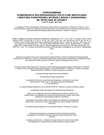 POROZUMIENIE KOMENDANTA WOJEWÓDZKIEGO POLICJI WE WROCŁAWIU I REKTORA PAŃSTWOWEJ WYŻSZEJ SZKOŁY ZAWODOWEJ IM. WITELONA W LEGNICY z dnia 21 lutego 2013 roku o współpracy Policji dolnośląskiej z Państwową Wyższą Szkołą Zawodową im. Witelona w Legnicy w tym przeciwdziałania narkomanii, zagrożeniom terrorystycznym oraz wszelkim formom łamania prawa karnego na terenie Państwowej Wyższej Szkoły Zawodowej im. Witelona w Legnicy Mając na względzie należyte wypełnianie obowiązków wynikających z art. 1 ust. 2, pkt 2 i 3 ustawy z dnia z dnia 6 kwietnia 1990 r. o Policji (Dz. U. z 2011 r. Nr 287, poz. 1687, z póź. zm.), jak i art. 66 ust. 2 pkt 5 i art. 227 ust. 3 i 4 Ustawy z dnia 27 lipca 2005 roku Prawo o szkolnictwie wyższym (Dz. U. z 2005, Nr 164 poz. 1365 z póź. zm.) oraz zgodnie z § 8 Zarządzenia Nr 1144 Komendanta Głównego Policji z dnia 2 listopada 2004 r. w sprawie metod i form wykonywania w Policji zadań w zakresie legislacji pomocy prawnej i informacji prawnej (Dz. Urz. KGP Nr 21, poz. 131), zawiera się dwustronne porozumienie pomiędzy układającymi się stronami o następującej treści: §1 Zawarte porozumienie ma na celu zapewnienie bezpieczeństwa na terenie Państwowej Wyższej Szkoły Zawodowej im. Witelona w Legnicy, podniesienie świadomości społeczności akademickiej o działaniach Policji oraz sprawną i szybką wymianę informacji między układającymi się stronami. §2 Funkcjonariusze Policji mają prawo wkroczyć na teren Państwowej Wyższej Szkoły Zawodowej im. Witelona w Legnicy (w tym również do domu studenckiego), zwanej dalej PWSZ im. Witelona w Legnicy, bez zgody Rektora PWSZ im. Witelona w Legnicy wyłącznie w sytuacji: 1) bezpośredniego zagrożenia życia ludzkiego; 2) katastrofy lub klęski żywiołowej; 3) powzięcia informacji o popełnieniu przestępstwa, wykonywania czynności niecierpiących zwłoki oraz w celu ujęcia sprawcy przestępstwa, a w szczególności: a) uzasadnionego podejrzenia, że na terenie PWSZ im. Witelona w Legnicy przebywa osoba: - posiadająca środki odurzające lub substancje psychotropowe, - która w celu osiągnięcia korzyści majątkowej lub osobistej, udziela innej osobie środka odurzającego lub substancji psychotropowej, ułatwia użycie albo nakłania do użycia takiego środka lub substancji, - udzielająca innej osobie środka odurzającego lub substancji psychotropowej, ułatwia albo umożliwia ich użycie albo nakłania do użycia takiego środka lub substancji; b) uzasadnionego podejrzenia, że na terenie PWSZ im. Witelona w Legnicy : - odbywa się wytwarzanie, przetwarzanie albo przerabianie środków odurzających lub substancji psychotropowych albo przetwarzanie słomy makowej, - znajdują się prekursory - substancje mogące służyć do wytworzenia środka odurzającego lub substancji psychotropowej albo przyrządy, jeżeli z okoliczności wynika, że służą one lub są przeznaczone do niedozwolonego wytwarzania, przetwarzania lub przerobu środków odurzających lub substancji psychotropowych; 4) uzasadnionego podejrzenia, że na terenie PWSZ im. Witelona w Legnicy przebywa osoba podejmująca działania zmierzające do popełnienia przestępstwa o charakterze terrorystycznym. §3 1. Policja powiadomi niezwłocznie w formie pisemnej Rektora PWSZ im. Witelona w Legnicy o wejściu funkcjonariuszy Policji na teren PWSZ im. Witelona w Legnicy, w sytuacjach określonych w § 2, 2. Policja powiadomi Rektora PWSZ im. Witelona w Legnicy o zatrzymaniu osoby będącej studentem PWSZ im. Witelona w Legnicy, w ciągu 48 godzin od zaistniałego zdarzenia w formie pisemnej, określając powód zatrzymania osoby i zastosowane wobec niej sankcje. §4 Funkcjonariusze Policji zobowiązani są do opuszczenia terenu PWSZ im. Witelona w Legnicy na żądanie Rektora w razie uzasadnionego podejrzenia, że wkroczenie policjantów nie pozostaje w związku z sytuacjami opisanymi w § 2. §5 Do czynności przeszukania pomieszczeń domu studenckiego PWSZ im. Witelona w Legnicy Policja dobierze kierownika tego obiektu. Odmowa uczestnictwa osoby dobranej lub w sytuacji niecierpiącej zwłoki brak na miejscu przeszukania takiej osoby nie może wstrzymać realizacji powyższej czynności. §6 1. Komenda Wojewódzka Policji we Wrocławiu wraz z podległymi jednostkami Policji będzie realizować działania edukacyjno - profilaktyczne w celu podniesienia świadomości społeczności PWSZ im. Witelona w Legnicy w zakresie bezpieczeństwa i porządku publicznego. 2. Strony niniejszego porozumienia będą udzielać sobie wzajemnej pomocy dydaktyczno-naukowej, której zakres będzie każdorazowo ustalany. §7 Państwowa Wyższa Szkoła Zawodowa im. Witelona w Legnicy udostępnia swoje obiekty dydaktyczne dla zabezpieczenia imprez sportowo-rekreacyjnych planowanych i realizowanych wspólnie z Komendą Wojewódzką Policji w zakresie zapobiegania patologiom społecznym wśród młodocianych. §8 Strony porozumienia zobowiązane są do nadzoru nad ścisłym przestrzeganiem warunków niniejszego porozumienia. §9 1. Porozumienie może być zmieniane w każdym czasie. 2. Zmiana porozumienia wymaga formy pisemnej pod rygorem nieważności w postaci aneksu. 3. Porozumienie może być rozwiązane na podstawie pisemnego oświadczenia jednej ze stron, przekazanego drugiej stronie w terminie nie krótszym niż 30 dni przed żądanym terminem rozwiązania. § 10 Treść podpisanego porozumienia zostanie umieszczona na stronach internetowych Komendy Wojewódzkiej Policji we Wrocławiu i Państwowej Wyższej Szkoły Zawodowej im. Witelona w Legnicy. § 11 Porozumienie sporządzono w dwóch jednobrzmiących egzemplarzach, po jednym dla każdej ze stron. § 12 Porozumienie wchodzi w życie z dniem podpisania. Rektor Państwowej Wyższej Szkoły Zawodowej im. Witelona w Legnicy Komendant Wojewódzki Policji we Wrocławiu prof. dr hab. inż. Ryszard K. Pisarski nadinsp. dr Dariusz Biel