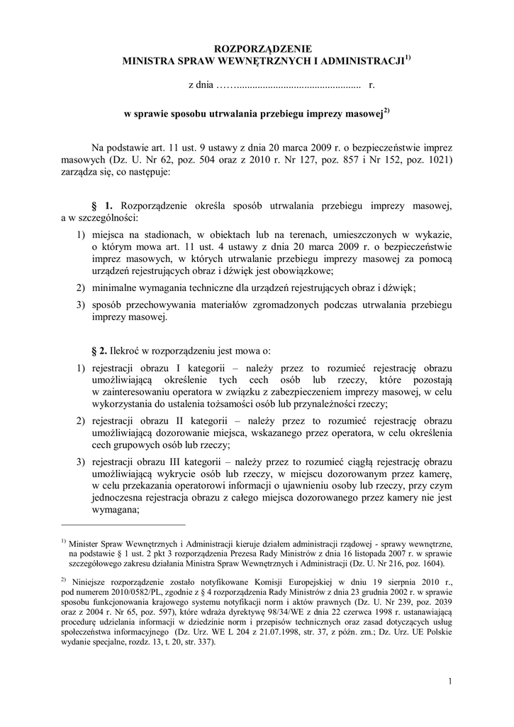 ROZPORZĄDZENIE MINISTRA SPRAW WEWNĘTRZNYCH I ADMINISTRACJI1) z dnia ……................................................ r. w sprawie sposobu utrwalania przebiegu imprezy masowej2) Na podstawie art. 11 ust. 9 ustawy z dnia 20 marca 2009 r. o bezpieczeństwie imprez masowych (Dz. U. Nr 62, poz. 504 oraz z 2010 r. Nr 127, poz. 857 i Nr 152, poz. 1021) zarządza się, co następuje: § 1. Rozporządzenie określa sposób utrwalania przebiegu imprezy masowej, a w szczególności: 1) miejsca na stadionach, w obiektach lub na terenach, umieszczonych w wykazie, o którym mowa art. 11 ust. 4 ustawy z dnia 20 marca 2009 r. o bezpieczeństwie imprez masowych, w których utrwalanie przebiegu imprezy masowej za pomocą urządzeń rejestrujących obraz i dźwięk jest obowiązkowe; 2) minimalne wymagania techniczne dla urządzeń rejestrujących obraz i dźwięk; 3) sposób przechowywania materiałów zgromadzonych podczas utrwalania przebiegu imprezy masowej. § 2. Ilekroć w rozporządzeniu jest mowa o: 1) rejestracji obrazu I kategorii – należy przez to rozumieć rejestrację obrazu umożliwiającą określenie tych cech osób lub rzeczy, które pozostają w zainteresowaniu operatora w związku z zabezpieczeniem imprezy masowej, w celu wykorzystania do ustalenia tożsamości osób lub przynależności rzeczy; 2) rejestracji obrazu II kategorii – należy przez to rozumieć rejestrację obrazu umożliwiającą dozorowanie miejsca, wskazanego przez operatora, w celu określenia cech grupowych osób lub rzeczy; 3) rejestracji obrazu III kategorii – należy przez to rozumieć ciągłą rejestrację obrazu umożliwiającą wykrycie osób lub rzeczy, w miejscu dozorowanym przez kamerę, w celu przekazania operatorowi informacji o ujawnieniu osoby lub rzeczy, przy czym jednoczesna rejestracja obrazu z całego miejsca dozorowanego przez kamery nie jest wymagana; 1) Minister Spraw Wewnętrznych i Administracji kieruje działem administracji rządowej - sprawy wewnętrzne, na podstawie § 1 ust. 2 pkt 3 rozporządzenia Prezesa Rady Ministrów z dnia 16 listopada 2007 r. w sprawie szczegółowego zakresu działania Ministra Spraw Wewnętrznych i Administracji (Dz. U. Nr 216, poz. 1604). 2) Niniejsze rozporządzenie zostało notyfikowane Komisji Europejskiej w dniu 19 sierpnia 2010 r., pod numerem 2010/0582/PL, zgodnie z § 4 rozporządzenia Rady Ministrów z dnia 23 grudnia 2002 r. w sprawie sposobu funkcjonowania krajowego systemu notyfikacji norm i aktów prawnych (Dz. U. Nr 239, poz. 2039 oraz z 2004 r. Nr 65, poz. 597), które wdraża dyrektywę 98/34/WE z dnia 22 czerwca 1998 r. ustanawiającą procedurę udzielania informacji w dziedzinie norm i przepisów technicznych oraz zasad dotyczących usług społeczeństwa informacyjnego (Dz. Urz. WE L 204 z 21.07.1998, str. 37, z późn. zm.; Dz. Urz. UE Polskie wydanie specjalne, rozdz. 13, t. 20, str. 337). 1 4) rejestracji obrazu IV kategorii – należy przez to rozumieć ciągłą rejestrację obrazu, a w obszarach, w których jest to wymagane – także dźwięku, pozwalającą operatorowi wykryć występujące zagrożenie w miejscu dozorowanym przez kamerę, w celu przekazania informacji o stanie bezpieczeństwa. § 3. 1. Utrwalanie przebiegu imprezy masowej odbywa się z poszanowaniem godności i prawa do intymności uczestników imprezy masowej oraz zgodnie z przepisami o ochronie danych osobowych. 2. Przy wejściu na teren imprezy masowej umieszcza się informację o prowadzonej w trakcie trwania tej imprezy rejestracji obrazu i dźwięku. § 4. 1. Miejscami podlegającymi obowiązkowej rejestracji obrazu są: 1) kasy biletowe na terenie imprezy masowej – w przypadku imprezy odpłatnej; 2) bramy, furtki i inne miejsca przeznaczone do wejścia uczestników na teren imprezy masowej; 3) drogi dla służb ratowniczych, drogi ewakuacyjne oraz ciągi komunikacyjne na terenie imprezy masowej z wyłączeniem klatek schodowych; 4) parkingi zorganizowane na terenie imprezy masowej; 5) sektory dla uczestników imprezy masowej; 6) płyta boiska lub scena. 2. Miejsca, o których mowa w ust. 1 pkt 1 – 4, znajdują się w polu widzenia co najmniej jednego urządzenia rejestrującego obraz, a miejsca, o których mowa w ust. 1 pkt 5 i 6, znajdują się w polu widzenia co najmniej dwóch urządzeń rejestrujących obraz. 3. Urządzenia rejestrujące obraz umieszcza się w sposób umożliwiający: 1) rejestrację obrazu I, II i IV kategorii w miejscach, o których mowa w ust. 1 pkt 5 i 6; 2) rejestrację obrazu III kategorii w miejscach, o których mowa w ust. 1 pkt 1, 2, 3 i 4. 4. Miejscami podlegającymi obowiązkowej rejestracji dźwięku są sektory dla uczestników imprezy masowej oraz płyta boiska lub scena. § 5. 1. Utrwalenia przebiegu imprezy masowej organizowanej na stadionach, w obiektach lub na terenach umożliwiających przeprowadzenie imprezy masowej dokonuje się przy użyciu cyfrowych urządzeń elektronicznych rejestrujących obraz kolorowy i dźwięk, wchodzących w skład systemu monitoringu spełniającego wymagania określone w rozporządzeniu, zwanego dalej „systemem”. 2. Do rejestracji, o której mowa w ust. 1, dopuszcza się: 1) wykorzystanie kamer analogowych i jednoczesne wykorzystanie przetworników analogowo-cyfrowych, tak aby obraz zarejestrowany kamerą analogową został przetworzony do postaci cyfrowej; 2) stosowanie kamer rejestrujących obraz kolorowy, które w przypadku spadku natężenia oświetlenia rejestrowanego obszaru automatycznie przełączają się w tryb monochromatyczny z wykorzystaniem ruchomego filtra podczerwieni. 3. Jako uzupełnienie systemu, do rejestracji, o której mowa w ust. 1, dopuszcza się wykorzystanie przenośnych cyfrowych urządzeń elektronicznych utrwalających obraz 2 kolorowy o wysokości nie mniejszej niż 950 pikseli, w szczególności cyfrowych kamer lub cyfrowych aparatów fotograficznych. § 6. 1. Urządzenia rejestrujące obraz podczas imprezy masowej, o której mowa w § 5 ust