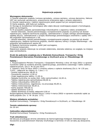 Rejestracja pojazdu Wymagane dokumenty: 1) Dowód własności pojazdu (umowa sprzedaży, umowa zamiany, umowa darowizny, faktura VAT lub rachunek uproszczony, prawomocne orzeczenie sądu o prawie własności), 2) Dowód rejestracyjny i tablice rejestracyjne jeżeli pojazd był już zarejestrowany, 3) Karta pojazdu, jeśli była już wydana, 4) Wyciąg ze świadectwa homologacji albo odpis decyzji zwalniającej pojazd z homologacji, jeżeli są wymagane, 5) W przypadku pojazdu sprowadzonego indywidualnie z zagranicy należy przedstawić: - dowód własności, dowód potwierdzający wyrejestrowanie pojazdu za granicą lub dowód rejestracyjny, badanie techniczne pojazdu, zaświadczenie z urzędu celnego potwierdzające zapłatę akcyzy, zaświadczenie z Urzędu Skarbowego potwierdzające zwolnienie z opłaty VAT dla pojazdów sprowadzanych z UE, - dowód własności, dowód potwierdzający wyrejestrowanie pojazdu za granicą lub dowód rejestracyjny, badanie techniczne pojazdu, dowód odprawy celnej z Urzędu Skarbowego - dla pojazdów sprowadzanych spoza UE, 6) Badanie techniczne pojazdu, jeżeli jest wymagane, 7) Dowód tożsamości. Rejestracji pojazdu dokonuje na wniosek właściciela, starosta właściwy ze względu na miejsce jego zamieszkania. Druki do pobrania znajdują się w Wydziale Komunikacji, Transportu i Dróg Powiatowych Starostwa Powiatowego w Gryficach przy ul. Piłsudskiego 18 Opłaty : 1. Rozporządzenie Ministra Transportu i Gospodarki Morskiej z dnia 18 maja 2001r w sprawie wysokości opłat za wydanie dowodu rejestracyjnego, pozwolenia czasowego i tablic (tablicy) rejestracyjnych, (Dz.U. Nr 52 poz.557). 2. Ustawa z dnia 24 lipca 2002r o zmianie ustawy o opłacie skarbowej (Dz.U. Nr 135 poz. 1143) - załącznik do ustawy cz. I poz.1 i 2. - Dowód rejestracyjny 48,00 zł, - Pozwolenie czasowe 12,00 zł, - Znaki legalizacyjne tablicy 11,00 zł, - Nalepka kontrolna na szybę (dot. tylko samochodów) 16,50 zł, - Tablica rejestracyjna samochodowa 80,00 zł, - Tablica indywidualna 1000,00 zł, - Tablica motocyklowa, ciągnikowa, na przyczepę 40,00 zł, - Tablica motorowerowa 30,00 zł, - Karta pojazdu 500,00 zł, - Opłata skarbowa 5,00 zł, - Opłata skarbowa za każdy załącznik 0,50 zł. Rozporządzenie Ministra Infrastruktury z dnia 4 marca 2002r w sprawie wysokości opłat za kartę pojazdu (Dz. U. Nr 18 poz. 177). Miejsce składania wniosków: Wydział Komunikacji, Transportu i Dróg Powiatowych w Gryficach, ul. Piłsudskiego 18 Termin załatwienia sprawy: Do 30 dni. Jednostka odpowiedzialna: Wydział Komunikacji Transportu i Dróg Powiatowych. Tryb odwoławczy: Od decyzji przysługuje stronie odwołanie do Samorządowego Kolegium Odwoławczego w Szczecinie za pośrednictwem Starosty Gryfickiego w terminie 14 dni od daty jej doręczenia. Ulgi: Rozporządzenie Rady Ministrów z dnia 8 stycznia 2002r w sprawie niektórych ulg przysługujących inwalidom wojennym i wojskowym (Dz.U. Nr 4 poz.35). Inwalidom wojennym i wojskowym przysługuje: 50% zniżki za wydanie dowodu rejestracyjnego, pozwolenia czasowego i tablic (tablicy) rejestracyjnych pojazdów samochodowych. Dodatkowe informacje: Dowodem uprawniającym do korzystania z ulgi jest książka inwalidy wojennego (wojskowego) wystawiona przez ZUS. Postawa prawna: 1. Ustawa z dnia 20 czerwca 1997r – Prawo o ruchu drogowym (Dz. U. Nr 98 poz. 602 z późn. zm.). 2. Rozporządzenie Ministra Infrastruktury z dnia 22 lipca 2002r w sprawie rejestracji i oznaczenia pojazdów (Dz. U. Nr 133 poz.1123).