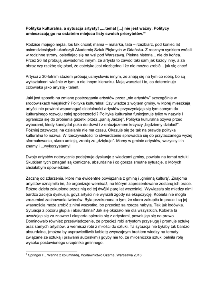 Polityka kulturalna, a sytuacja artysty! „...temat [...] nie jest ważny. Politycy umieszczają go na ostatnim miejscu listy swoich priorytetów.”1 Rodzice mojego męża, los tak chciał; mama – malarka, tata – rzeźbiarz, pod koniec lat osiemdziesiątych ukończyli Akademię Sztuk Pięknych w Gdańsku. Z rocznym synkiem wrócili w rodzinne strony, osiedlając się na wsi pod Warszawą. Piękna historia... nie do końca. Przez 26 lat próbują uświadomić innym, że artysta to zawód taki sam jak każdy inny, a za obraz czy rzeźbę się płaci, że estetyka jest niezbędna i że nie można zrobić... jak się chce! Artyści z 30letnim stażem próbują uzmysłowić innym, że znają się na tym co robią, bo są wykształceni właśnie w tym, a nie innym kierunku. Mają warsztat i to, co determinuje człowieka jako artystę talent. Jaki jest sposób na zmianę postrzegania artystów przez „nie artystów” szczególnie w środowiskach wiejskich? Polityka kulturalna! Czy władze z wójtem gminy, w której mieszkają artyści nie powinni wspomagać działalności artystów przyczyniając się tym samym do kulturalnego rozwoju całej społeczności? Polityka kulturalna funkcjonuje tylko w nazwie i ogranicza się do zrobienia gazetki przez „panią Jadzię”. Polityka kulturalna ożywa przed wyborami, kiedy kandydat puka do drzwi i z entuzjazmem krzyczy „będziemy działać!”. Później zazwyczaj na działanie nie ma czasu. Okazuje się że tak na prawdę polityka kulturalna to nazwa. W rzeczywistości to stwierdzenie sprowadza się do przytaczanego wyżej sformułowania, skoro umieją, zrobią za „dziękuje”. Mamy w gminie artystów, wszyscy ich znamy i ...wykorzystamy! Dwoje artystów notorycznie podejmuje dyskusje z władzami gminy, powiatu na temat sztuki. Skutkiem tych zmagań są komiczne, absurdalne i co gorsza smutne sytuacje, o których chciałabym opowiedzieć. Zacznę od zdarzenia, które ma ewidentne powiązania z gminą i „gminną kulturą”. Znajoma artystów oznajmiła im, że organizuje wernisaż, na którym zaprezentowane zostaną ich prace. Różne dzieła zakupione przez nią od tej dwójki parę lat wcześniej. Wywiązała się miedzy nimi bardzo zacięta dyskusja, gdyż artyści nie wyrazili zgody na ekspozycję. Kobieta nie mogła zrozumieć zachowania twórców. Była przekonana o tym, że skoro zakupiła te prace i są jej własnością może zrobić z nimi wszystko, bo przecież są rzeczą nabytą. Tak jak lodówka. Sytuacja z pozoru głupia i absurdalna? Jak się okazało nie dla wszystkich. Kobieta ta uważając się za znawce i eksperta spierała się z artystami, powołując się na prawo. Dominowało również przeświadczenie, że przecież robi artystom przysługę i promuje sztukę oraz samych artystów, a wernisaż robi z miłości do sztuki. Ta sytuacja nie byłaby tak bardzo absurdalna, (można by usprawiedliwić kobietę zwyczajnym brakiem wiedzy na tematy związane ze sztuką i prawami autorskimi) gdyby nie to, że miłośniczka sztuki pełniła rolę wysoko postawionego urzędnika gminnego. 1 Springer F., Wanna z kolumnadą, Wydawnictwo Czarne, Warszawa 2013 Druga historia dotyczy zaproszenia, które przysłano do artystów z powiatowego wydziału promocji. Była to propozycja wzięcia udziału w festynie miejskim. W zaproszeniu napisano, że powiat proponuje artystom „stanowisko wystawiennicze” czyt. kawałek chodnika 2m x 2m bez wody i światła, za które opłata dzienna wynosi 80zł. Kolejne zdarzenie miało już miejsce na „własnym podwórku”. Do drzwi zapukała miejska dziennikarka, okazało się że reprezentuje gazetę powiatową i zbiera materiał do artykułu pt. „portrety twórców lokalnych”. Zwróciła się z pytaniem do artysty czy może przeprowadzić z nim wywiad na temat sytuacji współpracy z gminą. Artysta odpowiedział, ze bardzo chętnie ale ma na ten temat krytyczne spojrzenie i wiele uwag. Kobieta słysząc to wycofała się z propozycji mówiąc, że szefowa nie zgodzi się na publikację takiego wywiadu, tym bardziej, że zbliżają się wybory. Ostatnia historia tym razem dotyczy pewnej gminy w województwie pomorskim. Mieszkający tam rzeźbiarz został poproszony o wykonanie rzeźb, które mały być nagrodami dla zasłużonych mieszkańców gminy. Wydawałoby się że w tym zdarzeniu nie ma nic kuriozalnego gdyby nie to, że... sam otrzymał nagrodę z rąk wójta w postaci własnej rzeźby. W sztuce zacierają się granice. Dziś na każdym kroku człowiek widzi tysiące obrazów, ale większość z nas nie jest w stanie wyłowić z morza „wszystkiego” sztuki. Ludzie nie potrafią ocenić co jest ładne, co wartościowe, symboliczne. Niestety dla niektórych sztuka jest tylko przejawem snobizmu, zachcianką, kaprysem, przepustką do innego świata. Świata, którego nie pojmują. Dla innych jest tak niezrozumiała, że wręcz odstręczająca, przerażająca. Dla jeszcze innych dziwaczna, wypaczona, niezrozumiała, ekstremalna, niepoważna! Podsumowując: niepotrzebna. Choćbym bardzo chciała zaprzeczyć tezie postawionej na początku tego artykułu i powiedzieć, że polityka kulturalna jednak istnieje, absolutnie nie mogę. Każda z wymienionych przeze mnie sytuacji dowodzi że polityka kulturalna to fatamorgana. Co udowadnia ta farsa? Ze strony gmin, powiatów, urzędów nie ma żadnego zainteresowania artystą i sztuką! Mieszkańcy społeczności lokalnych nie maja pojęcia na czym polega praca artysty, a działania „polityki prokulturalnej” tylko utwierdzają ich w przekonaniu, że sztuka nie jest potrzebna, jest bezwartościowa. A artysta? Jeśli gmina udostępnia mu lokal na ekspozycje, przesuwając na jakiejś salce stół do pingponga powinien się cieszyć. Najlepiej byłoby, gdyby w ramach wdzięczności, ofiarował w darze dla gminy kilka swoich prac. Nie mam tu na myśli narcystycznego podejścia do artysty, wizji wynoszenia go pod niebiosy, ale okazanie mu szac
