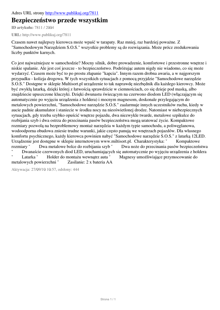 Adres URL strony http://www.publikuj.org/7811 Bezpieczeństwo przede wszystkim ID artykułu: 7811 / 2004 URL: http://www.publikuj.org/7811 Czasem nawet najlepszy kierowca może wpaść w tarapaty. Raz mniej, raz bardziej poważne. Z "Samochodowym Narzędziem S.O.S." wszystkie problemy są do rozwiązania. Może prócz zredukowania liczby punktów karnych. Co jest najważniejsze w samochodzie? Mocny silnik, dobre prowadzenie, komfortowe i przestronne wnętrze i niskie spalanie. Ale jest coś jeszcze - to bezpieczeństwo. Podróżując autem nigdy nie wiadomo, co się może wydarzyć. Czasem może być to po prostu złapanie "kapcia". Innym razem drobna awaria, a w najgorszym przypadku - kolizja drogowa. W tych wszystkich sytuacjach z pomocą przyjdzie "Samochodowe narzędzie S.O.S." Dostępne w sklepie Multisort.pl urządzenie to tak naprawdę niezbędnik dla każdego kierowcy. Może być zwykłą latarką, dzięki której z łatwością sprawdzicie w ciemnościach, co się dzieje pod maską, albo znajdziecie upuszczone kluczyki. Dzięki dwunastu świecącym na czerwono diodom LED (włączającym się automatycznie po wyjęciu urządzenia z holdera) i mocnym magnesom, doskonale przylegającym do metalowych powierzchni, "Samochodowe narzędzie S.O.S." zaalarmuje innych uczestników ruchu, kiedy w aucie padnie akumulator i staniecie w środku nocy na nieoświetlonej drodze. Natomiast w niebezpiecznych sytuacjach, gdy trzeba szybko opuścić wnętrze pojazdu, dwa niezwykle twarde, metalowe szpikulce do rozbijania szyb i dwa ostrza do przecinania pasów bezpieczeństwa mogą uratować życie. Kompaktowe rozmiary pozwolą na bezproblemowy montaż narzędzia w każdym typie samochodu, a poliwęglanowa, wodoodporna obudowa zniesie trudne warunki, jakie często panują we wnętrzach pojazdów. Dla własnego komfortu psychicznego, każdy kierowca powinien nabyć "Samochodowe narzędzie S.O.S." z latarką 12LED. Urządzenie jest dostępne w sklepie internetowym www.miltisort.pl. Charakterystyka: ˇ Kompaktowe rozmiary ˇ Dwa metalowe bolce do rozbijania szyb ˇ Dwa noże do przecinania pasów bezpieczeństwa ˇ Dwanaście czerwonych diod LED, uruchamiających się automatycznie po wyjęciu urządzenia z holdera ˇ Latarka ˇ Holder do montażu wewnątrz auta ˇ Magnesy umożliwiające przymocowanie do metalowych powierzchni ˇ Zasilanie: 2 x bateria AA Aktywacja: 27/09/10 10:57, odsłony: 444 Strona 1 / 1