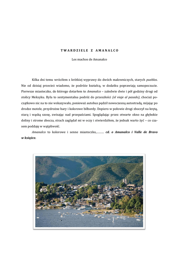 TWARDZIELE Z AMANALCO Los machos de Amanalco Kilka dni temu wróciłem z krótkiej wyprawy do dwóch malowniczych, starych pueblos. Nie od dzisiaj przecież wiadomo, że podróże kształcą, w dodatku poprawiają samopoczucie. Pierwsze miasteczko, do którego dotarłem to Amanalco – zaledwie dwie i pół godziny drogi od stolicy Meksyku. Była to sentymentalna podróż do przeszłości (el viaje al pasado), chociaż początkowo nic na to nie wskazywało, ponieważ autobus pędził nowoczesną autostradą, mijając po drodze motele, przydrożne bary i kolorowe bilbordy. Dopiero w połowie drogi zboczył na krętą, starą i wąską szosę, zwisając nad przepaściami. Spoglądając przez otwarte okno na głębokie doliny i strome zbocza, strach zaglądał mi w oczy i stwierdziłem, że jednak warto żyć – co czasem poddaję w wątpliwość. Amanalco to kolorowe i senne miasteczko,……… cd. o Amanalco i Valle de Bravo w książce.