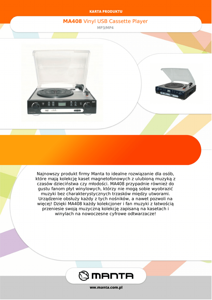 MA408VinylUSBCassettePlayer MP3/MP4 NajnowszyproduktfirmyMantatoidealnerozwiązaniedlaosób, któremająkolekcjękasetmagnetofonowychzulubionąmuzykąz czasówdzieciństwaczymłodości.MA408przypadnierównieżdo gustufanompłytwinylowych,którzyniemogąsobiewyobrazić muzykibezcharakterystycznychtrzaskówmiędzyutworami. Urządzenieobsłużykażdyztychnośników,anawetpozwolina więcej!DziękiMA408każdykolekcjonerifanmuzykizłatwością przeniesieswojąmuzycznąkolekcjęzapisanąnakasetachi winylachnanowoczesnecyfroweodtwarzacze! MA408VinylUSBCassettePlayer MP3/MP4 Specyfikacja MantaMA408pozwalanazautomatyzowane zapisywaniemuzykiztradycyjnychnośnikówna kartachmicroSDlubpendrivachwformacieMP3, którygwarantujeodpowiedniąjakość skonwertowanychdźwięków.Towszystkomożliwe jestbezskomplikowanegopośrednictwakomputera PC.DziękiMA408ulubionąmuzykęzprzedlat śmiałomożnazabraćzesobądosamochodu,czy nawakacje. MA408zpewnościąprzydasięwkażdymdomu, dającradośćkażdemupokoleniu.Dodatkowojego niewielkiewymiary,wbudowanegłośnikistereoi kompaktowabudowaułatwiająobsługę. Dlazwolennikówwspółczesnychrozwiązań przygotowanomożliwośćodtwarzaniamuzyki bezpośredniozkartmicroSDipendrivów. Zasilanie 230V Wymiary(SxWxG) 320x280x120mm Waga 2kg Gniazdokartpamięci SD GniazdoUSB TAK Złącza słuchawki,AUXIN Dodatkowefunkcje Odtwarzaniepłytgramofonowych, odtwarzaniekasetmagnetofonowych, możliwośćzgrywaniamuzykizpłytikasetna kartęSDlubPendrive OdtwarzanieMP3 TAK http://www.manta.com.pl/pl/ma408 EAN:5907377863984