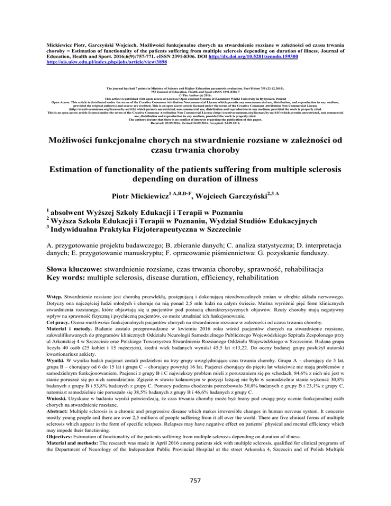 Mickiewicz Piotr, Garczyński Wojciech. Możliwości funkcjonalne chorych na stwardnienie rozsiane w zależności od czasu trwania choroby = Estimation of functionality of the patients suffering from multiple sclerosis depending on duration of illness. Journal of Education, Health and Sport. 2016;6(9):757-771. eISSN 2391-8306. DOI http://dx.doi.org/10.5281/zenodo.159300 http://ojs.ukw.edu.pl/index.php/johs/article/view/3898 The journal has had 7 points in Ministry of Science and Higher Education parametric evaluation. Part B item 755 (23.12.2015). 755 Journal of Education, Health and Sport eISSN 2391-8306 7 © The Author (s) 2016; This article is published with open access at Licensee Open Journal Systems of Kazimierz Wielki University in Bydgoszcz, Poland Open Access. This article is distributed under the terms of the Creative Commons Attribution Noncommercial License which permits any noncommercial use, distribution, and reproduction in any medium, provided the original author(s) and source are credited. This is an open access article licensed under the terms of the Creative Commons Attribution Non Commercial License (http://creativecommons.org/licenses/by-nc/4.0/) which permits unrestricted, non commercial use, distribution and reproduction in any medium, provided the work is properly cited. This is an open access article licensed under the terms of the Creative Commons Attribution Non Commercial License (http://creativecommons.org/licenses/by-nc/4.0/) which permits unrestricted, non commercial use, distribution and reproduction in any medium, provided the work is properly cited. The authors declare that there is no conflict of interests regarding the publication of this paper. Received: 02.09.2016. Revised 24.09.2016. Accepted: 24.09.2016. Możliwości funkcjonalne chorych na stwardnienie rozsiane w zależności od czasu trwania choroby Estimation of functionality of the patients suffering from multiple sclerosis depending on duration of illness Piotr Mickiewicz1 A,B,D-F, Wojciech Garczyński2,3 A 1 absolwent Wyższej Szkoły Edukacji i Terapii w Poznaniu Wyższa Szkoła Edukacji i Terapii w Poznaniu, Wydział Studiów Edukacyjnych 3 Indywidualna Praktyka Fizjoterapeutyczna w Szczecinie 2 A. przygotowanie projektu badawczego; B. zbieranie danych; C. analiza statystyczna; D. interpretacja danych; E. przygotowanie manuskryptu; F. opracowanie piśmiennictwa: G. pozyskanie funduszy. Słowa kluczowe: stwardnienie rozsiane, czas trwania choroby, sprawność, rehabilitacja Key words: multiple sclerosis, disease duration, efficiency, rehabilitation Wstęp. Stwardnienie rozsiane jest chorobą przewlekłą, postępującą i dokonującą nieodwracalnych zmian w obrębie układu nerwowego. Dotyczy ona najczęściej ludzi młodych i choruje na nią ponad 2,5 mln ludzi na całym świecie. Można wyróżnić pięć form klinicznych stwardnienia rozsianego, które objawiają się u pacjentów pod postacią charakterystycznych objawów. Rzuty choroby mają negatywny wpływ na sprawność fizyczną i psychiczną pacjentów, co może utrudniać ich funkcjonowanie. Cel pracy. Ocena możliwości funkcjonalnych pacjentów chorych na stwardnienie rozsiane w zależności od czasu trwania choroby. Materiał i metody. Badanie zostało przeprowadzone w kwietniu 2016 roku wśród pacjentów chorych na stwardnienie rozsiane, zakwalifikowanych do programów klinicznych Oddziału Neurologii Samodzielnego Publicznego Wojewódzkiego Szpitala Zespolonego przy ul Arkońskiej 4 w Szczecinie oraz Polskiego Towarzystwa Stwardnienia Rozsianego Oddziału Wojewódzkiego w Szczecinie. Badana grupa liczyła 40 osób (25 kobiet i 15 mężczyzn), średni wiek badanych wyniósł 45,5 lat ±13,22. Do oceny badanej grupy posłużył autorski kwestionariusz ankiety. Wyniki. W wyniku badań pacjenci zostali podzieleni na trzy grupy uwzględniające czas trwania choroby. Grupa A – chorujący do 5 lat, grupa B – chorujący od 6 do 15 lat i grupa C – chorujący powyżej 16 lat. Pacjenci chorujący do pięciu lat właściwie nie mają problemów z samodzielnym funkcjonowaniem. Pacjenci z grupy B i C największy problem mieli z poruszaniem się po schodach, 84,6% z nich nie jest w stanie poruszać się po nich samodzielnie. Zgięcie w stawie kolanowym w pozycji leżącej nie było w samodzielnie stanie wykonać 30,8% badanych z grupy B i 53,8% badanych z grupy C. Pomocy podczas chodzenia potrzebowało 30,8% badanych z grupy B i 23,1% z grupy C, natomiast samodzielnie nie poruszało się 38,5% badanych z grupy B i 46,6% badanych z grupy C. Wnioski. Uzyskane w badaniu wyniki potwierdzają, że czas trwania choroby może być brany pod uwagę przy ocenie funkcjonalnej osób chorych na stwardnienie rozsiane. Abstract: Multiple sclerosis is a chronic and progressive disease which makes irreversible changes in human nervous system. It concerns mostly young people and there are over 2,5 millions of people suffering from it all over the world. There are five clinical forms of multiple sclerosis which appear in the form of specific relapses. Relapses may have negative effect on patients’ physical and mental efficiency which may impede their functioning. Objectives: Estimation of functionality of the patients suffering from multiple sclerosis depending on duration of illness. Material and methods: The research was made in April 2016 among patients sick with multiple sclerosis, qualified for clinical programs of the Department of Neurology of the Independent Public Provincial Hospital at the street Arkonska 4, Szczecin and of Polish Multiple 757 Sclerosis Society Provincial Branch in Szczecin. The analyzed group consisted of 40 persons (25 women and 15 men); the patients’ average age was 45,5 years ± 13,22. To evaluate the test group the author’s questionnaire was used. Results: During the analysis all patients were divided into three groups taking into account duration of illness. Group A – suffering from multiple sclerosis from 5 y