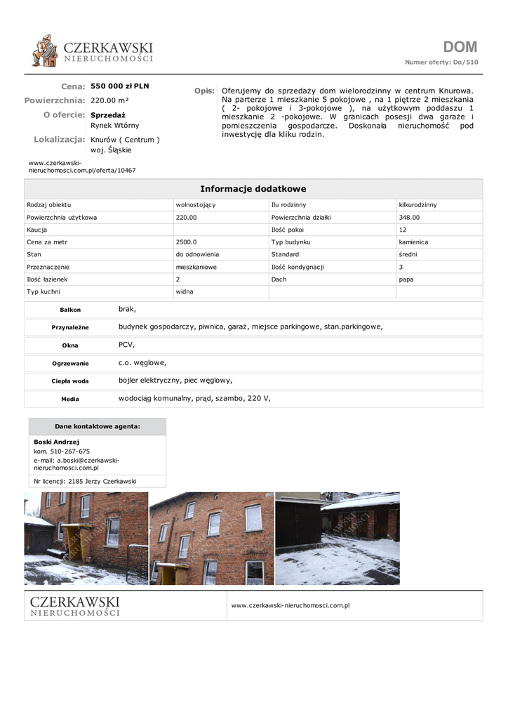 DOM Numer oferty: Do/510 Cena: 550 000 zł PLN Opis: Oferujemy do sprzedaży dom wielorodzinny w centrum Knurowa. Na parterze 1 mieszkanie 5 pokojowe , na 1 piętrze 2 mieszkania ( 2- pokojowe i 3-pokojowe ), na użytkowym poddaszu 1 mieszkanie 2 -pokojowe. W granicach posesji dwa garaże i pomieszczenia gospodarcze. Doskonała nieruchomość pod inwestycję dla kliku rodzin. Powierzchnia: 220.00 m² O ofercie: Sprzedaż Rynek Wtórny Lokalizacja: Knurów ( Centrum ) woj. Śląskie www.czerkawskinieruchomosci.com.pl/oferta/10467 Informacje dodatkowe Rodzaj obiektu wolnostojący Ilu rodzinny kilkurodzinny Powierzchnia użytkowa 220.00 Powierzchnia działki 348.00 Ilość pokoi 12 Kaucja Cena za metr 2500.0 Typ budynku kamienica Stan do odnowienia Standard średni Przeznaczenie mieszkaniowe Ilość kondygnacji 3 Ilość łazienek 2 Dach papa Typ kuchni widna Balkon Przynależne Okna brak, budynek gospodarczy, piwnica, garaż, miejsce parkingowe, stan.parkingowe, PCV, Ogrzewanie c.o. węglowe, Ciepła woda bojler elektryczny, piec węglowy, Media wodociąg komunalny, prąd, szambo, 220 V, Dane kontaktowe agenta: Boski Andrzej kom. 510-267-675 e-mail: [email protected] Nr licencji: 2185 Jerzy Czerkawski www.czerkawski-nieruchomosci.com.pl