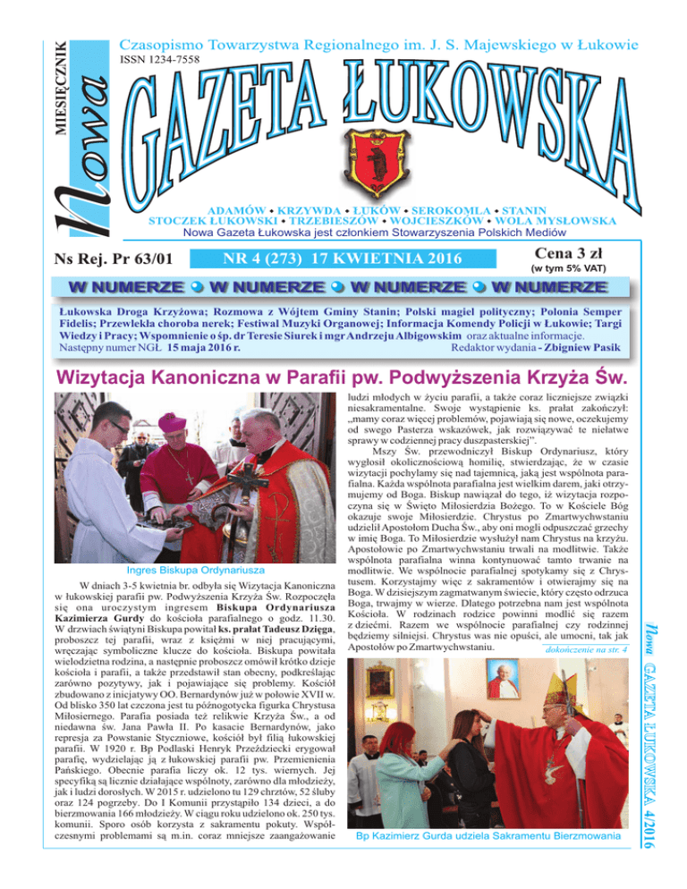 Nowa Gazeta Łukowska jest członkiem Stowarzyszenia Polskich Mediów NR 4 (273) 17 KWIETNIA 2016 Cena 3 zł (w tym 5% VAT) Łukowska Droga Krzyżowa; Rozmowa z Wójtem Gminy Stanin; Polski magiel polityczny; Polonia Semper Fidelis; Przewlekła choroba nerek; Festiwal Muzyki Organowej; Informacja Komendy Policji w Łukowie; Targi Wiedzy i Pracy; Wspomnienie o śp. dr Teresie Siurek i mgr Andrzeju Albigowskim oraz aktualne informacje. Następny numer NGŁ 15 maja 2016 r. Redaktor wydania - Zbigniew Pasik Wizytacja Kanoniczna w Parafii pw. Podwyższenia Krzyża Św. Ingres Biskupa Ordynariusza Bp Kazimierz Gurda udziela Sakramentu Bierzmowania 4/2016 W dniach 3-5 kwietnia br. odbyła się Wizytacja Kanoniczna w łukowskiej parafii pw. Podwyższenia Krzyża Św. Rozpoczęła się ona uroczystym ingresem Biskupa Ordynariusza Kazimierza Gurdy do kościoła parafialnego o godz. 11.30. W drzwiach świątyni Biskupa powitał ks. prałat Tadeusz Dzięga, proboszcz tej parafii, wraz z księżmi w niej pracującymi, wręczając symboliczne klucze do kościoła. Biskupa powitała wielodzietna rodzina, a następnie proboszcz omówił krótko dzieje kościoła i parafii, a także przedstawił stan obecny, podkreślając zarówno pozytywy, jak i pojawiające się problemy. Kościół zbudowano z inicjatywy OO. Bernardynów już w połowie XVII w. Od blisko 350 lat czczona jest tu późnogotycka figurka Chrystusa Miłosiernego. Parafia posiada też relikwie Krzyża Św., a od niedawna św. Jana Pawła II. Po kasacie Bernardynów, jako represja za Powstanie Styczniowe, kościół był filią łukowskiej parafii. W 1920 r. Bp Podlaski Henryk Przeździecki erygował parafię, wydzielając ją z łukowskiej parafii pw. Przemienienia Pańskiego. Obecnie parafia liczy ok. 12 tys. wiernych. Jej specyfiką są licznie działające wspólnoty, zarówno dla młodzieży, jak i ludzi dorosłych. W 2015 r. udzielono tu 129 chrztów, 52 śluby oraz 124 pogrzeby. Do I Komunii przystąpiło 134 dzieci, a do bierzmowania 166 młodzieży. W ciągu roku udzielono ok. 250 tys. komunii. Sporo osób korzysta z sakramentu pokuty. Współczesnymi problemami są m.in. coraz mniejsze zaangażowanie ludzi młodych w życiu parafii, a także coraz liczniejsze związki niesakramentalne. Swoje wystąpienie ks. prałat zakończył: „mamy coraz więcej problemów, pojawiają się nowe, oczekujemy od swego Pasterza wskazówek, jak rozwiązywać te niełatwe sprawy w codziennej pracy duszpasterskiej”. Mszy Św. przewodniczył Biskup Ordynariusz, który wygłosił okolicznościową homilię, stwierdzając, że w czasie wizytacji pochylamy się nad tajemnicą, jaką jest wspólnota parafialna. Każda wspólnota parafialna jest wielkim darem, jaki otrzymujemy od Boga. Biskup nawiązał do tego, iż wizytacja rozpoczyna się w Święto Miłosierdzia Bożego. To w Kościele Bóg okazuje swoje Miłosierdzie. Chrystus po Zmartwychwstaniu udzielił Apostołom Ducha Św., aby oni mogli odpuszczać grzechy w imię Boga. To Miłosierdzie wysłużył nam Chrystus na krzyżu. Apostołowie po Zmartwychwstaniu trwali na modlitwie. Także wspólnota parafialna winna kontynuować tamto trwanie na modlitwie. We wspólnocie parafialnej spotykamy się z Chrystusem. Korzystajmy więc z sakramentów i otwierajmy się na Boga. W dzisiejszym zagmatwanym świecie, który często odrzuca Boga, trwajmy w wierze. Dlatego potrzebna nam jest wspólnota Kościoła. W rodzinach rodzice powinni modlić się razem z dziećmi. Razem we wspólnocie parafialnej czy rodzinnej będziemy silniejsi. Chrystus was nie opuści, ale umocni, tak jak Apostołów po Zmartwychwstaniu. dokończenie na str. 4 Tematyka Religijna 2 XXIV Łukowska Pokutna Droga Krzyżowa 20 marca 2016 r., tradycyjnie w Niedzielę Palmową, ulicami Łukowa przeszła Droga Krzyżowa. Rozpoczęła się ona sceną Ostatniej Wieczerzy na Placu Narutowicza przed Kolegiatą, by poprzez kolejne etapy drogi - stacje, zakończyć się na placu przy kościele Podwyższenia Krzyża Św .w Łukowie. Nabożeństwu przewodniczył ks. Jarosław Kopeć - wikariusz tejże parafii, zaś rozważania przy poszczególnych stacjach czytali lektorzy - członkowie wspólnot parafialnych i Łukowskiego Towarzystwa Regionalnego, którego prezes dr Zbigniew Pasik jest inicjatorem łukowskiej Drogi. W przeżywanie tej szczególnej manifestacji wiary włączył się też śpiewem chór parafialny na czele z organistą Janem Rzewuskim. Strażacy i Policja czuwali nad porządkiem. Ostatnia Wieczerza Uczestnicy Drogi Krzyżowej na Placu Narutowicza 4/2016 Apostołowie rozdają „chlebki jerozolimskie” nowa Jezus w drodze na Golgotę Zakończenie Drogi Krzyżowej I znów, jak co roku, apostołowie rozdawali chlebki licznie zgromadzonym, którzy dzielili się nimi na znak pokoju. Przeżywali potem scenę pojmania Jezusa w Ogrójcu i wyruszenie na bolesną drogę zakończoną ukrzyżowaniem. Następnie uczestnicy nabożeństwa udali się ulicami Piłsudskiego i Wyszyńskiego w kierunku kościoła par. Podwyższenia Krzyża Świętego. Zatrzymywano się przy poszczególnych stacjach, gdzie rozważano Mękę Chrystusa i prowadzone były modlitwy ekspijacyjne za nasze grzechy. Ta droga to wspomnienie męki Chrystusa, który za nas oddał swe życie na krzyżu…! A.W. zdjęcia Grzegorz Lipiński Aktualnoœci Wiadomoœci z kraju 10 marca br. przed KPRM odby³a siê demonstracja KOD z udzia³em polityków m.in. PO, Nowoczesnej i Zielonych; w tym samym czasie i miejscu demonstrowali zwolennicy Partii Razem. Komisja Wenecka przyjê³a opiniê nt. Trybuna³u Konstytucyjnego w Polsce. Wzywa w niej Polskê do rozwi¹zania kryzysu konstytucyjnego. Prawo i Sprawiedliwoœæ zapowiada, ¿e nad opini¹ siê pochyli, ale nie wiadomo, czy weŸmie j¹ pod uwagê. Prezydent Andrzej Duda cieszy siê wysokim zaufaniem wœród Polaków. Tak wynika z sonda¿u przeprowadzonego przez IBRiS dla Onetu. £¹cznie pozytywnie ocenia go 38,5 % badanych. Miejsca na 