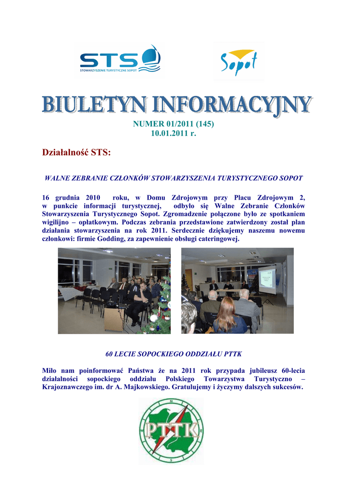 NUMER 01/2011 (145) 10.01.2011 r. Działalność STS: WALNE ZEBRANIE CZŁONKÓW STOWARZYSZENIA TURYSTYCZNEGO SOPOT 16 grudnia 2010 roku, w Domu Zdrojowym przy Placu Zdrojowym 2, w punkcie informacji turystycznej, odbyło się Walne Zebranie Członków Stowarzyszenia Turystycznego Sopot. Zgromadzenie połączone było ze spotkaniem wigilijno – opłatkowym. Podczas zebrania przedstawione zatwierdzony został plan działania stowarzyszenia na rok 2011. Serdecznie dziękujemy naszemu nowemu członkowi: firmie Godding, za zapewnienie obsługi cateringowej. 60 LECIE SOPOCKIEGO ODDZIAŁU PTTK Miło nam poinformować Państwa Ŝe na 2011 rok przypada jubileusz 60-lecia działalności sopockiego oddziału Polskiego Towarzystwa Turystyczno – Krajoznawczego im. dr A. Majkowskiego. Gratulujemy i Ŝyczymy dalszych sukcesów. FIRMA GODDING CZŁONKIEM STOWARZYSZENIA TURYSTYCZNEGO SOPOT Pragniemy poinformować Państwa, Ŝe nowym członkiem Stowarzyszenia Turystycznego Sopot został Godding. Mieszcząca się przy ul. Smolnej 21 w Sopocie firma zajmuje się organizacją imprez i przyjęć okolicznościowych. Projektuje oprawę waŜnych wydarzeń tj, przyjęć weselnych, urodzin, imienin, wieczorów panieńskich i kawalerskich, spotkań absolwenckich, zaręczyn etc., aby były wyjątkowe i niezapomniane. Godding posiada wszechstronne moŜliwości. Piękne, leśne otoczenie sprzyja spotkaniom, rozmowom, integracji oraz nauce. Zorganizować tu moŜna zarówno spotkania biznesowe, konferencje, szkolenie pracowników, jak równieŜ zabawę integracyjną czy teŜ wieczorne szaleństwa. W swojej ofercie posiada takŜe pokazy live cookingu, kursy gotowania oraz degustacje. W kaŜdym przypadku firma, na Ŝyczenie zajmie się organizacją oprawy muzycznej i artystycznej, transportem oraz bazą noclegową. Szczegółowe informacje dotyczące działalności Godding znaleźć moŜna na stronie www.godding.pl. Serdecznie zapraszamy do korzystania z oferty nowego członka naszego stowarzyszenia. PoniŜej zamieszczamy informację o najbliŜszej imprezie. " Godding bawi się do rana i śle wszystkim zapytania, czy się z nami zabawicie i Karnawał rozkręcicie" SEZON NA ŁYSEJ GÓRZE Przypominamy Państwu o działalności stoku narciarskiego na Łysej Górze. Wszystkich chętnych zapraszamy na stok w godzinach 9-22. Bilety są w cenie 2 zł/ 1 przejazd oraz karnety 20zł/10 przejazdów + 1 gratis, 50zł/25 przejazdów + 4 gratis, 100zł/50 przejazdów + 10 gratis. Na miejscu działa wypoŜyczalnia sprzętu narciarskiego, czynna w godzinach otwarcia wyciagu, tel. 603 120 88. Zapraszamy równieŜ do korzystania z oferty szkółki narciarskiej, tel. 667 532 555 (w miarę moŜliwości prosimy o zapisy z jedno dniowym wyprzedzeniem). Po szaleństwach na stoku istnieje moŜliwość ogrzania się oraz skosztowania doskonałej kuchni w restauracji Sabat. Więcej informacji oraz notkę o aktualnych warunkach panujących na stoku znajdą Państwo na stronie www.lysa-gora.pl. Serdecznie zapraszamy! KOLĘDY JAZZOWO I KLASYCZNIE 15 stycznia 2011 roku o godz. 16.00 w Sali Christopher Columbus - Conference Center&Spa Sheraton Sopot Hotel odbędzie się koncert najpiękniejszych kolęd polskich, połączony ze wspólnym śpiewem z publicznością. Wystąpią przed Państwem znakomici soliści: BoŜena Harasimowicz – sopran, Janusz Szrom - wokalista jazzowy, Krzysztof Herdzin - aranŜacja, dyrygent. Impreza objęta jest Patronatem Honorowym Prezydenta Miasta Sopotu. Patronat medialny to: TVP Gdańsk, Radio Gdańsk, Biznesnafali.pl, Trojmiasto.pl, Gazeta Wyborcza. Punkty sprzedaŜy biletów (w cenie 50 – 150 zł) w Sopocie to: Urząd Miasta Sopotu (kiosk) - czynne 10:00 - 15:00, tel.510 222 323 oraz Galeryjka Sopocka Amberways - Dom Zdrojowy, czynne od wtorku do niedzieli 12:00 - 17:00, tel. 513 187 951. W Gdyni natomiast bilety kupić moŜna w Greckim Biurze PodróŜy Barkost, ul. Świętojańska 100, czynne pn- pt. 10:00 - 18:00, sob. 10:00 - 14:00, tel. 58 620 10 26. Dodatkowe informacje znaleźć moŜna na stronie www.impessioart.pl. ZMIANY W ZATOCE ORAZ WDW Informujemy, Ŝę od 25 grudnia 2011 roku Zespół Ośrodków Szkoleniowo – Wypoczynkowych „Zatoka” w Sopocie przy ul. Emilii Plater 7/9/11 funkcjonuje jako Centrum Szkoleniowo – Rehabilitacyjne Politechniki Gdańskiej. Wszystkie dane kontaktowe pozostają niezmienione. Z dniem 31 grudnia Wojskowy Dom Wypoczynkowy w Sopocie przy ul. Kilińskiego 12 uległ likwidacji. Zgodnie z Decyzją Nr 398/MON Ministra Obrony Narodowej z dnia 27 października 2010 roku następcą prawnym zlikwidowanego WDW jest Wojskowa Agencja Mieszkaniowa, 02 – 004 Warszawa, ul. Tytusa Chałubińskiego 3A, Ośrodek Szkoleniowo Wypoczynkowy WAM Wojskowy Dom Wypoczynkowy w Sopocie, ul. Kilińskiego 12. W tym przypadku dane kontaktowe równieŜ pozostają niezmienione. WYPRZEDAś RZEŹB I MALARTSWA W CAFE DEL ARTE Cafe del arte, prowadzi wyprzedaŜ rzeźb i malarstwa ze swojej kolekcji. Rzeźby są wykonane przez hiszpańskich artystów skupionych w zakładzie Artesanias Urregui w Madrycie. KaŜda z nich wykonana jest starannie z kalcytu, z zewnętrzną warstwą brązu (szlifowany, patynowany lub oksydowany, w zaleŜności od rzeźby). Szczegółowe informacje a takŜe katalog części zbiorów znaleźć moŜna na stronie http://www.cafedelarte.pl/likwidacja/. Dzieje się w Sopocie: KARTA SOPOCKA <www.sopot.pl> Przypominamy o tym, Ŝe od listopada w Urzędzie Miasta Sopotu (punkt informacyjny) dostępna jest Karta Sopocka. Jest ona bezpłatna i upowaŜnia do zniŜek w wielu sopockich lokalach, klubach etc. Na razie wydawana jest w godzinach pracy urzędu (poniedziałek: 10 - 18, wtorek - piątek: 7.30 - 15.30). Mają powstać jednak dodatkowe jej punkty dystrybucyjne. Do wyrobienia sobie karty upowaŜnieni są obywatele Sopotu (osoby w nim zameldowane) oraz osoby prowadzące działalność gospodarczą na terenie miasta. Jest waŜna z dowodem osobistym. W przypadku dzieci i młodzieŜy - z legi