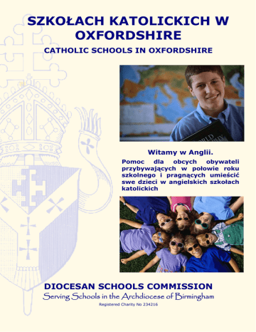 SZKOŁACH KATOLICKICH W OXFORDSHIRE CATHOLIC SCHOOLS IN OXFORDSHIRE Witamy w Anglii. Pomoc dla obcych obywateli przybywających w połowie roku szkolnego i pragnących umieścić swe dzieci w angielskich szkołach katolickich DIOCESAN SCHOOLS COMMISSION Serving Schools in the Archdiocese of Birmingham Registered Charity No 234216 Wszystkie dzieci w wieku 5-16 podlegają obowiązkowemu nauczaniu, które zapewniają bezpłatnie lokalne władze samorządowe (the local authority). Dziecko może również chodzić bezpłatnie do szkoły katolickiej. Oto procedura postępowania w takich przypadkach: • Skontaktuj się z Wydziałem Pomocy Dzieciom (Children’s Services) w Urzędzie Władz Samorządowych miasta Oxfordshire pod adresem: Oxfordshire County Council, Education Department, Macclesfield House, New Road, Oxford, OX1 1NA albo zatelefonuj na numer 01865 815175. • Poproś o podanie Ci nazwy i adresu najbliższej szkoły katolickiej – będziesz mieć obowiązek podania własnego imienia i nazwiska, adresu zamieszkania oraz wieku dziecka. • Wydział poda Ci nazwę, adres oraz numer telefonu do szkoły, jak również dane o innej szkole, jeśli taka znajduje się w pobliżu. • Ewentualnie możesz otrzymać również inne dane, np. nazwisko kierowniczki szkoły. • Skontaktuj się ze szkołą telefonicznie lub osobiście i umów się na wizytę celem omówienia szczegółów nauki oraz wypełnienia formularza zgłoszeniowego. • W szkole należy okazać własny dowód tożsamości, świadectwo urodzenia dziecka oraz świadectwo chrztu (dokumenty te można przedstawić później) – oraz podać datę, od kiedy dziecko ma zacząć chodzić do tej szkoły. • Pomocnym w uzyskaniu proboszcz Twojej parafii. • Rodzice proszeni są o wyjaśnienie w miarę możliwości, czy z dzieckiem można komunikować się po angielsku. • Jeżeli szkoła ma miejsce dla dziecka, wówczas udzieli Ci wszelkich potrzebnych informacji. • Jeżeli szkoła powie, że dla dziecka nie ma miejsca, wówczas masz prawo odwołać się do niezależnej komisji (panelu), która podejmie ostateczną decyzję. • Dziecko może zostać wpisane na listę oczekujących lub rodzice mogą otrzymać dane innej szkoły. świadectwa chrztu będzie ksiądz OXFORDSHIRE CATHOLIC PRIMARY SCHOOLS St John's Catholic Primary School, Avocet Way, Banbury, Oxon, OX16 9YA Tel: 01295 263740, Email: [email protected] Holy Trinity Catholic Primary School, 24 London Road, Chipping Norton, Oxon, OX7 5AX Tel: 01608 643487, Email: [email protected] St Joseph's Catholic Primary School, Lawton Avenue, Carterton, Oxon, OX18 3JY Tel: 01993 841240, Email: [email protected] Sacred Heart Catholic Primary School, Greys Hill, Henley-on-Thames, Oxon, RG9 1SL Tel: 01491 572796, Email: [email protected] Our Lady of Lourdes Catholic Primary School, Curbridge Road, Witney, Oxon, OX28 5JZ Tel: 01993 702480, Email: [email protected] St Thomas More Catholic Primary School, Oxford Road, Kidlington, Oxon, OX5 1EA Tel: 01865 373674, Email: [email protected] St Mary's Catholic Primary School, Queen's Avenue, Bicester, Oxon, OX26 2NX Tel: 01869 252035, Email: [email protected] St Joseph's Catholic Primary School, Fiennes Road, Neithrop, Banbury, OX16 0ET Tel: 01295 264284, Email: [email protected] St Joseph's Catholic Primary School, Brook Lane, Thame, Oxon, OX9 2AB Tel: 01844 214278, Email: [email protected] Our Lady's Catholic Primary School, Oxford Road, Cowley, Oxford, OX4 2LF Tel: 01865 779176, Email: [email protected] St Joseph's Catholic Primary School, Headley Way, Headington, Oxford, OX3 7SX Tel: 01865 763357, Email: [email protected] St John Fisher Catholic Primary School, Sandy Lane West, Littlemore, Oxford, OX4 6LD Tel: 01865 779676, Email: [email protected] St Aloysius' Catholic Primary School, Woodstock Road, , Oxford, OX2 7PH Tel: 01865 515094, Email: [email protected] OXFORDSHIRE CATHOLIC SECONDARY SCHOOLS St Gregory the Great Catholic School, Cricket Road, Oxford, Oxon, OX4 3DR Tel: 01865 749933, Email: [email protected] Blessed George Napier Catholic School, Addison Road, Banbury, Oxon, OX16 9DG Tel: 01295 264216, Email: [email protected] Produced by: Diocesan Schools Commission 61 Coventry Road Coleshill Birmingham B46 3EA 01675 430230 www.bdsc.org.uk