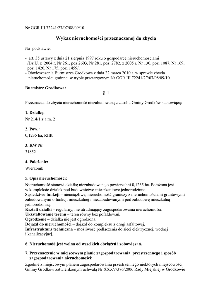 Nr GGR.III.72241/27/07/08/09/10 Wykaz nieruchomości przeznaczonej do zbycia Na podstawie: - art. 35 ustawy z dnia 21 sierpnia 1997 roku o gospodarce nieruchomościami /Dz.U. z 2004 r. Nr 261, poz.2603, Nr 281, poz. 2782, z 2005 r. Nr 130, poz. 1087, Nr 169, poz. 1420, Nr 175, poz. 1459/, - Obwieszczenia Burmistrza Grodkowa z dnia 22 marca 2010 r. w sprawie zbycia nieruchomości gminnej w trybie przetargowym Nr GGR.III.72241/27/07/08/09/10. Burmistrz Grodkowa: § 1 Przeznacza do zbycia nieruchomość niezabudowaną z zasobu Gminy Grodków stanowiącą: 1. Działkę: Nr 214/1 z a.m. 2 2. Pow.: 0,1235 ha, RIIIb 3. KW Nr 31852 4. PołoŜenie: Wierzbnik 5. Opis nieruchomości: Nieruchomość stanowi działkę niezabudowaną o powierzchni 0,1235 ha. PołoŜona jest w kompleksie działek pod budownictwo mieszkaniowe jednorodzinne. Sąsiedztwo funkcji – nieuciąŜliwe, nieruchomość graniczy z nieruchomościami gruntowymi zabudowanymi o funkcji mieszkalnej i niezabudowanymi pod zabudowę mieszkalną jednorodzinną. Kształt działki – regularny, nie utrudniający zagospodarowania nieruchomości. Ukształtowanie terenu – teren równy bez pofałdowań. Ogrodzenie – działka nie jest ogrodzona. Dojazd do nieruchomości – dojazd do kompleksu z drogi asfaltowej. Infrastruktura techniczna – moŜliwość podłączenia do sieci elektrycznej, wodnej i kanalizacyjnej. 6. Nieruchomość jest wolna od wszelkich obciąŜeń i zobowiązań. 7. Przeznaczenie w miejscowym planie zagospodarowania przestrzennego i sposób zagospodarowania nieruchomości: Zgodnie z miejscowym planem zagospodarowania przestrzennego niektórych miejscowości Gminy Grodków zatwierdzonym uchwałą Nr XXXV/376/2006 Rady Miejskiej w Grodkowie -2z dnia 27 września 2006 r. (opublikowaną w Dz. Urz. Woj. Op. z dnia 18 grudnia 2006 r. Nr 92, poz. 2727) oraz uchwałą Nr XXV/263/08 Rady Miejskiej w Grodkowie z dnia 30 grudnia 2008 r. zmieniającą uchwałę w sprawie miejscowego planu zagospodarowania przestrzennego niektórych miejscowości Gminy Grodków (opublikowaną w Dz. Urz. Woj. Op. z dnia 9 marca 2009 r. Nr 16 poz. 246) teren obejmujący działkę Nr 214/1 w Wierzbniku posiada zgodę na przeznaczenie na cele nierolne i nieleśne, oznaczony jest symbolem MN – przeznaczenie podstawowe – zabudowa mieszkaniowa jednorodzinna wolnostojąca, szeregowa lub bliźniacza o niskiej intensywności zabudowy. 8. Forma zbycia: - sprzedaŜ w drodze przetargu ustnego nieograniczonego. 9. Cena nieruchomości określonej niniejszym Wykazem została ustalona na kwotę: 32.000,00 zł /słownie złotych: trzydzieści dwa tysiące/. Oprócz ceny nieruchomości osiągniętej w przetargu nabywca zobowiązany będzie do pokrycia kosztów dokumentacji niezbędnej do zbycia nieruchomości opisanej tym Wykazem w wys.: 693,17 zł. Nabywca zobowiązany będzie równieŜ do uiszczenia podatku VAT w wysokości 22%, od ceny zbycia nieruchomości. Inwestor nieruchomości musi liczyć się z obowiązkiem uzyskania decyzji zezwalającej na wyłączenie i określającej warunki wyłączenia gruntów rolnych, o ile taka będzie wymagana stosownie do ustawy z dnia 3 lutego 1995 r. o ochronie gruntów rolnych i leśnych /Dz. U. z 2004 Nr 121, poz. 1266, z 2005 r. Nr 175, poz. 1462, z 2006 r. Nr 12, poz. 63/. Wyłączenie gruntów klas I-III jest odpłatne. § 2 Niniejszy wykaz podaje się do publicznej wiadomości poprzez wywieszenie na tablicy ogłoszeń tut. Urzędu na okres 21 dni, w sołectwie na terenie którego połoŜona jest nieruchomość oraz poprzez zamieszczenie informacji o niniejszym Wykazie w prasie lokalnej oraz w Biuletynie Informacji Publicznej. § 3 Osoby, którym przysługuje pierwszeństwo nabycia przedmiotowej nieruchomości zgodnie z art. 34 ust. 1 pkt. 1 i 2 ustawy o gospodarce nieruchomościami, winny złoŜyć wnioski o jej nabycie w terminie 6-ciu tygodni licząc od dnia wywieszenia niniejszego wykazu. Po upływie tego terminu powyŜsza nieruchomość zostanie sprzedana w oparciu o § 1 pkt 8 niniejszego Wykazu. § 4 Niniejszy wykaz wywieszono od dnia: 6 maja 2010 roku do dnia 26 maja 2010 roku. Burmistrz Grodkowa Marek Antoniewicz