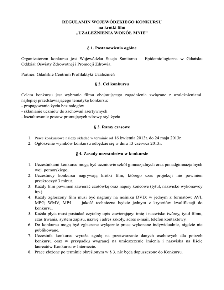 REGULAMIN WOJEWÓDZKIEGO KONKURSU na krótki film „UZALEŻNIENIA WOKÓŁ MNIE” § 1. Postanowienia ogólne Organizatorem konkursu jest Wojewódzka Stacja Sanitarno – Epidemiologiczna w Gdańsku Oddział Oświaty Zdrowotnej i Promocji Zdrowia. Partner: Gdańskie Centrum Profilaktyki Uzależnień § 2. Cel konkursu Celem konkursu jest wybranie filmu obejmującego zagadnienia związane z uzależnieniami. najlepiej przedstawiającego tematykę konkursu: - propagowanie życia bez nałogów - skłanianie uczniów do zachowań asertywnych - kształtowanie postaw promujących zdrowy styl życia § 3. Ramy czasowe 1. Prace konkursowe należy składać w terminie od 16 kwietnia 2013r. do 24 maja 2013r. 2. Ogłoszenie wyników konkursu odbędzie się w dniu 13 czerwca 2013r. § 4. Zasady uczestnictwa w konkursie 1. Uczestnikami konkursu mogą być uczniowie szkół gimnazjalnych oraz ponadgimnazjalnych woj. pomorskiego, 2. Uczestnicy konkursu nagrywają krótki film, którego czas projekcji nie powinien przekroczyć 3 minut. 3. Każdy film powinien zawierać czołówkę oraz napisy końcowe (tytuł, nazwisko wykonawcy itp.). 4. Każdy zgłoszony film musi być nagrany na nośniku DVD: w jednym z formatów: AVI, MPG, WMV, MP4 – jakość techniczna będzie jednym z kryteriów kwalifikacji do konkursu. 5. Każda płyta musi posiadać czytelny opis zawierający: imię i nazwisko twórcy, tytuł filmu, czas trwania, system zapisu, nazwę i adres szkoły, adres e-mail, telefon kontaktowy. 6. Do konkursu mogą być zgłaszane wyłącznie prace wykonane indywidualnie, nigdzie nie publikowane. 7. Uczestnik konkursu wyraża zgodę na przetwarzanie danych osobowych dla potrzeb konkursu oraz w przypadku wygranej na umieszczenie imienia i nazwiska na liście laureatów Konkursu w Internecie. 8. Prace złożone po terminie określonym w § 3, nie będą dopuszczone do Konkursu. § 5. Terminarz konkursu: 1. Konkurs odbywa się na poziomie powiatowym i wojewódzkim. 2. Prace przekazywane są przesyłką pocztową (decydująca jest data stempla pocztowego) w następujący sposób: uczestnicy przekazują do Powiatowej Stacji Sanitarno – Epidemiologicznej, ul. Piotra Skargi 8, 76-200 Słupsk zwanej dalej „PSSE", jedną pracę w terminie do 24 maja 2013r. PSSE przekazuje do Wojewódzkiej Stacji Sanitarno - Epidemiologicznej, zwanej dalej „WSSE" jedną pracę, która zajęła I miejsce w etapie powiatowym konkursu, w terminie do 31 maja 2013r. Określa się następujący czas rozstrzygnięcia konkursu: poziom powiatowy w terminie od 25 maja do 31 maja 2013 r. poziom wojewódzki w terminie od 1 czerwca do 10 czerwca 2013 r. § 6. Kryteria oceny Komisji Konkursowej 1. Prace będą oceniane z uwzględnieniem następujących kryteriów: zastosowanie się do wytycznych regulaminu, zgodność z tematyką czytelność przekazu pomysłowość projektu jakość techniczna zastosowane efekty oraz sposób montażu. 2. Prace, które nie spełnią zasad określonych w § 4 nie będą ocenione. §7. Nagrody konkursowe Na każdym z etapów konkursu wyłania się następującą liczbę laureatów, odpowiednio: • na etapie powiatowym 3 laureatów (I. II, III miejsce) • na etapie wojewódzkim 3 laureatów (I, II. III miejsce) Rodzaje nagród przyznawanych na poszczególnych etapach konkursu: a) powiatowym – dyplom uczestnictwa, zamieszczenie informacji na stronie internetowej Powiatowej Stacji Sanitarno - Epidemiologicznej, b) wojewódzkim – zamieszczenie informacji na stronie internetowej Wojewódzkiej Stacji Sanitarno – Epidemiologicznej, nagrody rzeczowe. Lista zwycięzców konkursu i ogłoszenie wyników zostanie zamieszczona na stronie internetowej: www.wsse.gda.pl do 15 czerwca 2013r. Organizatorzy zastrzegają sobie prawo do zmiany nagród na równorzędne lub do zmiany podziału nagród w związku z ustaleniami podjętymi w czasie obrad Komisji Konkursowej. § 8. Prawa autorskie 1. Z chwilą przystąpienia do konkursu Organizator nabywa na zasadzie wyłączności, nieodpłatnie autorskie prawa majątkowe i prawa pokrewne do nieograniczonego w czasie korzystania i rozporządzania dziełem 2. Zespół autorski filmu posiada zgodę każdej osoby występującej w filmie do publikacji filmu na wszelkich polach eksploatacji (Organizator jest upoważniony do weryfikacji posiadanych zgód). 3. Film nie został wykonany na odpłatne zlecenie przez Zespół; 4. Film nie jest reklamą lub antyreklamą produktu lub marki (nie pokazuje logotypów i marek produktów, sprzętu itp.). 5. Przekazanie praw autorskich zostanie potwierdzone na piśmie; umowa zostanie zawarta po wyłonieniu zwycięskich prac. § 9 Pozostałe ustalenia Decyzja Komisji Konkursowej jest ostateczna i nie podlega odwołaniu. Organizatorzy mogą przerwać lub odwołać konkurs bez podania przyczyn. Niniejszy regulamin jest jedynym dokumentem określającym zasady konkursu. W sytuacjach nie objętych regulaminem rozstrzygają organizatorzy. Organizator nie zwraca kosztów poniesionych w związku z uczestnictwem w Konkursie Zespoły, które naruszą Regulamin Konkursu, jak również obowiązujące w Polsce przepisy prawa powszechnego oraz ogólnie przyjęte normy społeczne i obyczajowe, zostaną wykluczeni z Konkursu. 7. Organizator nie ponosi odpowiedzialności za podanie nieprawdziwych danych lub danych osoby trzeciej przez Zespół. 8. Organizator nie odpowiada za uszkodzenia powstałe podczas doręczania przez pocztę lub kuriera filmów zgłaszanych na Konkurs. 9. Organizator nie zwraca nadesłanych prac konkursowych. 1. 2. 3. 4. 5. 6. § 10 Załączniki do regulaminu konkursu 1. Zgoda przedstawiciela ustawowego dziecka na udział w konkursie, które nie ukończyło 18 roku życia 2. Oświadczenie pełnoletniego uczestnika konkursu 3. Formularz przeniesienia praw autorskich Serdecznie zapraszamy do udziału w konkursie i życzymy powodzenia Organizator