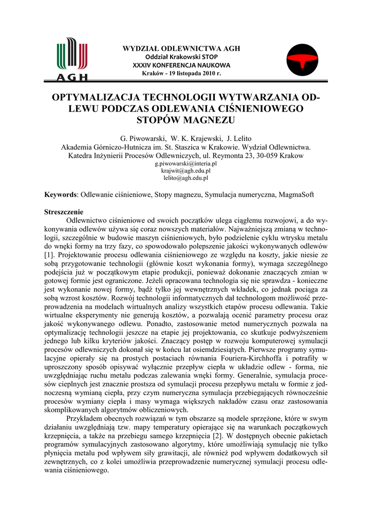 WYDZIAŁ ODLEWNICTWA AGH Oddział Krakowski STOP XXXIV KONFERENCJA NAUKOWA Kraków - 19 listopada 2010 r. OPTYMALIZACJA TECHNOLOGII WYTWARZANIA ODLEWU PODCZAS ODLEWANIA CIŚNIENIOWEGO STOPÓW MAGNEZU G. Piwowarski, W. K. Krajewski, J. Lelito Akademia Górniczo-Hutnicza im. St. Staszica w Krakowie. Wydział Odlewnictwa. Katedra Inżynierii Procesów Odlewniczych, ul. Reymonta 23, 30-059 Krakow [email protected] [email protected] [email protected] Keywords: Odlewanie ciśnieniowe, Stopy magnezu, Symulacja numeryczna, MagmaSoft Streszczenie Odlewnictwo ciśnieniowe od swoich początków ulega ciągłemu rozwojowi, a do wykonywania odlewów używa się coraz nowszych materiałów. Najważniejszą zmianą w technologii, szczególnie w budowie maszyn ciśnieniowych, było podzielenie cyklu wtrysku metalu do wnęki formy na trzy fazy, co spowodowało polepszenie jakości wykonywanych odlewów [1]. Projektowanie procesu odlewania ciśnieniowego ze względu na koszty, jakie niesie ze sobą przygotowanie technologii (głównie koszt wykonania formy), wymaga szczególnego podejścia już w początkowym etapie produkcji, ponieważ dokonanie znaczących zmian w gotowej formie jest ograniczone. Jeżeli opracowana technologia się nie sprawdza - konieczne jest wykonanie nowej formy, bądź tylko jej wewnętrznych wkładek, co jednak pociąga za sobą wzrost kosztów. Rozwój technologii informatycznych dał technologom możliwość przeprowadzenia na modelach wirtualnych analizy wszystkich etapów procesu odlewania. Takie wirtualne eksperymenty nie generują kosztów, a pozwalają ocenić parametry procesu oraz jakość wykonywanego odlewu. Ponadto, zastosowanie metod numerycznych pozwala na optymalizację technologii jeszcze na etapie jej projektowania, co skutkuje podwyższeniem jednego lub kilku kryteriów jakości. Znaczący postęp w rozwoju komputerowej symulacji procesów odlewniczych dokonał się w końcu lat osiemdziesiątych. Pierwsze programy symulacyjne opierały się na prostych postaciach równania Fouriera-Kirchhoffa i potrafiły w uproszczony sposób opisywać wyłącznie przepływ ciepła w układzie odlew - forma, nie uwzględniając ruchu metalu podczas zalewania wnęki formy. Generalnie, symulacja procesów cieplnych jest znacznie prostsza od symulacji procesu przepływu metalu w formie z jednoczesną wymianą ciepła, przy czym numeryczna symulacja przebiegających równocześnie procesów wymiany ciepła i masy wymaga większych nakładów czasu oraz zastosowania skomplikowanych algorytmów obliczeniowych. Przykładem obecnych rozwiązań w tym obszarze są modele sprzężone, które w swym działaniu uwzględniają tzw. mapy temperatury opierające się na warunkach początkowych krzepnięcia, a także na przebiegu samego krzepnięcia [2]. W dostępnych obecnie pakietach programów symulacyjnych zastosowano algorytmy, które umożliwiają symulację nie tylko płynięcia metalu pod wpływem siły grawitacji, ale również pod wpływem dodatkowych sił zewnętrznych, co z kolei umożliwia przeprowadzenie numerycznej symulacji procesu odlewania ciśnieniowego. Przedmiotem przeprowadzonych w ramach niniejszej pracy badań była numeryczna symulacja procesu wykonania odlewu (Rysunek 1) przy pomocy ciśnieniowego urządzenia z gorącą komorą prasowania, ze stopu AZ91D (o składzie podanym w Tabeli 1). Symulacje procesów zapełniania wnęki formy ciekłym stopem AZ91D oraz stygnięcia i krzepnięcia wykonane zostały przy pomocy programu MAGMASoft. Tabela 1. Udziały masowe pierwiastków w stopie AZ91D [3] Al 8.5 - 9.5 Mn Zn Si max 0.17 - 0.3 0.45 - 0.9 0.05 Cu max 0.025 Ni max 0.001 Fe max 0.004 Be 0.0005 0.0015 Inne max 0.01 Rys. 1. Obszary odlewu, w których może wystąpić porowatość i/lub powstanie niedolew. a) dla wąskiej szczeliny wlewowej; b) dla poszerzonej szczeliny wlewowej Zastosowana w pracy analiza procesów wymiany ciepła i masy przy pomocy ww. symulacji komputerowej pozwoliła na wyeliminowanie w opracowanej uprzednio technologii niebezpieczeństwa wystąpienia w odlewach niedolewów i/lub porowatości skurczowych, spowodowanych zbyt wąską szczeliną wlewową, co zobrazowano przykładowo na Rysunku 1. Podziękowanie Autorzy dziekują Komisji Europejskiej za wsparcie finansowe w ramach projektu Marie Curie TOK-DEV MTKD-CT-2006-042468 Literatura 1. Dańko J.: Maszyny i urządzenia do odlewania pod ciśnieniem. Wydawnictwa Naukowo – Dydaktyczne AGH. Kraków 2000 2. Ignaszak Z.: Virtual prototyping w odlewnictwie. Bazy danych i walidacja. Wydawnictwo Politechniki Poznańskiej. Poznań 2002 3. http://www.alpha.krakow.pl (10.09.2007) 4. Piwowarski G.: Praca dyplomowa magisterska. Wydział Odlewnictwa AGH. Kraków 2008 (niepublikowana)
