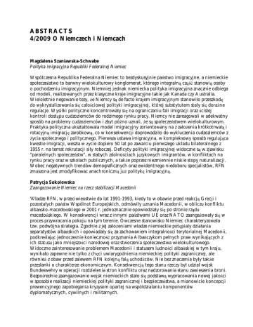 ABSTRACTS 4/2009 O Niemczech i Niemcach Magdalena Szaniawska-Schwabe Polityka imigracyjna Republiki Federalnej Niemiec Wspó czesna Republika Federalna Niemiec to bezdyskusyjnie pa stwo imigracyjne, a niemieckie spo ecze stwo to barwny wielokulturowy konglomerat, którego integraln cz stanowi osoby o pochodzeniu imigracyjnym. Niemniej jednak niemiecka polityka imigracyjna znacznie odbiega od modeli, realizowanych przez klasyczne kraje imigracyjne takie jak Kanada czy Australia. Wieloletnie negowanie tezy, e Niemcy s de facto krajem imigracyjnym stanowi o przeszkod do wykrystalizowania si ca o ciowej polityki imigracyjnej, której substytutem sta y si dora ne regulacje. Wysi ki polityczne koncentrowa y si na ograniczaniu fali imigracji oraz cis ej kontroli dost pu cudzoziemców do rodzimego rynku pracy. Niemcy nie zareagowali w adekwatny sposób na problemy cudzoziemców i zbyt pó no uznali, e s spo ecze stwem wielokulturowym. Praktyka polityczna ukszta towa a model imigracyjny zorientowany na z za o enia krótkotrwa i rotacyjn imigracj zarobkow , co w konsekwencji doprowadzi o do wykluczenia cudzoziemców z ycia spo ecznego i politycznego. Pierwsza ustawa imigracyjna, w kompleksowy sposób reguluj ca kwestie imigracji, wesz a w ycie dopiero 50 lat po zawarciu pierwszego uk adu bilateralnego z 1955 r. na temat rekrutacji si y roboczej. Deficyty polityki imigracyjnej widoczne s w zjawisku "paralelnych spo ecze stw", w s abych zdolno ciach j zykowych imigrantów, w konfliktach na rynku pracy oraz w szko ach publicznych, a tak e poprzez niezmiennie niskie stopy naturalizacji. Wobec negatywnych trendów demograficznych oraz ewidentnego niedoboru specjalistów, RFN zmuszona jest zmodyfikowa anachroniczn ju polityk imigracyjn . Patrycja Soko owska Zaanga owanie Niemiec na rzecz stabilizacji Macedonii adze RFN, w przeciwie stwie do lat 1991-1993, kiedy to w obawie przed reakcj Grecji i pozosta ych pa stw Wspólnot Europejskich, odmówi y uznania Macedonii, w obliczu konfliktu alba sko-macedo skiego w 2001 r. jednoznacznie opowiedzia y si po stronie rz du macedo skiego. W konsekwencji wraz z innymi pa stwami UE oraz NATO zaanga owa y si w proces przywracania pokoju na tym terenie. Ówczesne stanowisko Niemiec charakteryzowa a tzw. podwójna strategia. Zgodnie z jej za o eniami w adze niemieckie pot pia y dzia ania separatystów alba skich i opowiada y si za zachowaniem integralno ci terytorialnej Macedonii, podkre laj c jednocze nie konieczno przyznania Alba czykom pe nych praw wynikaj cych z ich statusu jako mniejszo ci narodowej oraz stworzenia spo ecze stwa wielokulturowego. Widoczne zainteresowanie problemem Macedonii i statusem ludno ci alba skiej w tym kraju, wynika o zapewne nie tylko z ch ci uwiarygodnienia niemieckiej polityki zagranicznej, ale równie z obaw przed zalewem RFN kolejn fal uchod ców. Nie bez znaczenia by y tak e przes anki o charakterze ekonomicznym. Konsekwencj tego stanu rzeczy by udzia wojsk Bundeswehry w operacji rozdzielenia stron konfliktu oraz nadzorowania stanu zawieszenia broni. Bezpo rednie zaanga owanie wojsk niemieckich sta o si podstaw wypracowania nowej jako ci w sposobie realizacji niemieckiej polityki zagranicznej i bezpiecze stwa, a mianowicie koncepcji prewencyjnego zapobiegania kryzysom opartej na wspó dzia aniu komponentów dyplomatycznych, cywilnych i militarnych. Maria Wagi ska-Marzec Kontrowersje wokó odbudowy zamku berli skiego jako wyraz sporu o to samo Niemców Zjednoczenie Niemiec w 1990 r. sprawi o, e powróci a kwestia ukszta towania na nowo historycznego centrum Berlin. Du e kontrowersje budzi a odbudowa zamku jako dawnej siedziby margrafów i elektorów brandenburskich. Pierwotny zamek, wybudowany w latach 1443-1451 na zlecenie ksi cia elektora Fryderyka II, by pó niej wielokrotnie odnawiany i przebudowywany. Pod koniec II wojny wiatowej zamek uleg powa nemu zniszczeniu. W wyniku podzia u Niemiec kompleks zamkowy znalaz si wraz z wysp muzealn na terytorium NRD. W 1950 r. zamek, na zlecenie Waltera Ulbricha, ówczesnego szefa komunistycznej SED zosta wysadzony w powietrze i w 1973 r. na jego miejscu stan Pa ac Republiki. Po zjednoczeniu Niemiec dla wypracowania konkretnych rozwi za dotycz cych zagospodarowania placu zamkowego oraz architektonicznego kszta tu nowej budowli zamkowej w centrum Berlina i jej przysz ego wykorzystania powo ano specjalne gremium ekspertów: Historyczne Centrum Berlina (Historische Mitte Berlin). W dniu 28 listopada 2008 r. zosta og oszony werdykt jury na projekt odbudowy zamku, którego zwyci zc zosta w oski architekt Francesco Stella. Zgodnie z zaleceniami Komisji Historische Mitte Berlin nowy obiekt zamkowy, dla którego przyj to nazw Humboldt-Forum, ma si sta miejscem "dialogu kultur i nauki" i by przeznaczony na cele muzealno-uniwersyteckie. Uko czenie budowy planowane jest na rok 2013, najpó niej 2015 r. Spór wokó zamku ukaza ró ny stosunek do tradycji i wydarze z przesz o ci, a tak e odmienne wizje przysz o ci w spo ecze stwie niemieckim. Jest on wyrazem poszukiwania to samo ci narodowej Niemców po upadku muru berli skiego. Ods oni te ró nice w postawach estetycznych: mi dzy zwolennikami zachowania tradycji a zwolennikami nowoczesno ci w architekturze. Justyna Balisz Arty ci a historia. Kilka uwag o recepcji faszyzmu w sztuce niemieckiej Tekst stanowi przegl d zjawiska recepcji drugiej wojny wiatowej w sztuce niemieckiej po 1945 r. Punkty zwrotne przedstawione zosta y tu na przyk adzie kluczowych wydarze artystycznych i ich recepcji. Jest to opowie o prze amywaniu zmowy milczenia w sztuce i o poszukiwaniu odpowiedniej formy, która pozwoli aby na konfrontacj z przesz o ci . Droga ta wiod a od tryumfu "milczacej" abstrakcji, przez rebeli neoekspresjonistów przeciwko wypieraniu lat wojny z pami ci, do pluralizmu form i wypowiedzi na temat niemieckiej historii. Tekst ukazuje tak e w jaki sposób arty ci, po wywalczeniu dla siebie mo liwo ci zabrania g osu w dyskusji o skutkach II wojny wiatowej, przycz