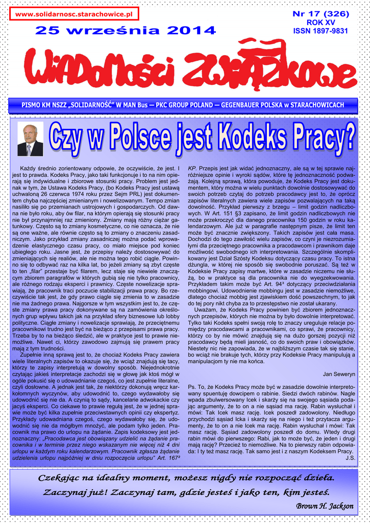 www.solidarnosc.starachowice.pl 25 września 2014 Nr 17 (326) ROK XV ISSN 1897-9831 PISMO KM NSZZ „SOLIDARNOŚĆ” W MAN Bus — PKC GROUP POLAND — GEGENBAUER POLSKA w STARACHOWICACH Każdy średnio zorientowany odpowie, że oczywiście, że jest. I jest to prawda. Kodeks Pracy, jako taki funkcjonuje i to na nim opierają się indywidualne i zbiorowe stosunki pracy. Problem jest jednak w tym, że Ustawa Kodeks Pracy, (bo Kodeks Pracy jest ustawą uchwaloną 26 czerwca 1974 roku przez Sejm PRL) jest dokumentem chyba najczęściej zmienianym i nowelizowanym. Tempo zmian nasiliło się po przemianach ustrojowych i gospodarczych. Od dawna nie było roku, aby ów filar, na którym opierają się stosunki pracy nie był przynajmniej raz zmieniony. Zmiany mają różny ciężar gatunkowy. Często są to zmiany kosmetyczne, co nie oznacza, że nie są one ważne, ale równie często są to zmiany o znaczeniu zasadniczym. Jako przykład zmiany zasadniczej można podać wprowadzenie elastycznego czasu pracy, co miało miejsce pod koniec ubiegłego roku. Jasne jest, że przepisy należy dostosowywać do zmieniających się realiów, ale nie można tego robić ciągle. Powinno się to odbywać raz na kilka lat, bo jeżeli zmiany są zbyt częste to ten „filar” przestaje być filarem, lecz staje się niewiele znaczącym zbiorem paragrafów w których gubią się nie tylko pracownicy, ale różnego rodzaju eksperci i prawnicy. Częste nowelizacje sprawiają, że pracownik traci poczucie stabilizacji prawa pracy. Bo rzeczywiście tak jest, że gdy prawo ciągle się zmienia to w zasadzie nie ma żadnego prawa. Najgorsze w tym wszystkim jest to, że częste zmiany prawa pracy dokonywane są na zamówienia określonych grup wpływu takich jak na przykład sfery biznesowe lub lobby polityczne. Ciągłe zmiany i nowelizacje sprawiają, że przeciętnemu pracownikowi trudno jest być na bieżąco z przepisami prawa pracy. Trzeba by to na bieżąco śledzić, ale w praktyce jest to prawie niemożliwe. Nawet ci, którzy zawodowo zajmują się prawem pracy mają z tym trudności. Zupełnie inną sprawą jest to, że chociaż Kodeks Pracy zawiera wiele literalnych zapisów to okazuje się, że wciąż znajdują się tacy, którzy te zapisy interpretują w dowolny sposób. Niejednokrotnie czytając jakieś interpretacje zachodzi się w głowę jak ktoś mógł w ogóle pokusić się o udowadnianie czegoś, co jest zupełnie literalne, czyli dosłowne. A jednak jest tak, że niektórzy dokonują wręcz karkołomnych wyczynów, aby udowodnić to, czego wydawałoby się udowodnić się nie da. A czynią to sądy, kancelarie adwokackie czy jacyś eksperci. Co ciekawe to prawie regułą jest, że w jednej sprawie może być kilka zupełnie przeciwstawnych opinii czy ekspertyz. Przykłady udowadniana czegoś, czego wydawałoby się, że udowodnić się nie da mógłbym mnożyć, ale podam tylko jeden. Pracownik ma prawo do urlopu na żądanie. Zapis kodeksowy jest jednoznaczny: „Pracodawca jest obowiązany udzielić na żądanie pracownika i w terminie przez niego wskazanym nie więcej niż 4 dni urlopu w każdym roku kalendarzowym. Pracownik zgłasza żądanie udzielenia urlopu najpóźniej w dniu rozpoczęcia urlopu” Art. 167² KP. Przepis jest jak widać jednoznaczny, ale są w tej sprawie najróżniejsze opinie i wyroki sądów, które tę jednoznaczność podważają. Kolejną sprawą, która powoduje, że Kodeks Pracy jest dokumentem, który można w wielu punktach dowolnie dostosowywać do swoich potrzeb czytaj do potrzeb pracodawcy jest to, że oprócz zapisów literalnych zawiera wiele zapisów pozwalających na taką dowolność. Przykład pierwszy z brzegu – limit godzin nadliczbowych. W Art. 151 §3 zapisano, że limit godzin nadliczbowych nie może przekroczyć dla danego pracownika 150 godzin w roku kalendarzowym. Ale już w paragrafie następnym pisze, że limit ten może być znacznie zwiększony. Takich zapisów jest cała masa. Dochodzi do tego zawiłość wielu zapisów, co czyni je niezrozumiałymi dla przeciętnego pracownika a pracodawcom i prawnikom daje możliwość swobodnego ich interpretowania. Szczególnie skomplikowany jest Dział Szósty Kodeksu dotyczący czasu pracy. To istna dżungla, w której nie sposób się swobodnie poruszać. Są też w Kodeksie Pracy zapisy martwe, które w zasadzie niczemu nie służą, bo w praktyce są dla pracownika nie do wyegzekwowania. Przykładem takim może być Art. 94³ dotyczący przeciwdziałania mobbingowi. Udowodnienie mobbingu jest w zasadzie niemożliwe, dlatego chociaż mobbig jest zjawiskiem dość powszechnym, to jak do tej pory nikt chyba za to przestępstwo nie został ukarany. Uważam, że Kodeks Pracy powinien być zbiorem jednoznacznych przepisów, których nie można by było dowolnie interpretować. Tylko taki Kodeks spełni swoją rolę to znaczy ureguluje relacje pomiędzy pracodawcami a pracownikami, co sprawi, że pracownicy, którzy co by nie mówić znajdują się na dużo gorszej pozycji niż pracodawcy będą mieli jasność, co do swoich praw i obowiązków. Niestety nic nie zapowiada, że w najbliższym czasie tak się stanie, bo wciąż nie brakuje tych, którzy przy Kodeksie Pracy manipulują a manipulacjom ty nie ma końca. Jan Seweryn Ps. To, że Kodeks Pracy może być w zasadzie dowolnie interpretowany spuentuję dowcipem o rabinie. Siedzi dwóch rabinów. Nagle wpada zbulwersowany Icek i skarży się na swojego sąsiada podając argumenty, że to on a nie sąsiad ma rację. Rabin wysłuchał i mówi: Tak Icek masz rację. Icek poszedł zadowolony. Niedługo przychodzi sąsiad Icka i skarży się na niego i też przytacza argumenty, że to on a nie Icek ma rację. Rabin wysłuchał i mówi: Tak masz rację. Sąsiad zadowolony poszedł do domu. Wtedy drugi rabin mówi do pierwszego: Rabi, jak to może być, że jeden i drugi mają rację? Przecież to niemożliwe. Na to pierwszy rabin odpowiada: I ty też 