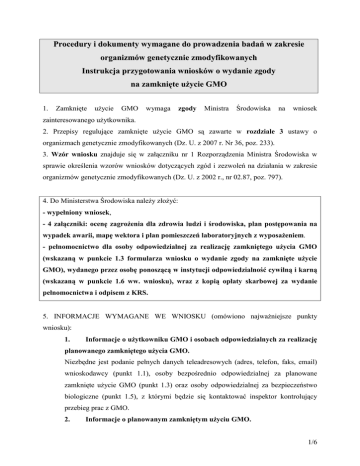 Procedury i dokumenty wymagane do prowadzenia badań w zakresie organizmów genetycznie zmodyfikowanych Instrukcja przygotowania wniosków o wydanie zgody na zamknięte użycie GMO 1. Zamknięte użycie GMO wymaga zgody Ministra Środowiska na wniosek zainteresowanego użytkownika. 2. Przepisy regulujące zamknięte użycie GMO są zawarte w rozdziale 3 ustawy o organizmach genetycznie zmodyfikowanych (Dz. U. z 2007 r. Nr 36, poz. 233). 3. Wzór wniosku znajduje się w załączniku nr 1 Rozporządzenia Ministra Środowiska w sprawie określenia wzorów wniosków dotyczących zgód i zezwoleń na działania w zakresie organizmów genetycznie zmodyfikowanych (Dz. U. z 2002 r., nr 02.87, poz. 797). 4. Do Ministerstwa Środowiska należy złożyć: - wypełniony wniosek, - 4 załączniki: ocenę zagrożenia dla zdrowia ludzi i środowiska, plan postępowania na wypadek awarii, mapę wektora i plan pomieszczeń laboratoryjnych z wyposażeniem. - pełnomocnictwo dla osoby odpowiedzialnej za realizację zamkniętego użycia GMO (wskazaną w punkcie 1.3 formularza wniosku o wydanie zgody na zamknięte użycie GMO), wydanego przez osobę ponoszącą w instytucji odpowiedzialność cywilną i karną (wskazaną w punkcie 1.6 ww. wniosku), wraz z kopią opłaty skarbowej za wydanie pełnomocnictwa i odpisem z KRS. 5. INFORMACJE WYMAGANE WE WNIOSKU (omówiono najważniejsze punkty wniosku): 1. Informacje o użytkowniku GMO i osobach odpowiedzialnych za realizację planowanego zamkniętego użycia GMO. Niezbędne jest podanie pełnych danych teleadresowych (adres, telefon, faks, email) wnioskodawcy (punkt 1.1), osoby bezpośrednio odpowiedzialnej za planowane zamknięte użycie GMO (punkt 1.3) oraz osoby odpowiedzialnej za bezpieczeństwo biologiczne (punkt 1.5), z którymi będzie się kontaktować inspektor kontrolujący przebieg prac z GMO. 2. Informacje o planowanym zamkniętym użyciu GMO. 1/6 Tytuł oraz streszczenie należy podać w wersji polskiej i angielskiej. 3. Informacje o GMO, konieczne do określenia stopnia zagrożenia. Wymagane jest podanie szczegółowych informacji, ze szczególnym uwzględnieniem tych, które mają bezpośredni wpływ na bezpieczeństwo. W punktach 3.7 i 3.20 należy wymienić dodatkowo geny warunkujące oporność na określone antybiotyki. W punktach 3.34d. i 3.34f. (charakterystyka GMO) konieczne jest podanie szczegółowych informacji odnośnie metod. 5. Znane lub przewidywane skutki niekontrolowanego rozprzestrzenienia GMO dla środowiska i zdrowia człowieka, w tym, czy znana jest otaczająca fauna i flora, której mógłby zostać przekazany materiał genetyczny GMO. W tym miejscu użytkownik powinien podać informacje, które potwierdzą, że uzyskane GMO może samodzielnie bytować w środowisku, bądź zupełnie nie jest w stanie żyć w warunkach naturalnych. 7. Planowane poziomy i rodzaje zabezpieczeń. W punkcie 7.1 ważne są numery pomieszczeń oraz ich lokalizacja w budynku. W punkcie 7.2 należy dodatkowo wymienić specjalistyczne urządzenia laboratoryjne wykorzystywane w projekcie, bezpośrednio związane z biologią molekularną (np. zestaw do analizy zróżnicowania genetycznego, termocykler, spektrofotometr itp.) W punkcie 7.4 konieczne jest podanie szczegółowych informacji. 8. Ochrona profilaktyczna pracowników. a) Wykształcenie i doświadczenie pracowników (w tym odbyte szkolenia). Sporządzenie imiennej listy osób zatrudnionych na stałe przy realizacji planowanego zamkniętego użycia oraz osób, które będą miały stale bezpośredni dostęp do miejsc, w których wykonywany będzie projekt. Jeżeli pracownicy odbywali staże trzeba podać, którzy, w jakich laboratoriach i czego one dotyczyły. W przypadku kierownika projektu należy wymienić wcześniejsze prace z zamkniętym użyciem GMO. Uwaga: w przypadkach, w których informacja nie dotyczy opisywanego biorcy, dawcy, wektora lub GMO wnioskodawca powinien wpisać słowo „nie dotyczy”. Nie można pozostawiać żadnego pustego, niewypełnionego pola. 6. INFORMACJE WYMAGANE W ZAŁĄCZNIKACH: 2/6 a. Ocena zagrożenia dla zdrowia ludzi i środowiska. Konieczność przygotowania takiego załącznika wynika z przepisów art. 6 i 7 ustawy o organizmach genetycznie zmodyfikowanych Dz. U. z 2007 r. Nr 36, poz. 233). oraz Rozporządzenia Ministra Środowiska z dnia 8 lipca 2002 r. (Dz. U. Nr 02.107, poz. 944) w sprawie określenia szczegółowego sposobu przeprowadzenia oceny zagrożenia dla zdrowia ludzi i środowiska w związku z podjęciem działań polegających na zamkniętym użyciu GMO, zamierzonym uwolnieniu GMO do środowiska w tym wprowadzeniu do obrotu produktów GMO, oraz wymagań, jakie powinna spełniać dokumentacja zawierająca ustalenia takiej oceny. Ocenę zagrożenia wnioskodawcy przygotowują wg schematu: 1) określenie elementów służących wytworzeniu mikroorganizmów genetycznie zmodyfikowanych: a) opis mikroorganizmu – biorcy, b) opis mikroorganizmu – dawcy, c) opis insertu, d) opis użytego wektora, e) opis powstałego mikroorganizmu genetycznie zmodyfikowanego; 2) identyfikację szkodliwych właściwości a) mikroorganizmu – biorcy, b) mikroorganizmu – dawcy, c) insertu, d) użytego wektora, e) powstałego mikroorganizmu genetycznie zmodyfikowanego 3) określenie wszelkich zmian w organizmie mikroorganizmu - biorcy po wprowadzeniu do niego insertu. 4) określenie prawdopodobieństwa wystąpienia potencjalnie szkodliwych skutków, jakie mogą być wywoływane przez mikroorganizm genetycznie zmodyfikowany, 5) charakterystykę prac wykonywanych z użyciem mikroorganizmów genetycznie zmodyfikowanych podczas zamkniętego użycia z uwzględnieniem warunków hermetyczności podczas zamkniętego użycia, 6) określenie rodzaju odpadów powstających podczas zamkniętego użycia mikroorganizmów genetycznie zmodyfikowanych, 7) postępowanie z odpadami i ściekami powstającymi podczas zamkniętego użycia mikroorganizmów genetycznie zmodyfikowanych, 3/6 8)