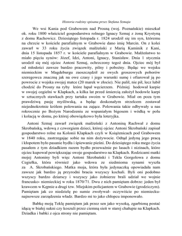Historia rodziny spisana przez Stefana Szmaja We wsi Kania pod Grabowem nad Prosną (woj. Poznańskie) mieszkał ok. roku 1800 właściciel gospodarstwa rolnego Ignacy Szmaj z żoną Krystyną z domu Rachowicz. Dziesiątego listopada r. 1824 urodził się im syn, któremu na chrzcie w kościele parafialnym w Grabowie dano imię Marcin. On z kolei zawarł w 33 roku życia związek małżeński z Marią Kaminik z Kani, dnia 15 listopada 1857 r. w kościele parafialnym w Grabowie. Małżeństwo to miało pięciu synów: Józef, Idzi, Antoni, Ignacy, Stanisław. Dnia 1 stycznia urodził się mój ojciec Antoni Szmaj, ochrzczony tegoż dnia. Ojciec mój był od młodości zawsze bardzo pracowity, pilny i pobożny. Będąc we wojsku niemieckim w Magdeburgu zaoszczędził ze swych groszowych poborów szeregowca znaczną jak na owe czasy i jego warunki sumę i ofiarował ją po powrocie z wojska swojej matce (20 marek w złocie). Nie palił, nie pił, lecz lubił chodzić do Prosny na ryby które łapał węcierzem. Później hodował karpie w swojej cegielni w Klapkach, a kilka lat przed śmiercią założył hodowle karpi w sztucznych stawkach przy tartaku swoim w Grabowie. Miał on poza tym prawdziwą pasję myśliwską, a będąc doskonałym strzelcem zostawał niejednokrotnie królem polowania na zające. Polowania takie odbywały u nas rokrocznie po Bożym Narodzeniu ze wspaniałym bigosem i wódką w polu i kolacją w domu, po której obowiązkowo była loteryjka. Antoni Szmaj zawarł związek małżeński z Antoniną Rachwał z domu Skrobańską, wdową z czworgiem dzieci, której ojciec Antoni Skrobański zapisał gospodarstwo rolne na Kolonii Klapkach czyli w Książenicach pod Grabowem w 1840 roku, zastrzegając sobie na nim dożywocie. Odtąd jedyną jego pracą i kłopotem było pasanie bydła i śpiewanie pieśni. Do dziesiątego roku mego życia pasałem z tym dziadkiem razem bydło przeważnie po lasach i nizinach, które ojciec kupował powiększając swoje gospodarstwo na Klapkach. Rodzicami matki mojej Antoniny byli więc Antoni Skrobański i Tekla Gorgolowa z domu Cegiełka, która również jako wdowa ze siedmioma synami wyszła za A. Skrobańskiego. Matka moja, która była jedynaczką opowiadała nam zawsze jak bardzo ją przyrodni bracia wszyscy kochali. Byli oni podobno wszyscy bardzo dziarscy i wszyscy jako żołnierze brali udział we wojnie francusko- niemieckiej w roku 1870/71. Dwu z nich pamiętam dobrze: jeden był krawcem w Kępnie a drugi tzw. Miejskim policjantem w Grabowie (grodziczym). Pamiętam jak co niedzielę po sumie zwoływał- oczywiście po niemieckunajnowsze zarządzenia władz. Bardzo mi to jako chłopcu imponowało. Babkę moją Teklę pamiętam jak przez sen jako wysoką, zgarbioną postać idącą w białej sukni czy koszuli przez ciemną sień w starej chałupie na Klapkach. Dziadka i babki z ojca strony nie pamiętam. Gospodarstwo na kolonii Klapki należącej do wsi Książenice było wianem babki Tekli Cegiełkówny. Historią tego gospodarstwa była opłakana, bo było to właściwie zesłanie ojca babki Cegiełki przez dziedzica Książenic Wąstra. Cegiełka zdaje się Marcin wykarczował na Smolnikach pod Grabowem las i założył gospodarstwo ,,pod dębem”, z którego został przez Wąstra wysiedlony. Za dobrą ziemię i nowe budynki dostał stare rudery i kamienistą glebę. Procesował się aż we Wrocławiu, dokąd trzeba było końmi jeździć- kolei i szosy wtedy nie było- i proces oczywiście przegrał, bo jakżeż mógł jako chłop wygrać z dziedzicem. Tak to babka Tekla miała ciężkie życie i kiedy na dobitkę została wdową z kupą dzieci, marzyła o tym ażeby wyjść za wdowca Marcina Szmaja, mego dziadka z ojca strony, którego znała jako zasobnego i bardzo porządnego człowieka. Tymczasem dostał jej się Antoni Skrobański, który, Panie świeć nad jego duszą lubił nieco zaglądać do kieliszka. Marzenia babki miały się jednak spełnić, bo jej Antochna, tj. moja babka dostała syna Marcina, Antoniego, tj. mojego ojca. Antochna była również wdową z czworgiem dzieci po Rachwale. Matka moja Antonina urodziła się w r. 1859, dziewiątego czerwca i wyszła za Antoniego Szmaja w r. 1889 mając czworo dzieci z Rachwałem: Stanisławę, Franciszka, Maryannę i Antoniego Rachwałów, Maryanna (zmarła w styczniu 1961) i Antoni byli niemowami. (…) Ojciec mój po odbyciu służby wojskowej pracował jakiś czas w Niemczech w cegielni i nabył tam takiego doświadczenia w ceglarstwie, że po objęciu gospodarstwa z gliną w Klapkach przystąpił zaraz do budowy cegielni polowej. (…) W tym czasie mniej więcej nastąpiła likwidacja dóbr Książenice, które ojciec kupił („na subhaście”) od Wąstra i natychmiast rozparcelował między miejscowych gospodarzy, powiększając również znacznie swoje własne gospodarstwo. (…) A więc przede wszystkim pobudował sobie obszerny dom mieszkalny (cztery izby na parterze, jedna na poddaszu w szczycie) i wszystkie zabudowania gospodarcze ze wspaniałą stodołą widoczną na całą okolicę. (…) Uwieńczeniem dzieła pracowitego i twórczego życia mojego ojca było wykupienie tartaku parowego w Grabowie z rąk Żyda Grunfelda w r. 1909. Po przeprowadzeniu się z klapek do Grabowa zabrał się ojciec zaraz do budowania willi, którą też wykończył w r. 1910. Ma ona dwa mieszkania: na parterze 6 pokojów (z łazienką!) a na pierwszym piętrze 4 z kuchnią. Ogrzewanie centralne, wodociąg i oświetlenie elektryczne- unikat na całą okolicę. Wspaniałe piwnice z pralnią i piecem (tzw. „sabatnikiem”) do pieczenia chleba.