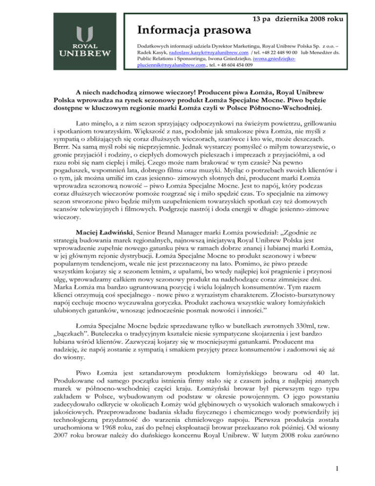 13 pa dziernika 2008 roku Informacja prasowa Dodatkowych informacji udziela Dyrektor Marketingu, Royal Unibrew Polska Sp. z o.o. – Radek Kasyk, [email protected] / tel. +48 22 448 90 00 lub Menedżer ds. Public Relations i Sponsoringu, Iwona Gniedziejko, iwona.gniedziejko‐ [email protected]., tel. + 48 604 454 009 A niech nadchodzą zimowe wieczory! Producent piwa Łomża, Royal Unibrew Polska wprowadza na rynek sezonowy produkt Łomża Specjalne Mocne. Piwo będzie dostępne w kluczowym regionie marki Łomża czyli w Polsce Północno-Wschodniej. Lato minęło, a z nim sezon sprzyjający odpoczynkowi na świeżym powietrzu, grillowaniu i spotkaniom towarzyskim. Większość z nas, podobnie jak smakosze piwa Łomża, nie myśli z sympatią o zbliżających się coraz dłuższych wieczorach, szarówce i kto wie, może deszczach. Brrrr. Na samą myśl robi się nieprzyjemnie. Jednak wystarczy pomyśleć o miłym towarzystwie, o gronie przyjaciół i rodziny, o ciepłych domowych pieleszach i imprezach z przyjaciółmi, a od razu robi się nam cieplej i milej. Czego może nam brakować w tym czasie? Na pewno pogaduszek, wspomnień lata, dobrego filmu oraz muzyki. Myśląc o potrzebach swoich klientów i o tym, jak można umilić im czas jesienno- zimowych słotnych dni, producent marki Łomża wprowadza sezonową nowość – piwo Łomża Specjalne Mocne. Jest to napój, który podczas coraz dłuższych wieczorów pomoże rozgrzać się i miło spędzić czas. To specjalnie na zimowy sezon stworzone piwo będzie miłym uzupełnieniem towarzyskich spotkań czy też domowych seansów telewizyjnych i filmowych. Podgrzeje nastrój i doda energii w długie jesienno-zimowe wieczory. Maciej Ładwiński, Senior Brand Manager marki Łomża powiedział: „Zgodnie ze strategią budowania marek regionalnych, najnowszą inicjatywą Royal Unibrew Polska jest wprowadzenie zupełnie nowego gatunku piwa w ramach dobrze znanej i lubianej marki Łomża, w jej głównym rejonie dystrybucji. Łomża Specjalne Mocne to produkt sezonowy i wbrew popularnym tendencjom, wcale nie jest przeznaczony na lato. Pomimo, że piwo przede wszystkim kojarzy się z sezonem letnim, z upałami, bo wtedy najlepiej koi pragnienie i przynosi ulgę, wprowadzamy całkiem nowy sezonowy produkt na nadchodzące coraz zimniejsze dni. Marka Łomża ma bardzo ugruntowaną pozycję i wielu lojalnych konsumentów. Tym razem klienci otrzymują coś specjalnego - nowe piwo z wyrazistym charakterem. Złocisto-bursztynowy napój cechuje mocno wyczuwalna goryczka. Produkt zachowa wszystkie walory łomżyńskich ulubionych gatunków, wnosząc jednocześnie posmak nowości i inności.” Łomża Specjalne Mocne będzie sprzedawane tylko w butelkach zwrotnych 330ml, tzw. „bączkach”. Buteleczka o tradycyjnym kształcie niesie sympatyczne skojarzenia i jest bardzo lubiana wśród klientów. Zazwyczaj kojarzy się w mocniejszymi gatunkami. Producent ma nadzieję, że napój zostanie z sympatią i smakiem przyjęty przez konsumentów i zadomowi się aż do wiosny. Piwo Łomża jest sztandarowym produktem łomżyńskiego browaru od 40 lat. Produkowane od samego początku istnienia firmy stało się z czasem jedną z najlepiej znanych marek w północno-wschodniej części kraju. Łomżyński browar był pierwszym tego typu zakładem w Polsce, wybudowanym od podstaw w okresie powojennym. O jego powstaniu zadecydowało odkrycie w okolicach Łomży wód głębinowych o wysokich walorach smakowych i jakościowych. Przeprowadzone badania składu fizycznego i chemicznego wody potwierdziły jej technologiczną przydatność do warzenia chmielowego napoju. Pierwsza produkcja została uruchomiona w 1968 roku, zaś do pełnej eksploatacji browar przekazano rok później. Od wiosny 2007 roku browar należy do duńskiego koncernu Royal Unibrew. W lutym 2008 roku zarówno 1 część produkcyjna, jak i handlowa zakładu zostały włączone w struktury Royal Unibrew Polska sp. z o.o. Marka Łomża weszła do protfolio całego koncernu jako strategiczna marka na polskim rynku. Opis produktu: Piwo Łomża Specjalne Mocne Produkt sezonowy Opakowania: butelka 330 ml tzw. „bączek” Zawartość alkoholu: 8,5% Sprzedaż: Polska Północno –Wschodnia , Dodatkowe informacje: Iwona Gniedziejko-Płuciennik Telefon Faks GSM Email: +48 22 448 90 00 +48 22 448 91 00 +48 604 45 40 09 [email protected] ––––––––––––––––––––––––––––––––––––––––––––––––––––––––––––––––––––––––––––––––––––– Royal Unibrew A/S jest drugą co do wielkości grupą w branży piwnej oraz największym eksporterem piwa w Skandynawii. Główna siedziba firmy mieści się w Faxe, w Danii. W skład Grupy Royal Unibrew wchodzi 13 browarów oraz jedna firma produkująca napoje. W Danii Grupa posiada 3 browary: Albani, Ceres i Faxe, na Litwie jest właścicielem marki Kalnapilis, a na Łotwie - Lacplesa oraz rozlewni napojów Cido. W Polsce posiada 100% udziałów w browarach Brok, Strzelec oraz Łomża, a na Karaibach dwa przedsiębiorstwa na Antigui i Dominice. 2