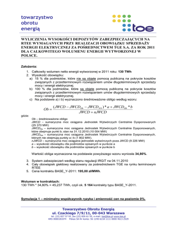 towarzystwo obrotu energią WYLICZENIA WYSOKOŚCI DEPOZYTÓW ZABEZPIECZAJĄCYCH NA RTEE WYMAGANYCH PRZY REALIZACJI OBOWIĄZKU SPRZEDAŻY ENERGII ELEKTRYCZNEJ ZA POŚREDNICTWEM TGE S.A. ZA ROK 2011 DLA CAŁKOWITEGO WOLUMENU ENERGII WYTWORZONEJ W POLSCE. Założenia: 1. Całkowity wolumen netto energii wytworzonej w 2011 roku: 130 TWh 2. Wysokość obowiązku: a) 15 % dla podmiotów, które nie są objęte pomocą publiczną na pokrycie kosztów związanych z przedterminowym rozwiązaniem umów długoterminowych sprzedaży mocy i energii elektrycznej. b) 100 % dla podmiotów, które są objęte pomocą publiczną na pokrycie kosztów związanych z przedterminowym rozwiązaniem umów długoterminowych sprzedaży mocy i energii elektrycznej. c) Na podstawie a) i b) wyznaczono średnioważone obligo według wzoru: Ob ( JWCD JWCDOb JWCDNN ) * a JWCDOb * b JWCD nJWCD gdzie: Ob – średnioważone obligo JWCD – sumaryczna moc osiągana Jednostek Wytwórczych Centralnie Dysponowanych (25 370 MW) JWCDOb – sumaryczna moc osiągana Jednostek Wytwórczych Centralnie Dysponowanych, które obejmuje punkt b; stan na 31.12.2010 (10 004 MW) JWCDNN – sumaryczna moc osiągana Jednostek Wytwórczych Centralnie Dysponowanych, których nie obejmują punkty a i b (1 802 MW). nJWCD – sumaryczna moc osiągana jednostek wytwórczych poza JWCD (9 226 MW) a – wysokość obowiązku dla podmiotów opisanych w punkcie a b – wysokość obowiązku dla podmiotów opisanych w punkcie b Wartość obliga wyznaczona na podstawie powyższego wzoru wyniosła 34,80%. 3. System zabezpieczeń według stanu regulacji IRGiT na 04.11.2010 4. Cały obowiązek giełdowy realizowany za pośrednictwem TGE na rynku terminowym RTEE 5. Cena kontraktu BASE_Y-2011: 195,00 zł/MWh. Wolumen w kontraktach: 130 TWh * 34,80% = 45,237 TWh, czyli ok. 5 164 kontrakty typu BASE_Y-2011. Symulacja 1 – minimalny współczynnik ryzyka i zmienność cen na poziomie 0%. Towarzystwo Obrotu Energią ul. Czackiego 7/9/11, 00-043 Warszawa tel. (22) 827 57 93 ,fax (22) 826 61 55, e-mail: [email protected] www.toe.pl KRS 0000181074 Pekao SA Nr konta: 56 1240 6218 1111 0000 4613 2529 towarzystwo obrotu energią Depozyt wstępny dla kupującego: 8760 MWh * 5164 * 4,89% * 195,00 zł/MWh = 431 357 068 zł Depozyt wstępny dla sprzedającego1: 8760 MWh * 5164 * 4,89% * 195,00 zł/MWh * 0,25 = 107 839 267 zł Depozyt uzupełniający2: 0 zł Fundusz gwarancyjny dla kupującego: (431 357 068 zł + 0 zł) * 15% = 64 703 560 zł Fundusz gwarancyjny dla sprzedającego: (107 839 267 zł + 0 zł) * 15% = 16 175 890 zł Razem obie strony kontraktów: 431 357 068 zł + 107 839 267 zł + 0 zł + 64 703 560 zł + 16 175 890 = 620 075 785 zł Symulacja 2 – średni współczynnik ryzyka3 i zmienność cen na poziomie 5%. Depozyt wstępny dla kupującego: 8760 MWh * 5164 * 6,71% * 195,00 zł/MWh = 591 903 053 zł Depozyt wstępny dla sprzedającego4: 8760 MWh * 5164 * 6,71% * 195,00 zł/MWh *1 = 591 903 053 zł Depozyt uzupełniający5: 8760 MWh * 5164 * 195,00 zł/MWh * 5% = 441 060 397 zł Fundusz gwarancyjny: Jedna strona kontraktów: (591 903 053 zł + 441 060 397 zł) * 15% = 154 944 518 zł Druga strona kontraktów: 591 903 053 zł * 15% = 88 785 458 zł Razem obie strony kontraktów: 591 903 053 zł *2 + 441 060 397 zł + 154 944 518 zł + 88 785 458 = 1 868 596 479 zł 1 Por. Uchwała Zarządu IRGIT Nr 125/11/29/2010, §1 zakłada się, że depozyty uzupełniające strony sprzedającej i kupującej kompensują się wzajemnie (w praktyce tak być nie musi) 3 średnia arytmetyczna współczynników ryzyka dla wszystkich dni dostawy wyliczona na 31/12. 4 Zarząd IRGIT podejmuje subiektywne decyzje o stosowaniu obniżonego współczynnika wobec poszczególnych członków. W skrajnym przypadku może więc wystąpić współczynnik równy 1 (por. Uchwała Zarządu IRGIT Nr 125/11/29/2010, §2). 5 Depozyt uzupełniający wnosi jedna strona kontraktu, dla drugiej strony depozyt uzupełniający jest kompensowany do wartości zero (porównaj Informacje na temat kalkulatora depozytów zabezpieczających na RTEE) 2 str. 2 z 3 towarzystwo obrotu energią Bibliografia: 1. Ustawa Prawo Energetyczne http://www.ure.gov.pl/download.php?s=1&id=1373 2. Informacje na temat kalkulatora depozytów zabezpieczających na RTEE prowadzonego przez Towarową Giełdę Energii S.A http://www.irgit.pl/files/06-2010/02-062010/informacje_na_temat_kalkulatora_depozytow_zabezpieczajacych_na_rtee.pdf 3. Informacje o zasobach wytwórczych KSE http://www.pse-operator.pl/uploads/kontener/Zasoby_wytworcze_2011.xls 4. Szczegółowe zasady rozliczeń rynków prowadzonych przez TGE S.A. http://www.irgit.pl/files/11-2010/19-11-2010/12-1146_szczegolowe__zasady_prowadzenia_rozliczen-_uchwala_9023082010.pdf 5. Uchwała Nr 12/10/04/2010 w sprawie organizacji Funduszu Gwarancyjnego http://www.irgit.pl/files/05-2010/18-052010/uchwala_w_spr_funduszu_gwarancyjnego.pdf 6. Uchwała Zarządu IRGIT Nr 125/11/29/2010 w sprawie depozytów zabezpieczających dla elektrowni systemowych http://www.irgit.pl/files/11-2010/04-11-2010/uchwala_nr_125.pdf str. 3 z 3