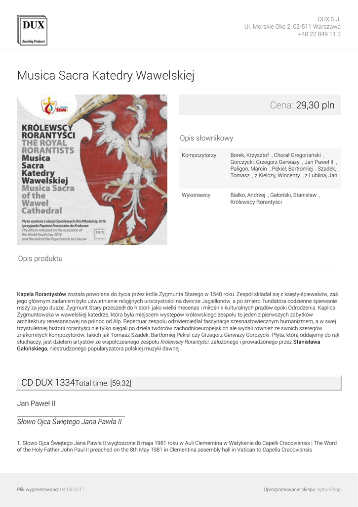 DUX S.J. Ul. Morskie Oko 2, 02-511 Warszawa +48 22 849 11 3 Musica Sacra Katedry Wawelskiej Cena: 29,30 pln Opis słownikowy Kompozytorzy Borek, Krzysztof ∎, Chorał Gregoriański ∎, Gorczycki, Grzegorz Gerwazy ∎, Jan Paweł II ∎, Paligon, Marcin ∎, Pękiel, Bartłomiej ∎, Szadek, Tomasz ∎, z Kielczy, Wincenty ∎, z Lublina, Jan ∎ Wykonawcy Białko, Andrzej ∎, Gałoński, Stanisław ∎, Królewscy Rorantyści ∎ Opis produktu Kapela Rorantystów została powołana do życia przez króla Zygmunta Starego w 1540 roku. Zespół składał się z księży-śpiewaków, zaś jego głównym zadaniem było uświetnianie religijnych uroczystości na dworze Jagiellonów, a po śmierci fundatora codzienne śpiewanie mszy za jego duszę. Zygmunt Stary przeszedł do historii jako wielki mecenas i miłośnik kulturalnych prądów epoki Odrodzenia. Kaplica Zygmuntowska w wawelskiej katedrze, która była miejscem występów królewskiego zespołu to jeden z pierwszych zabytków architektury renesansowej na północ od Alp. Repertuar zespołu odzwierciedlał fascynacje szesnastowiecznym humanizmem, a w swej trzystuletniej historii rorantyści nie tylko sięgali po dzieła twórców zachodnioeuropejskich ale wydali również ze swoich szeregów znakomitych kompozytorów, takich jak Tomasz Szadek, Bartłomiej Pękiel czy Grzegorz Gerwazy Gorczycki. Płyta, którą oddajemy do rąk słuchaczy, jest dziełem artystów ze współczesnego zespołu Królewscy Rorantyści, założonego i prowadzonego przez Stanisława Gałońskiego, niestrudzonego popularyzatora polskiej muzyki dawnej. CD DUX 1334Total time: [59:32] Jan Paweł II Słowo Ojca Świętego Jana Pawła II 1. Słowo Ojca Świętego Jana Pawła II wygłoszone 8 maja 1981 roku w Auli Clementina w Watykanie do Capelli Cracoviensis | The Word of the Holy Father John Paul II preached on the 8th May 1981 in Clementina assembly hall in Vatican to Capella Cracoviensis Plik wygenerowano: 04-03-2017 Oprogramowanie sklepu: AptusShop DUX S.J. Ul. Morskie Oko 2, 02-511 Warszawa +48 22 849 11 3 [11:33] /Chorał Gregoriański/ Rorate Caeli (chorał) 2. Rorate Caeli [05:09] Marcin Paligon Rorate Caeli 3. Rorate Caeli [03:15] Jan z Lublina Kyrie Fons Bonitatis 4. Kyrie Fons Bonitatis [00:57] Jan z Lublina Christe 5. Christe [01:39] Jan z Lublina Ultimum Kyrie 6. Ultimum Kyrie [01:23] Plik wygenerowano: 04-03-2017 Oprogramowanie sklepu: AptusShop DUX S.J. Ul. Morskie Oko 2, 02-511 Warszawa +48 22 849 11 3 Krzysztof Borek Kyrie i Gloria — „Missa Te Deum Laudamus” 7. Kyrie i Gloria — „Missa Te Deum Laudamus” [05:31] Jan z Lublina Patrem Sollemne 8. Patrem Sollemne [01:23] Krzysztof Borek Credo — „Missa Te Deum laudamus” 9. Credo — „Missa Te Deum laudamus” [04:58] Jan z Lublina Date Siceram Moerentibus 10. Date Siceram Moerentibus [03:05] Krzysztof Borek Sanctus 11. Sanctus [02:16] Jan z Lublina Plik wygenerowano: 04-03-2017 Oprogramowanie sklepu: AptusShop DUX S.J. Ul. Morskie Oko 2, 02-511 Warszawa +48 22 849 11 3 Tantum Ergo Sacramentum 12. Tantum Ergo Sacramentum [02:47] Bartłomiej Pękiel Benedictus — „Missa pulcherrima” 13. Benedictus — „Missa pulcherrima” [02:46] Tomasz Szadek Agnus Dei — „Officium in melodiam motetae Pisneme” 14. Agnus Dei — „Officium in melodiam motetae Pisneme” [03:14] Jan z Lublina Non Mortui Laudabunt Te Domine 15. Non Mortui Laudabunt Te Domine [01:01] Jan z Lublina De Profundis Clamavi 16. De Profundis Clamavi [01:30] Grzegorz Gerwazy Gorczycki Sepulto Domino Plik wygenerowano: 04-03-2017 Oprogramowanie sklepu: AptusShop DUX S.J. Ul. Morskie Oko 2, 02-511 Warszawa +48 22 849 11 3 17. Sepulto Domino [02:35] Jan z Lublina Salve Regina 18. Salve Regina [01:04] Wincenty z Kielczy Gaude Mater Polonia 19. Gaude Mater Polonia opr. / arr. Teofil Klonowski [03:23] Wykonawcy: Królewscy Rorantyści Andrzej Białko /organy/ Stanisław Gałoński /dyrygent/ Plik wygenerowano: 04-03-2017 Powered by TCPDF (www.tcpdf.org) Oprogramowanie sklepu: AptusShop